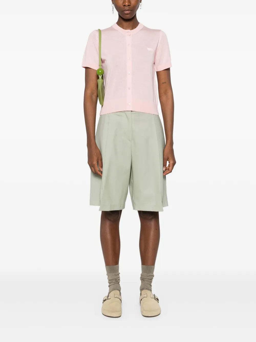pink pink button front closure, ribbed cuffs and hem, crew neck, short sleeves