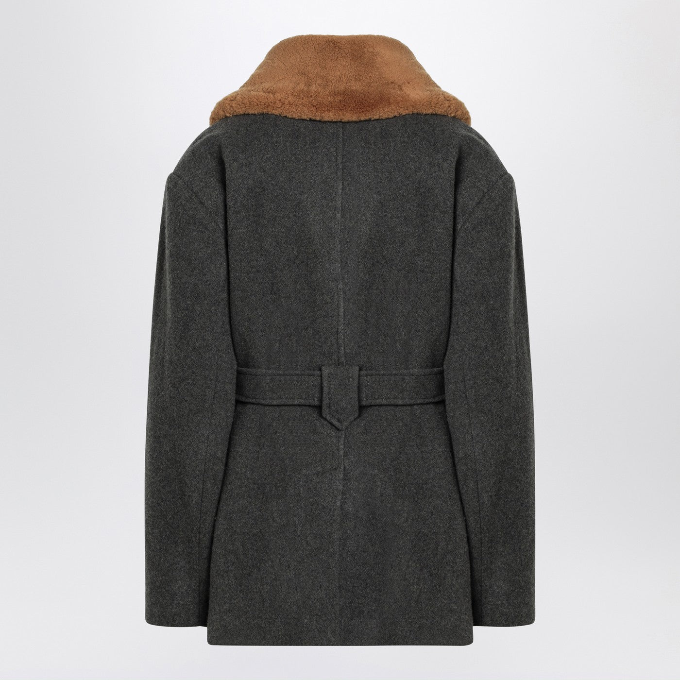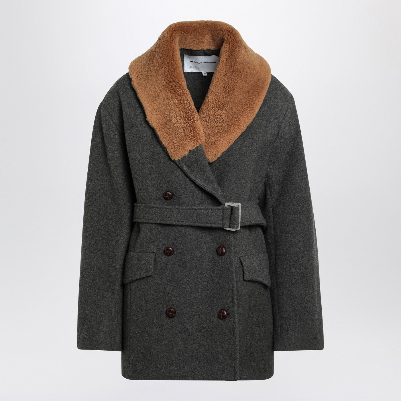 Wool-blend coat by Margaux Lonnberg featuring a shearling collar, a double-breasted design with front buttons, a matching waist belt, side flap pockets and a central back vent.