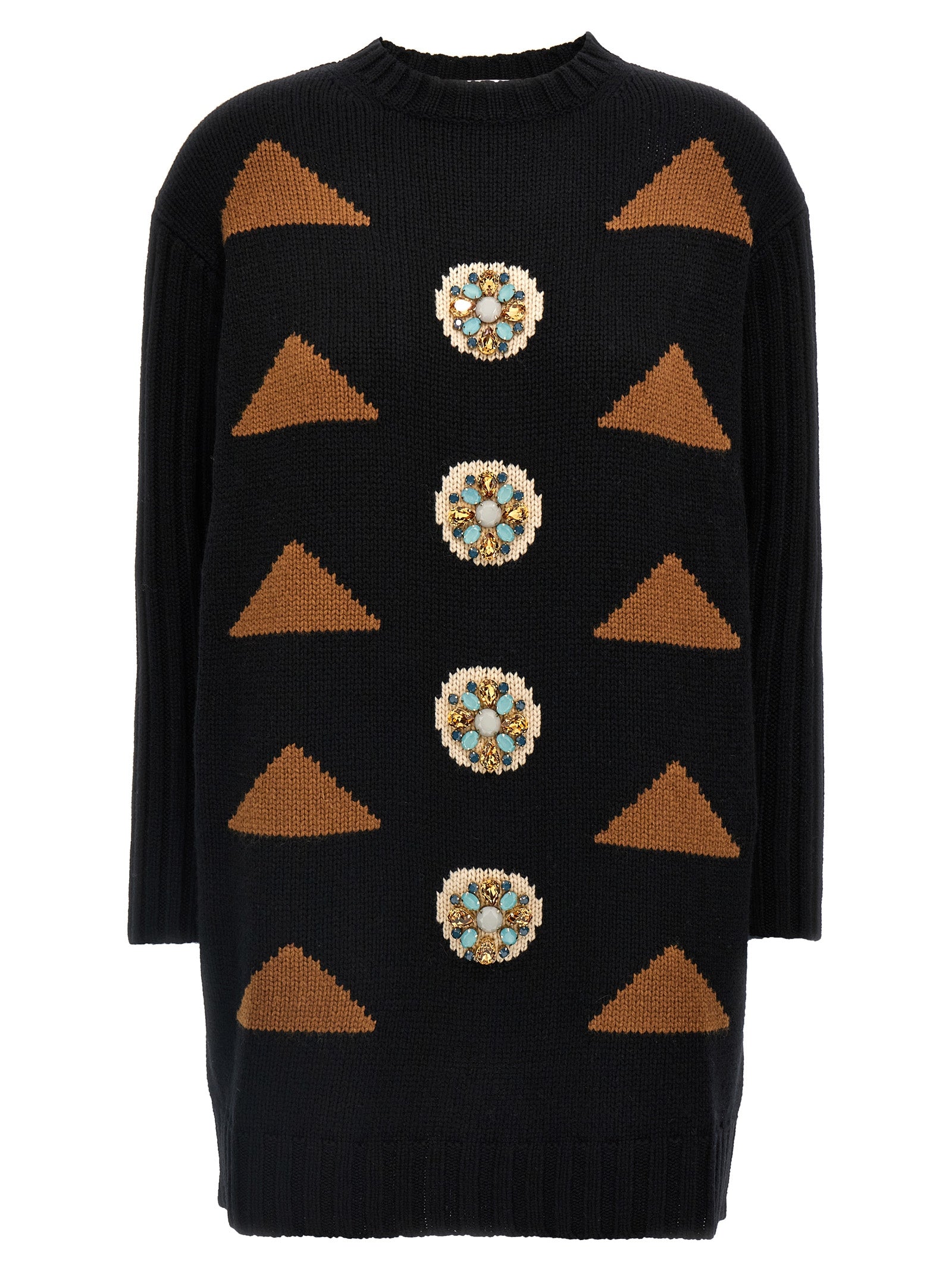 Mini 'Maracas' dress in wool and cashmere yarn worked in shaved stitch with contrast inlaid pattern and front stone and crystal decoration, crew neck, long ribbed sleeves.