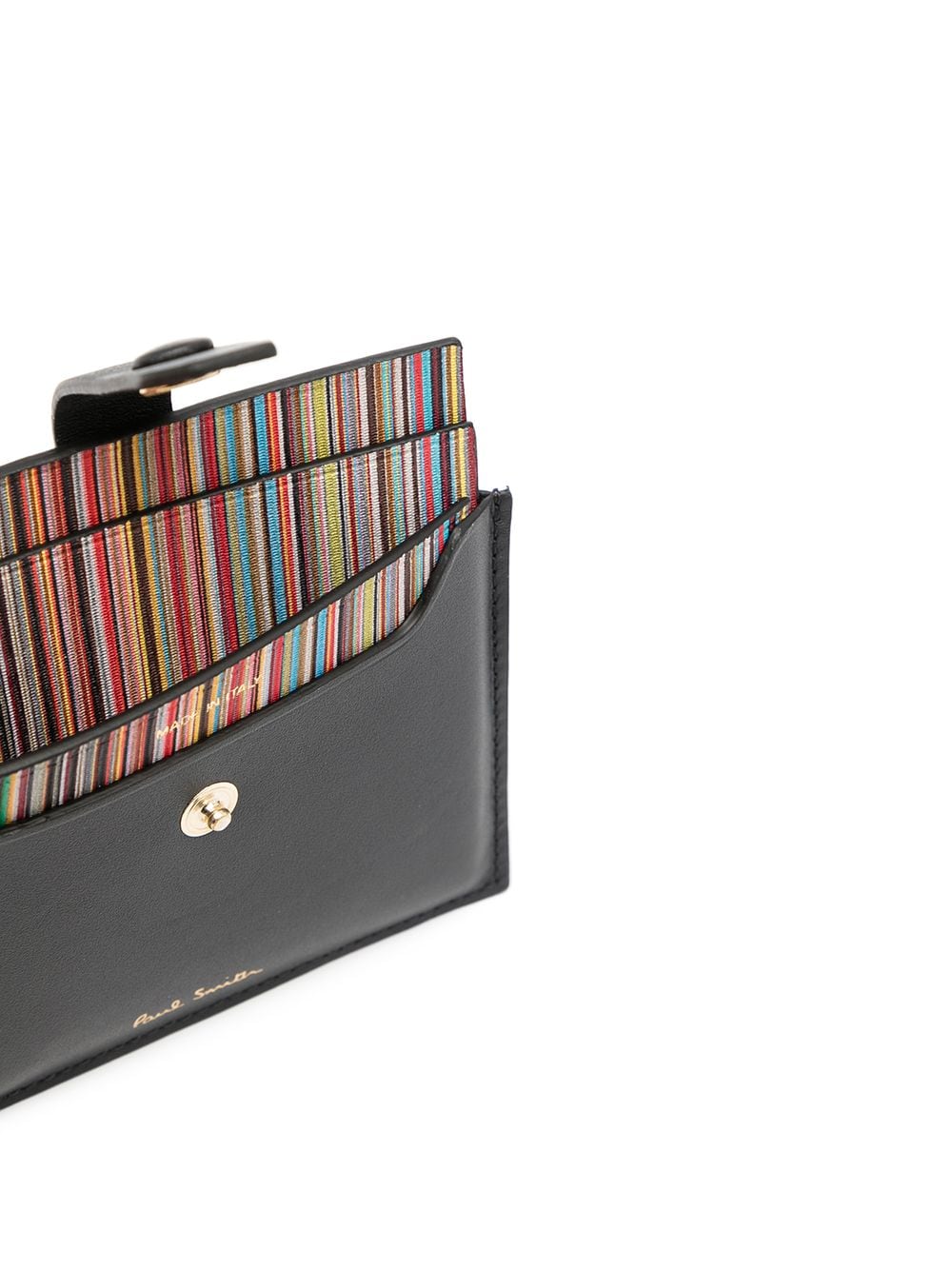 Black leather Signature stripe pull out card holder from PAUL SMITH featuring rainbow stripe detailing, embossed logo to the front, press-stud fastening and card slots.