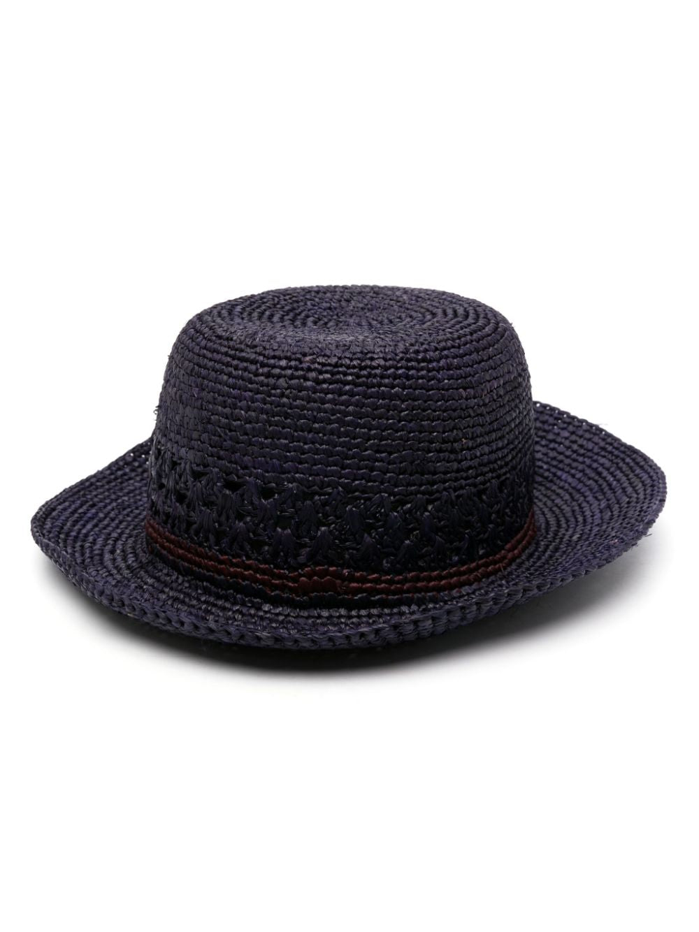 navy blue/brown straw woven wicker design stripe detailing flat crown bumper brim
