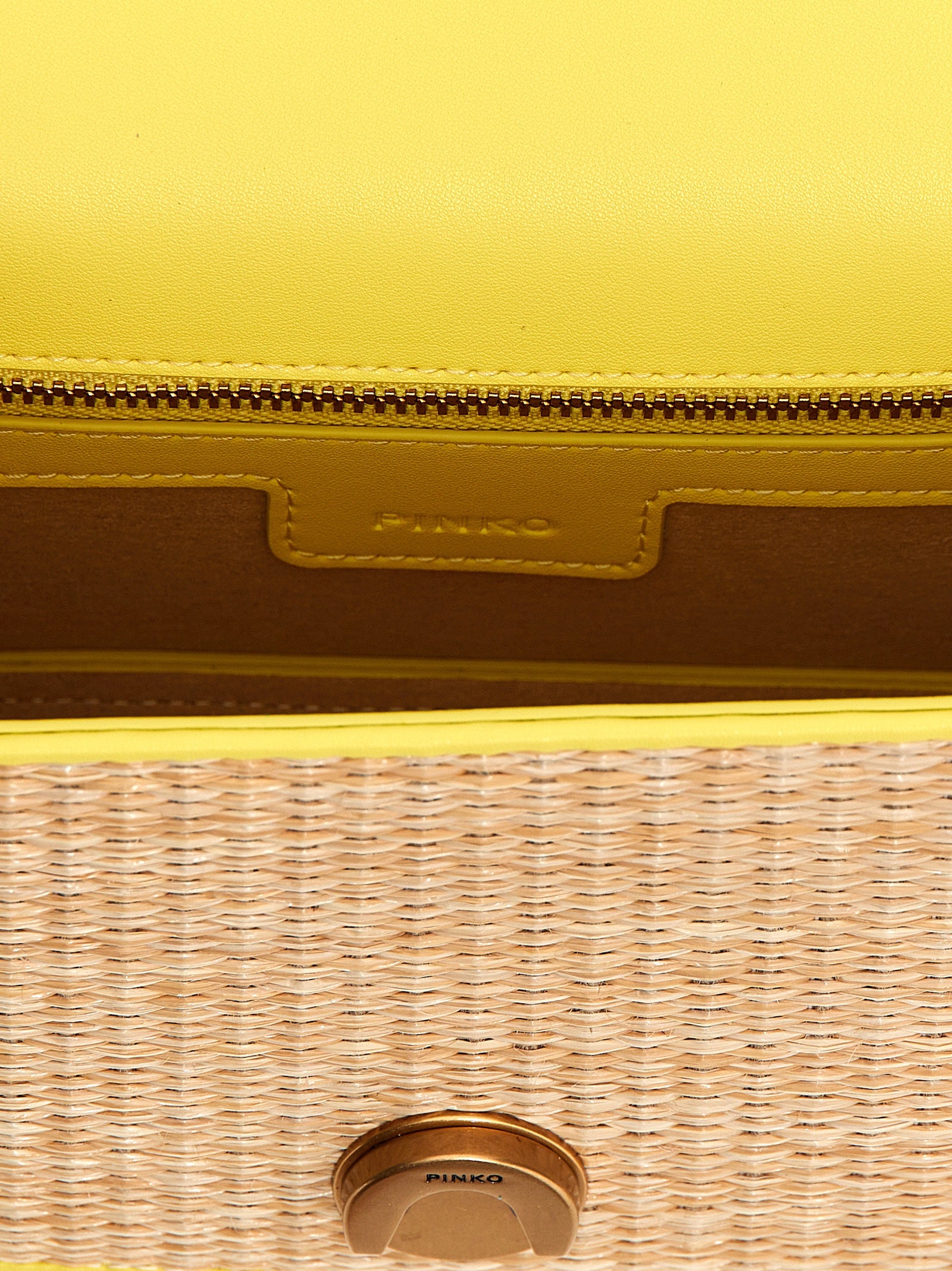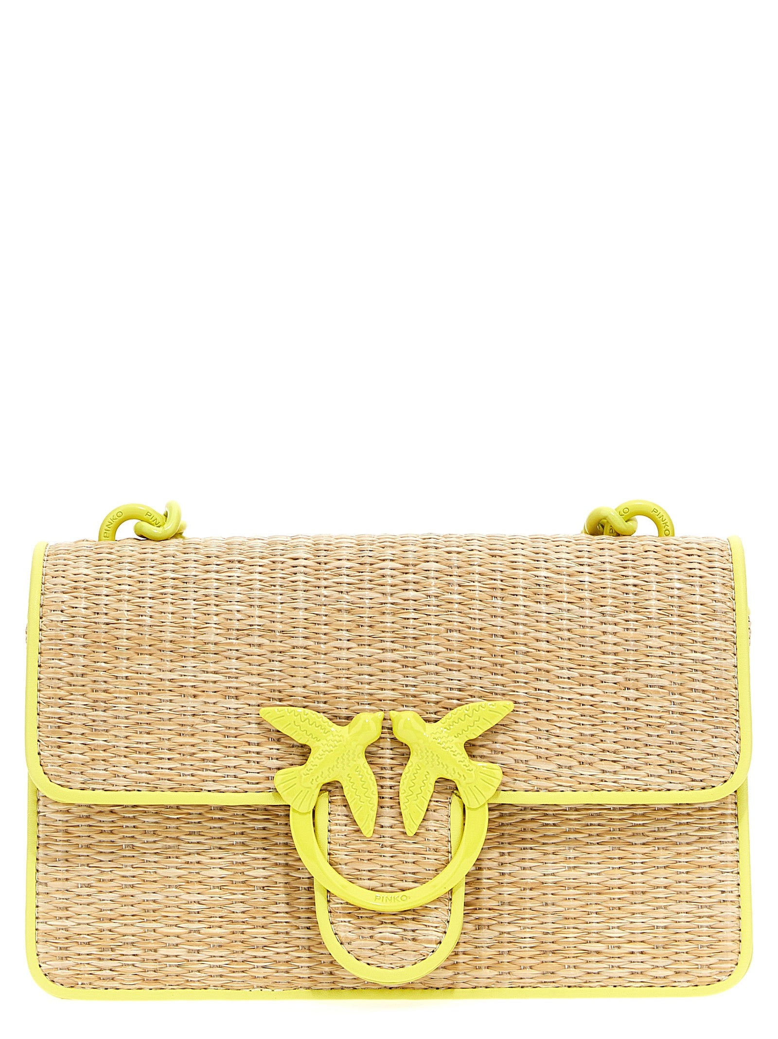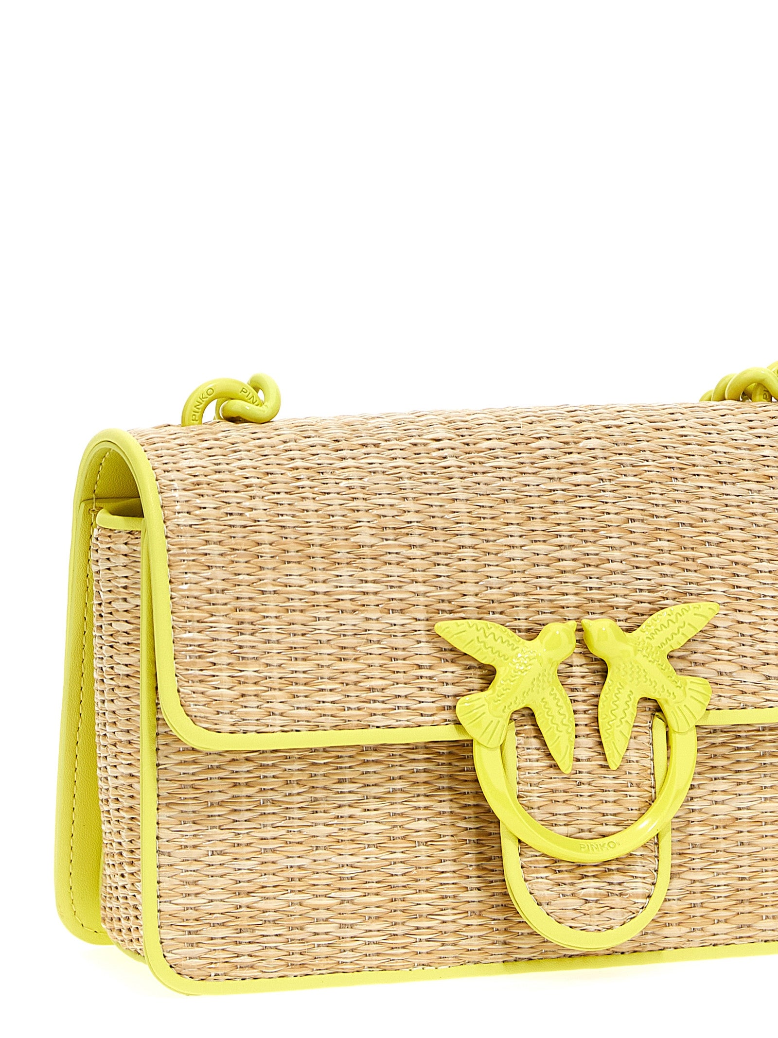 'Mini Love Bag Light' raffia and leather crossbody bag, magnetic flap closure with logo detail, adjustable chain and leather shoulder strap.
