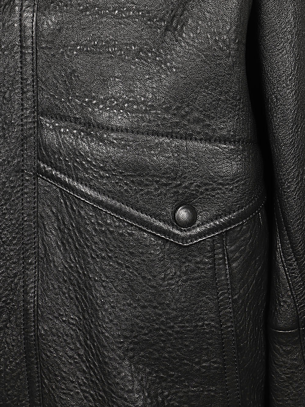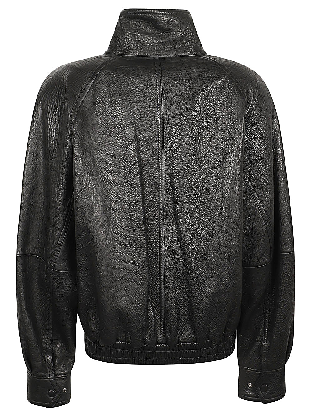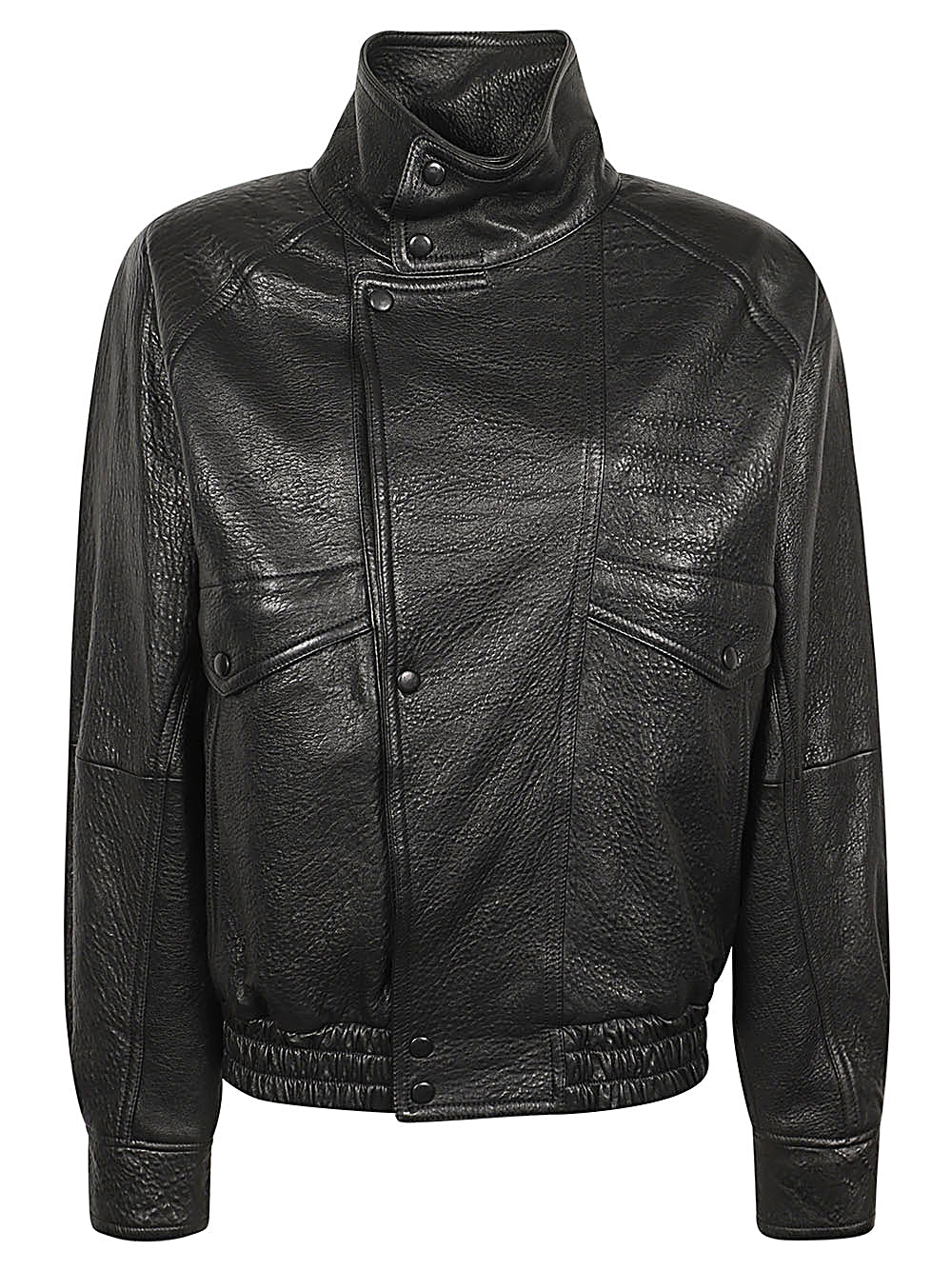 Black jacket with high collar, long sleeves, highlighted stitching, two pockets with press studs on the front, hidden zip closure and press studs.