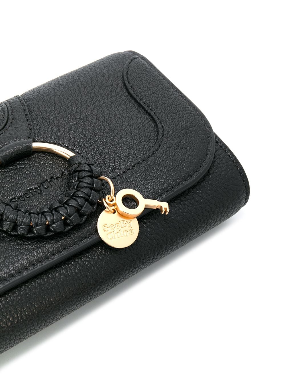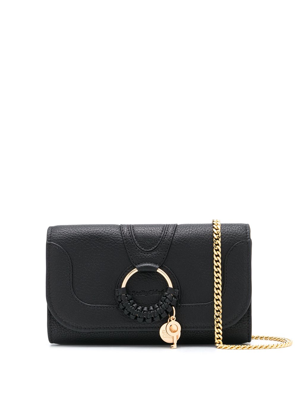 Black leather Hana chain wallet bag from See By Chloé featuring rectangle body, pebbled texture, debossed logo, charm detail, detachable chain-link shoulder strap, foldover top with magnetic fastening, main compartment, internal zip-fastening pocket and internal card slots.