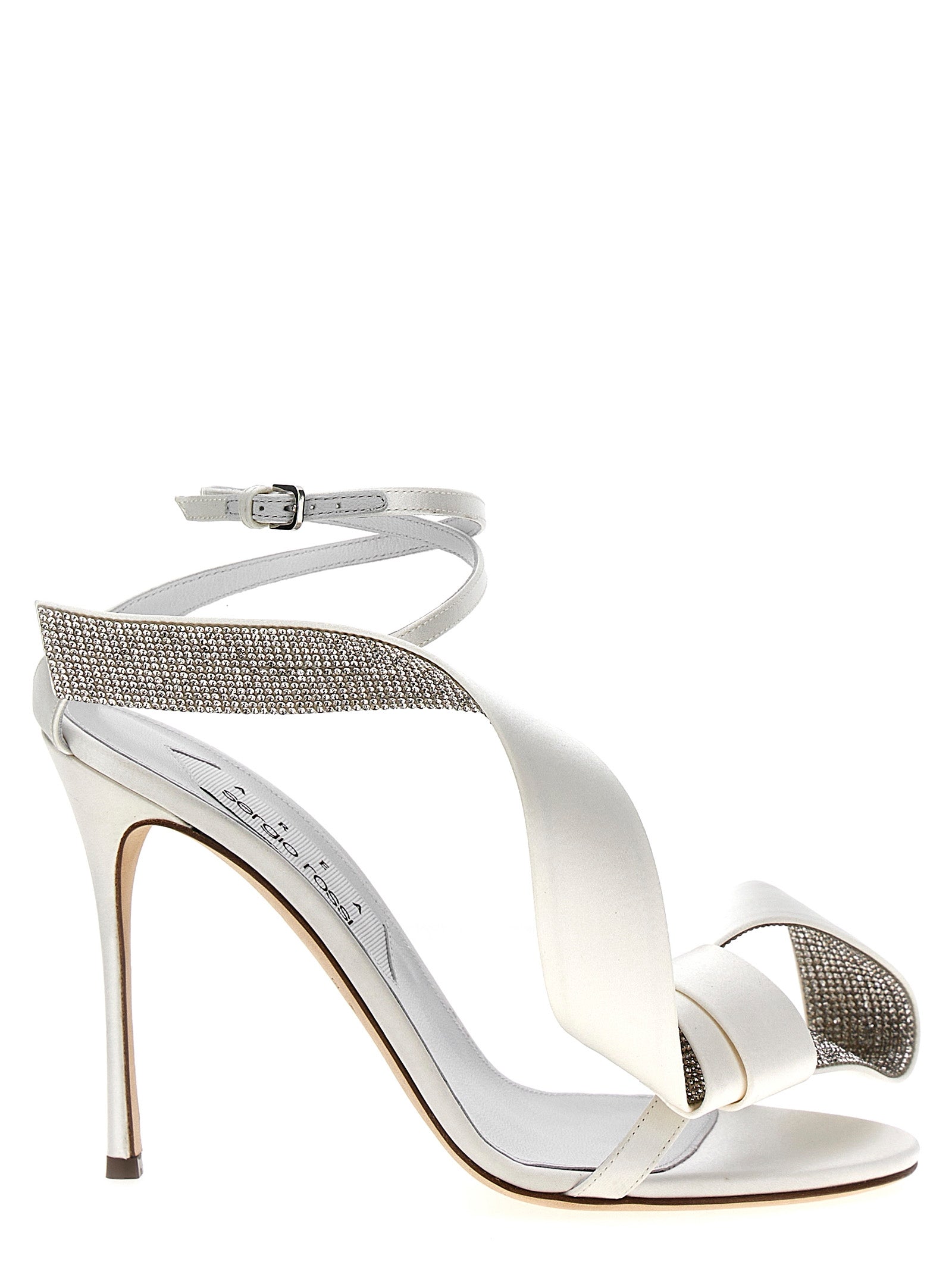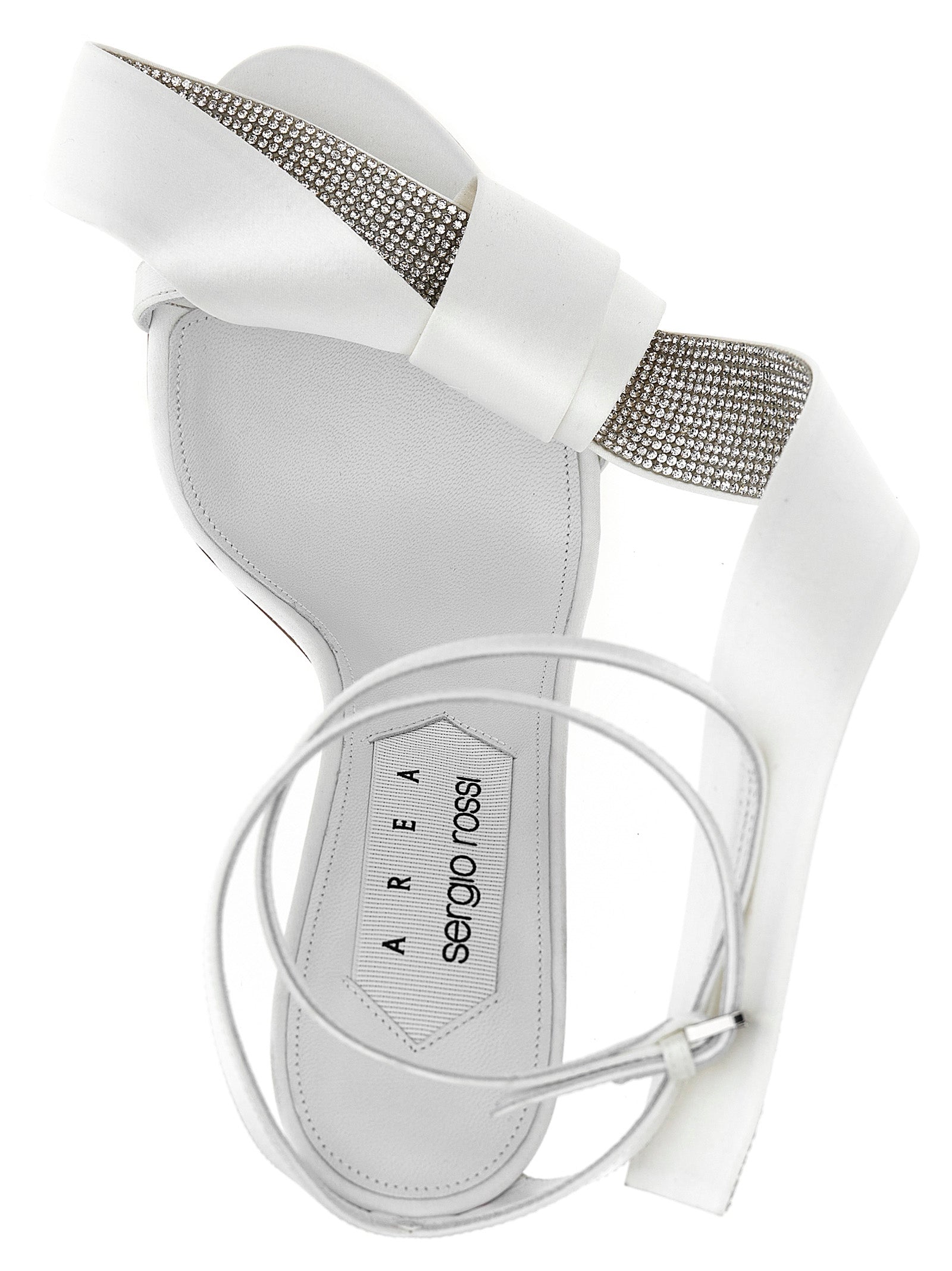 Sergio Rossi x AREA 'Area Marquise' satin sandals with maxi bow and crystal appliqué, ankle strap, stiletto heel.