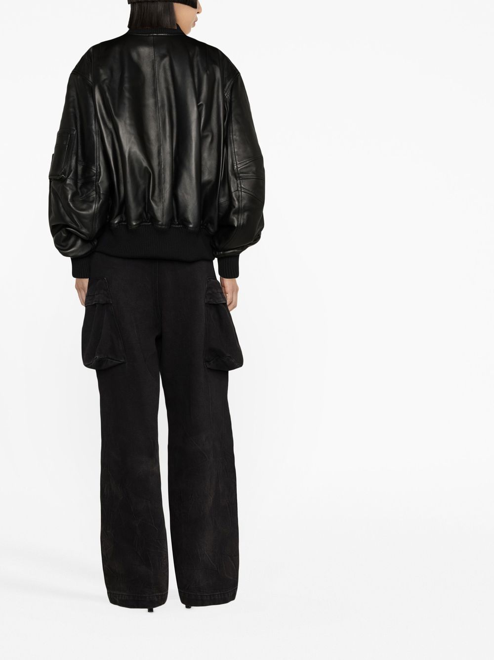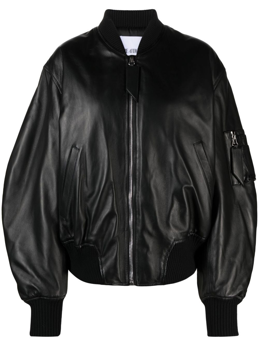 leather bomber jacket from The Attico featuring black, lambskin, ribbed band collar, front zip fastening, two front welt pockets, long sleeves, sleeve zip pocket and ribbed trim.