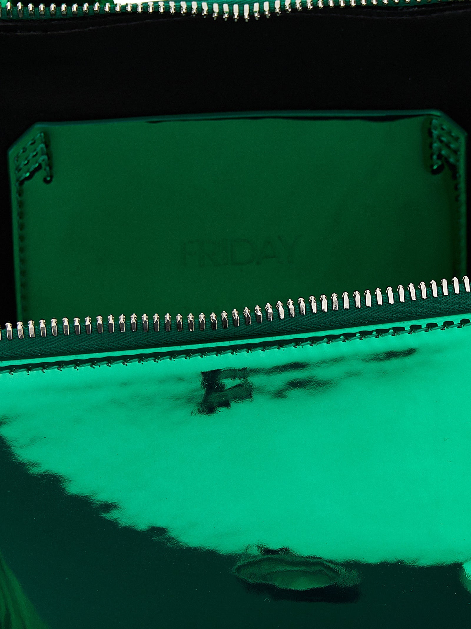 Friday' handbag in mirror material with top handle, zip closure, removable shoulder strap also used as a belt and a front logo print.