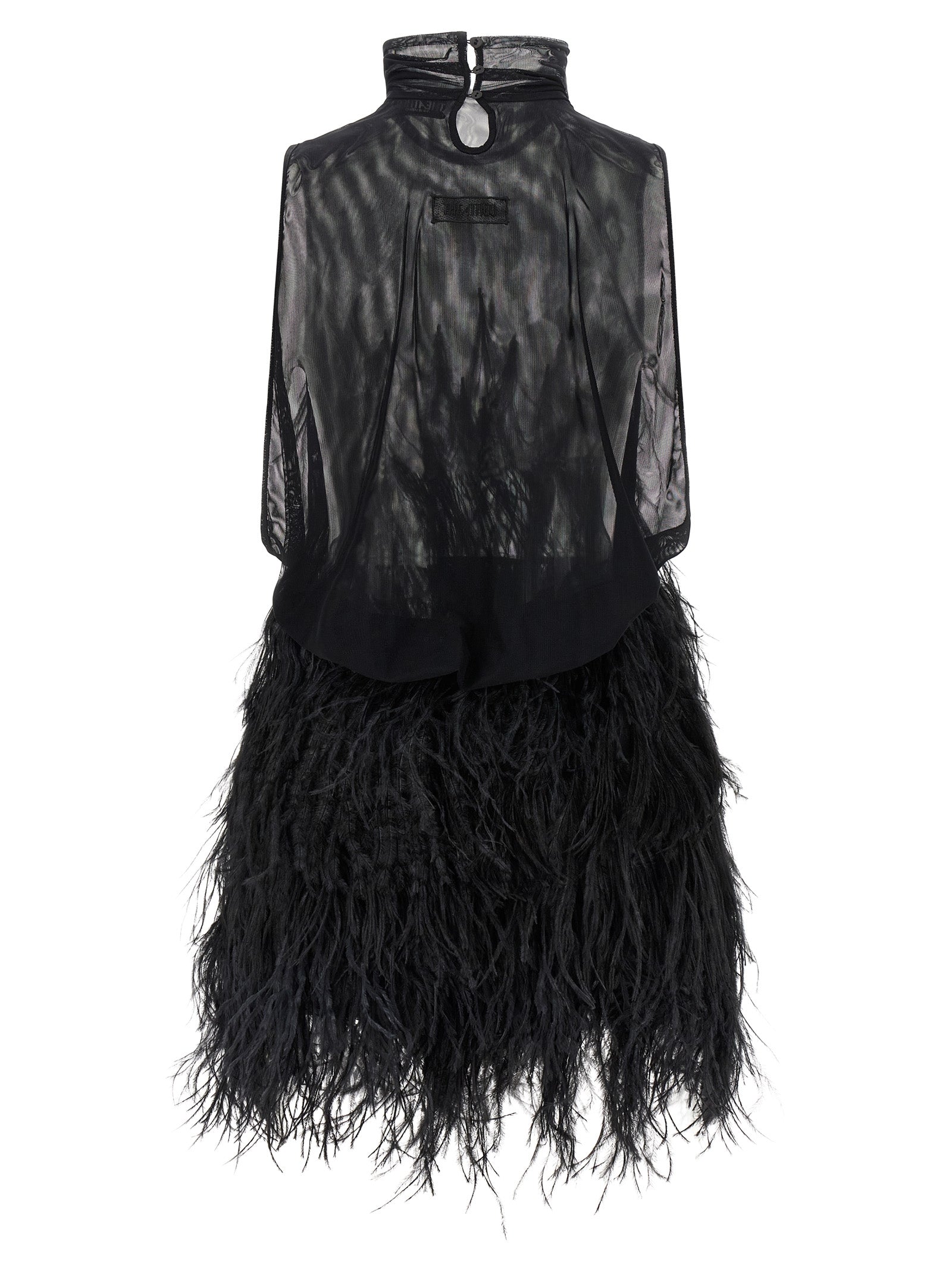 Mini dress in semi-transparent tulle with ostrich feather application, high neck, sleeveless, underskirt, side zip closure, back logo patch.