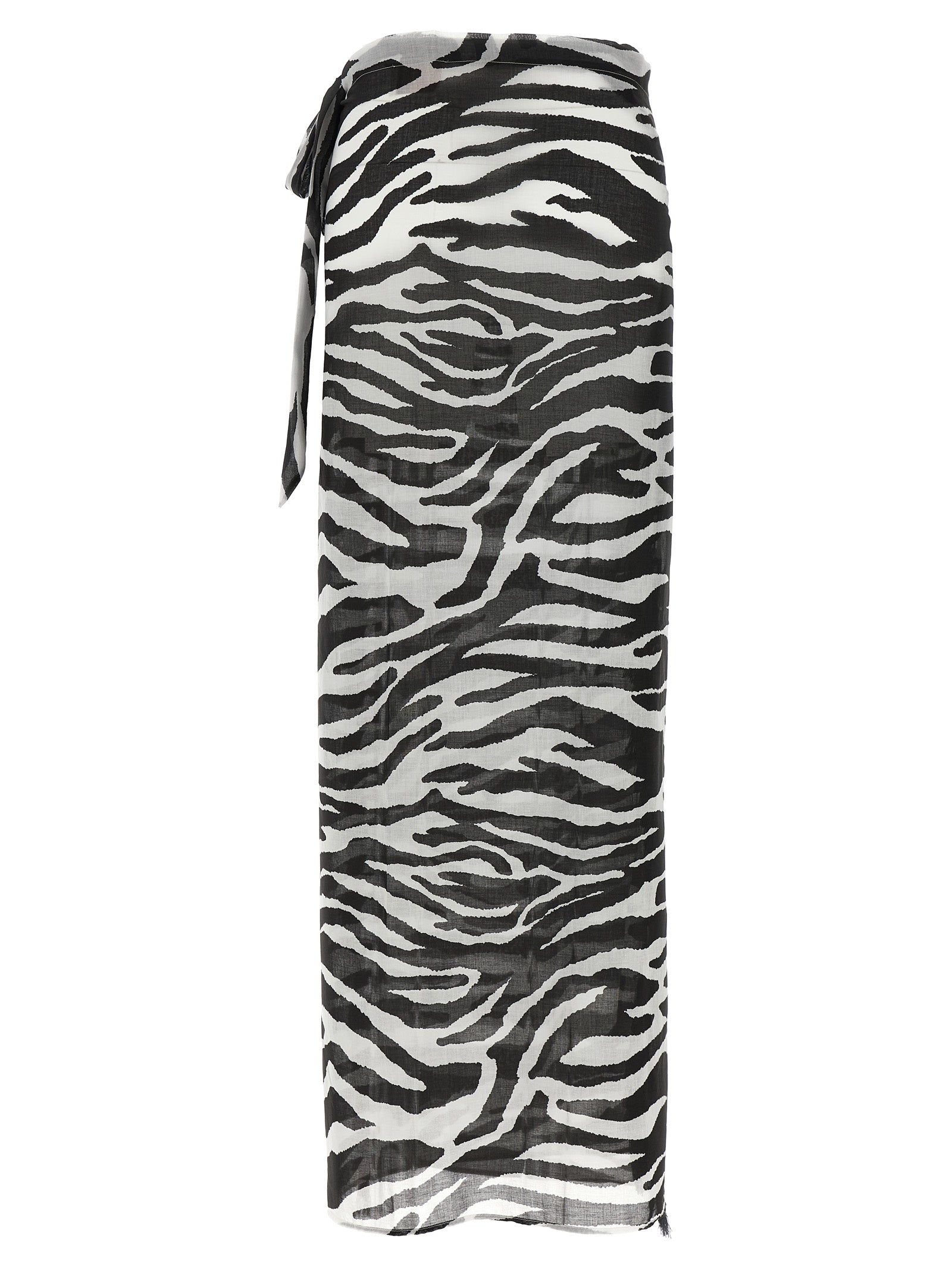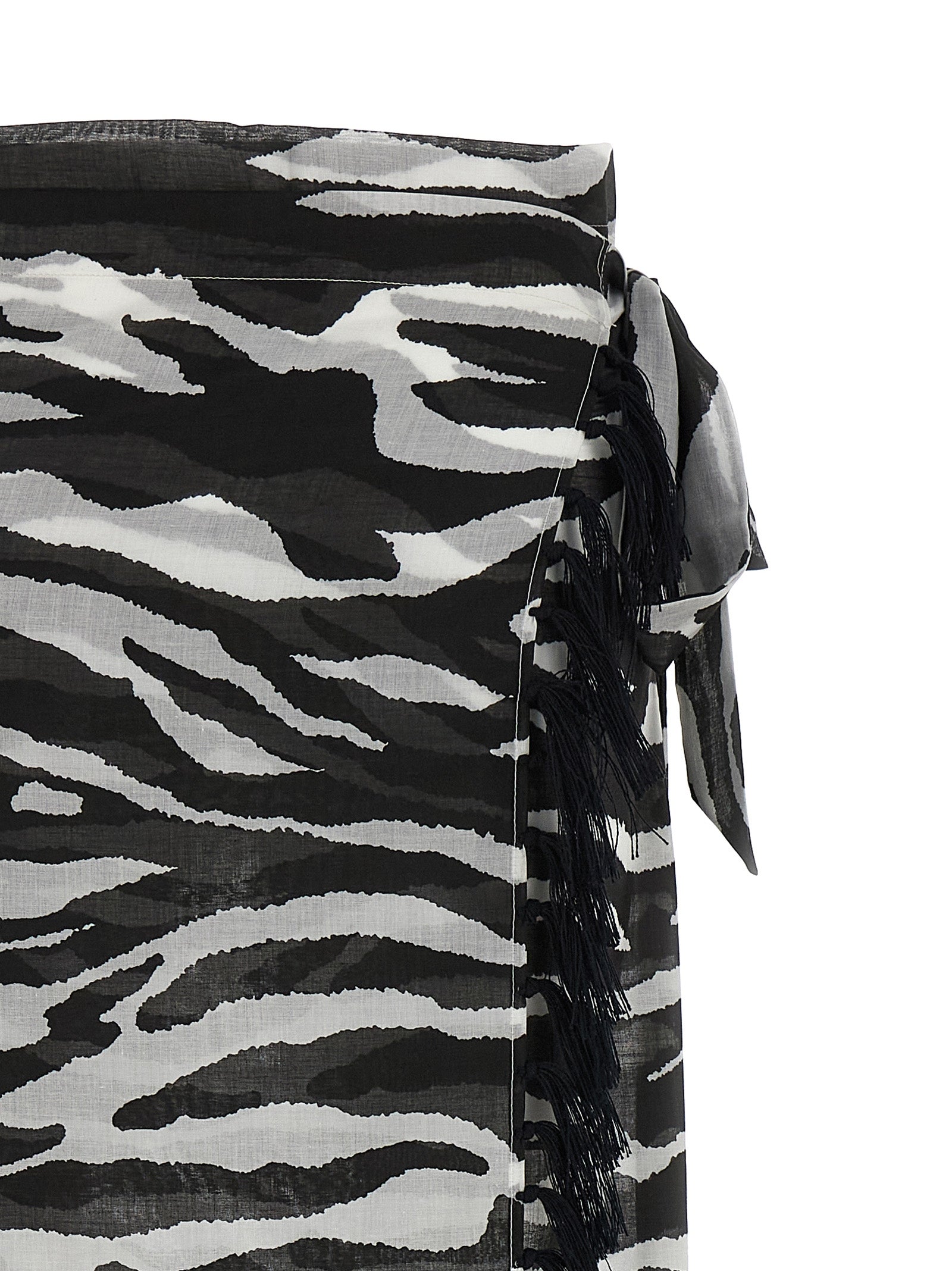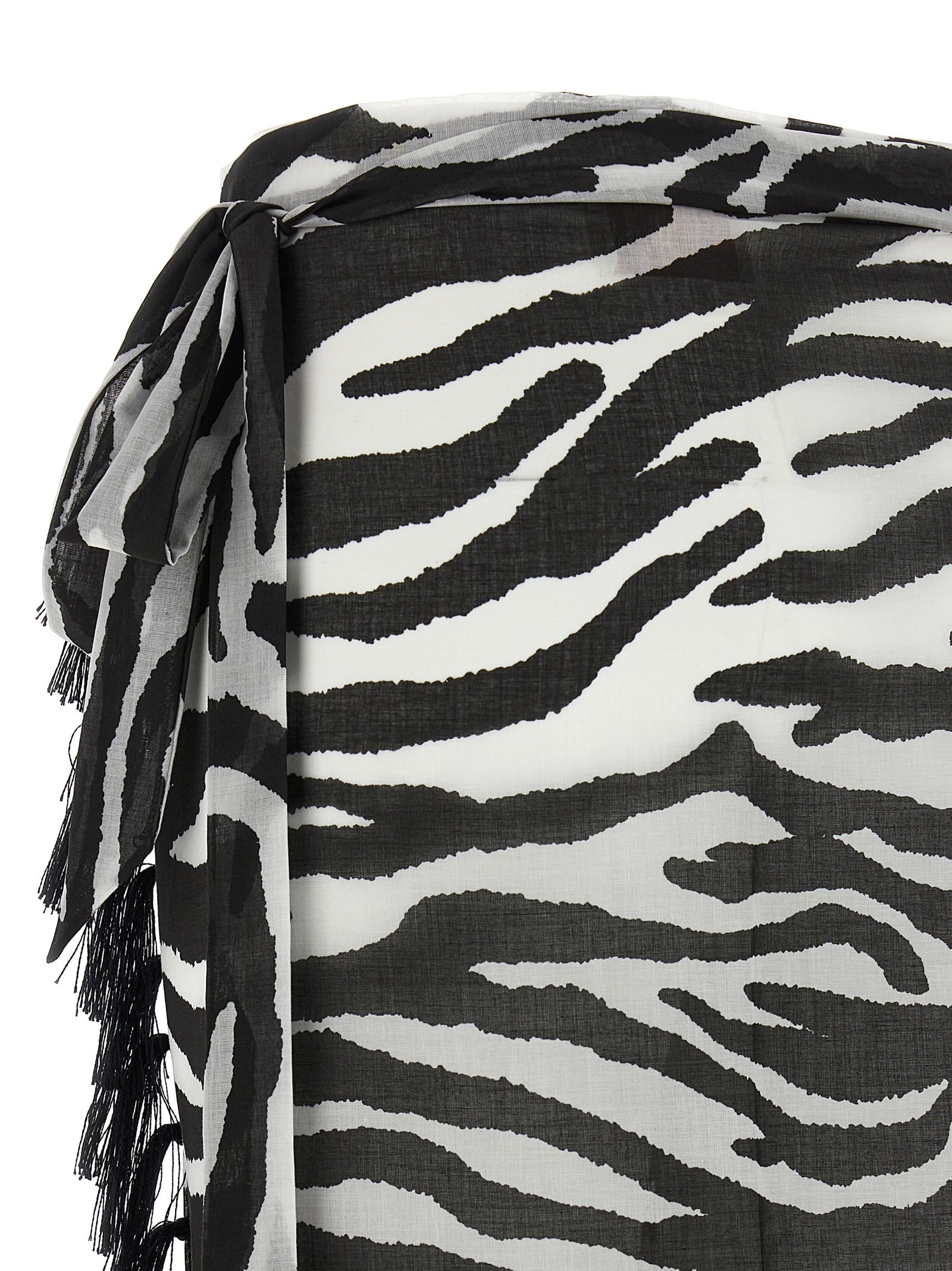 Long cotton muslin sarong with zebra print, side fringes, adjustable knot closure at the waist.