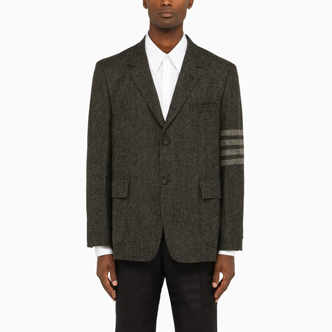 Dark grey wool single-breasted jacket by Thom Browne, featuring button closure, two flap pockets and a front welt pocket.