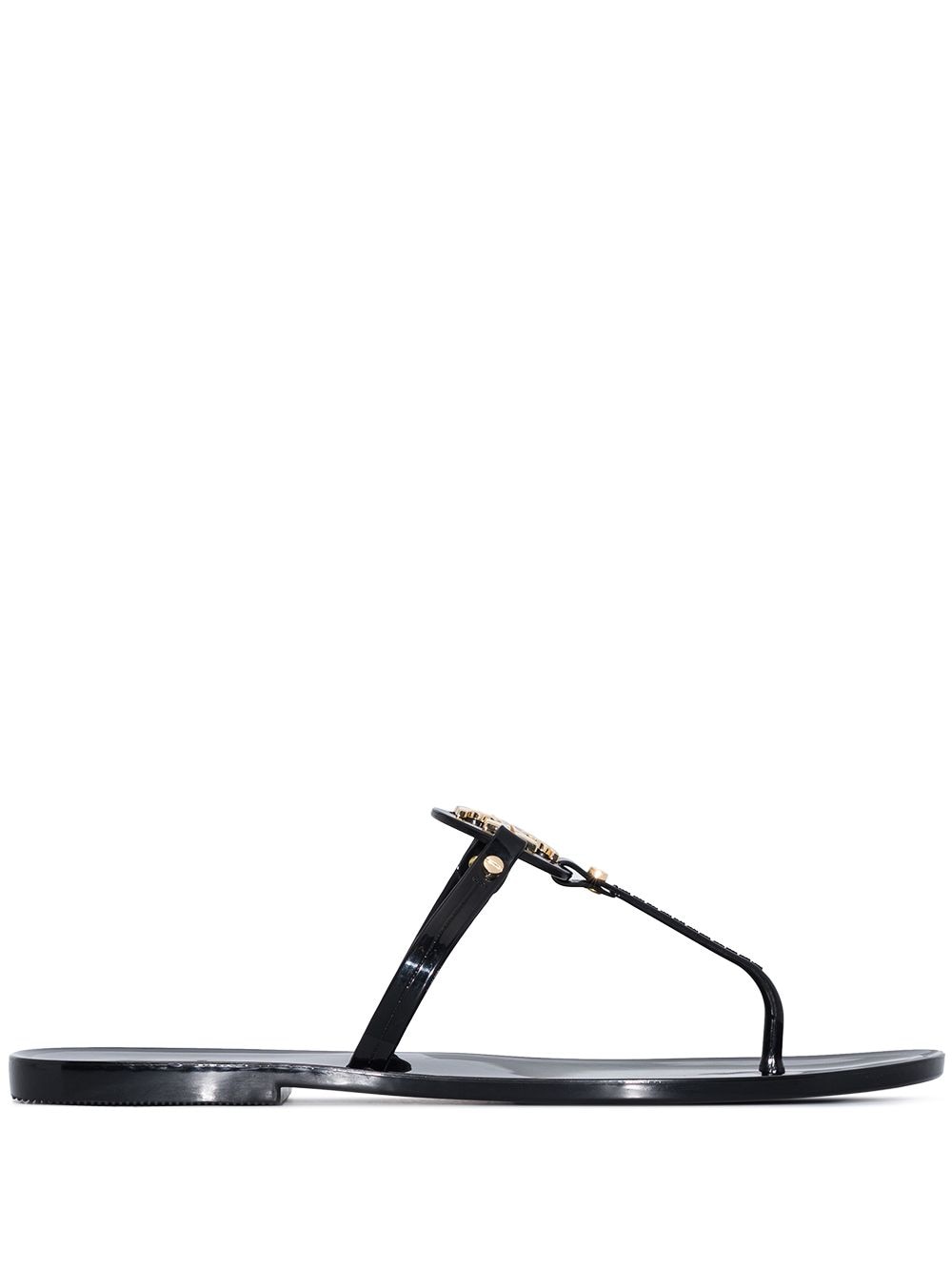 black gold-tone logo plaque gold-tone stud detailing thong strap slip-on style flat rubber sole