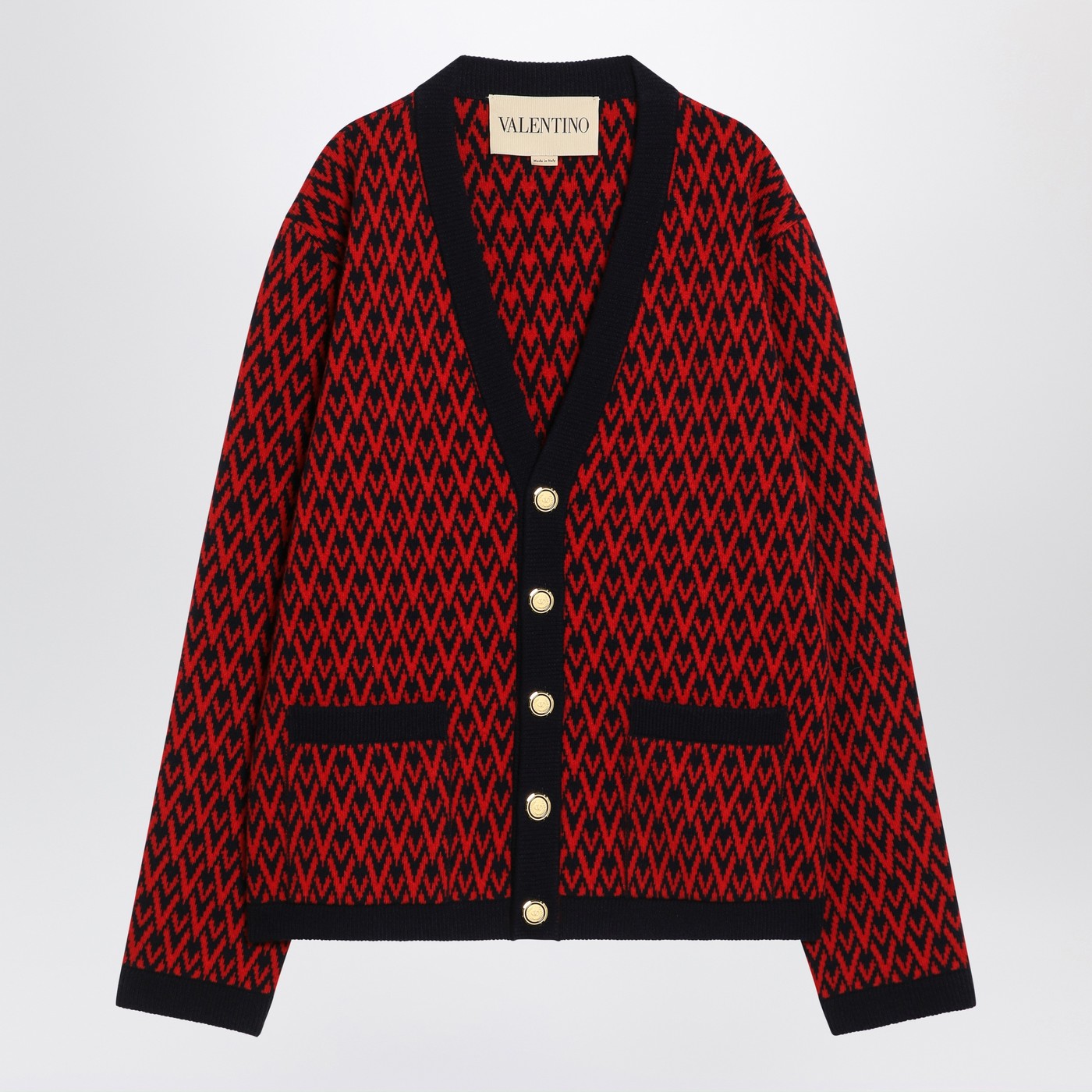 Valentino cardigan in virgin wool with Toute la V jacquard pattern all over in red and navy blue, featuring a V-neck, long sleeves, front closure with golden buttons, two front pockets, ribbed edges, and regular fit.
