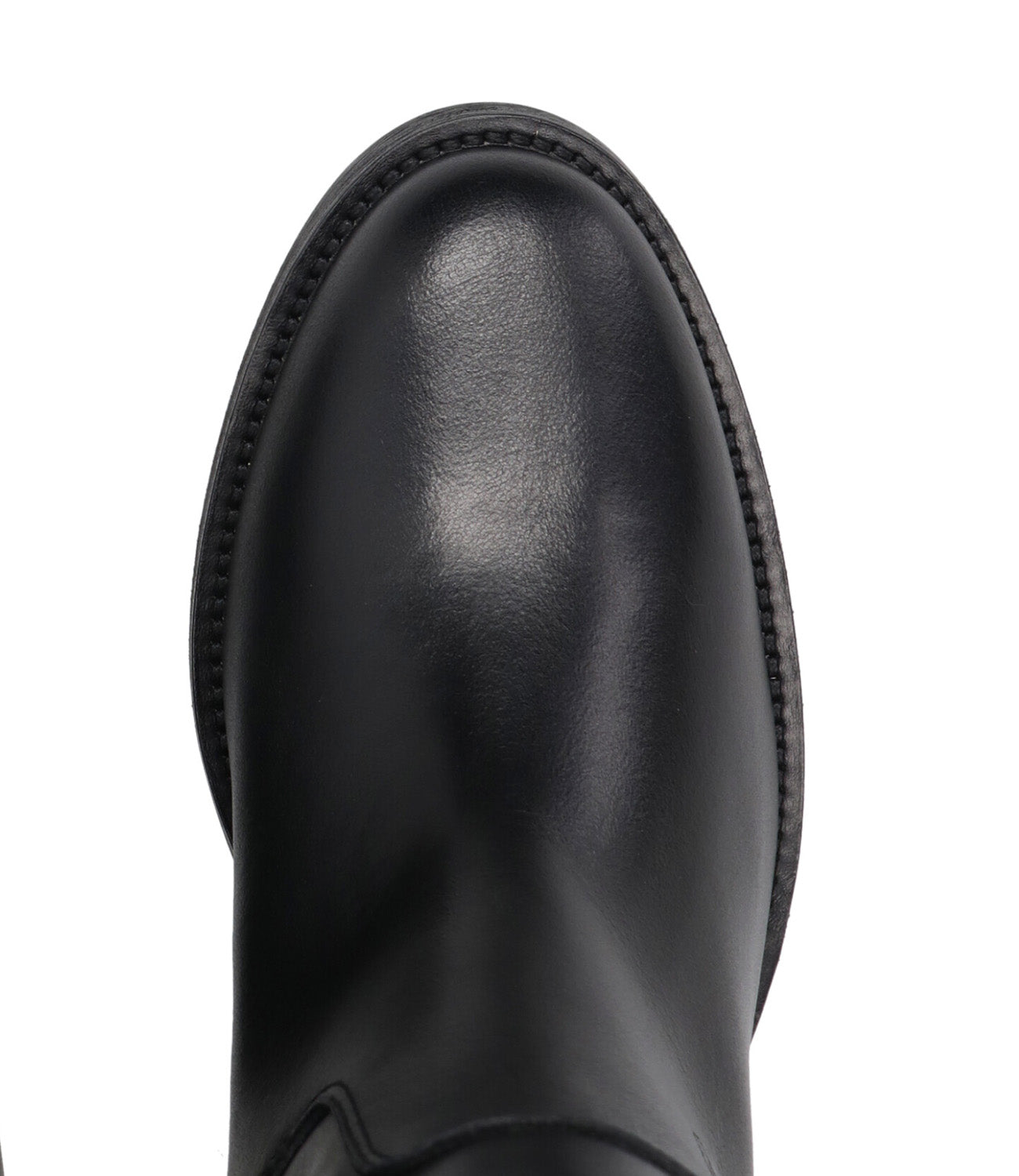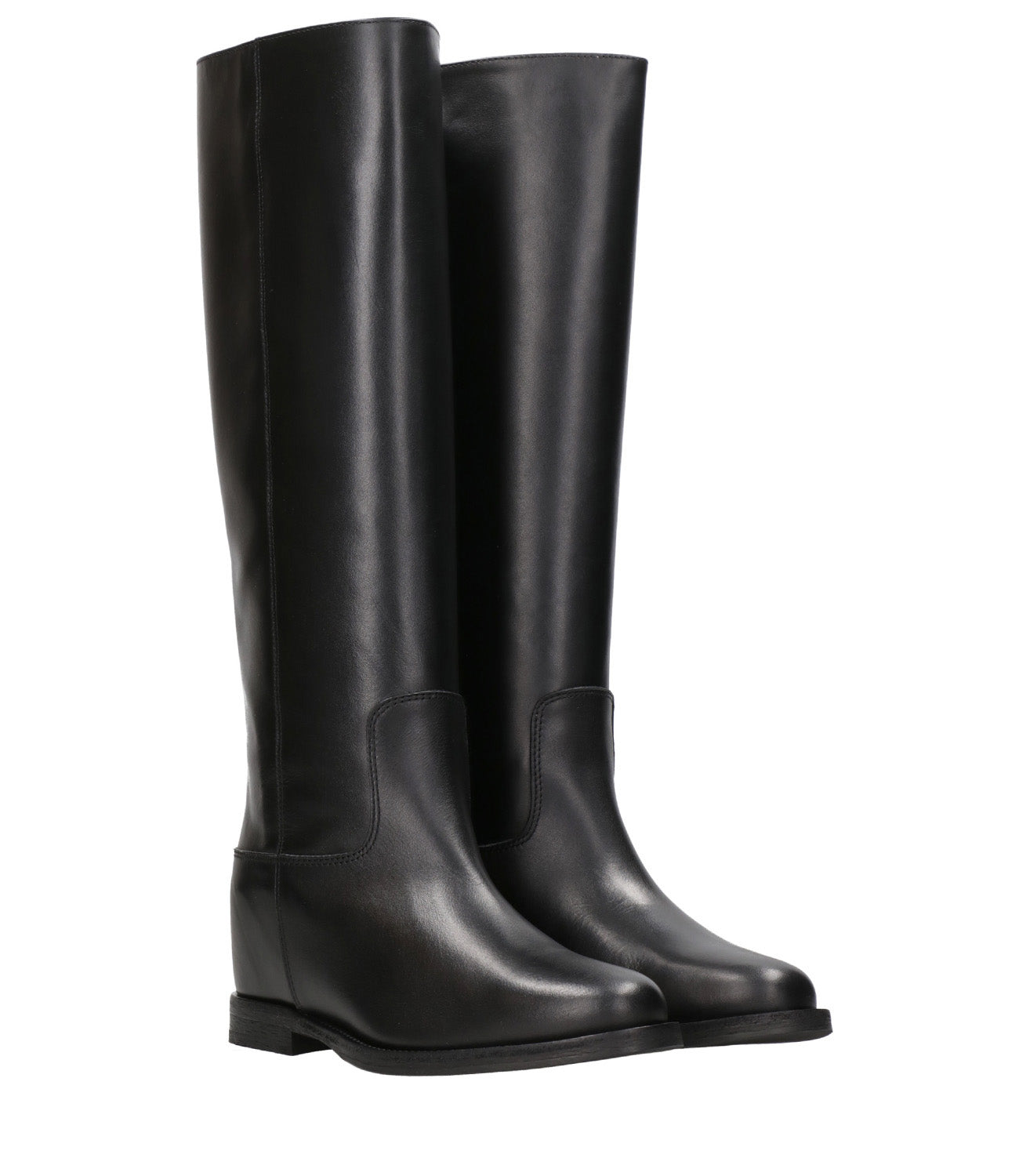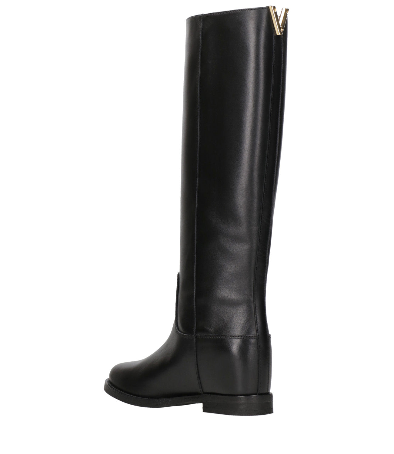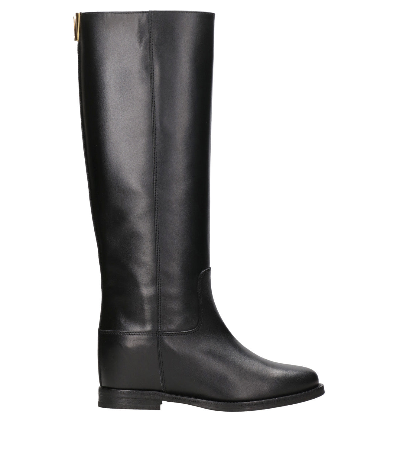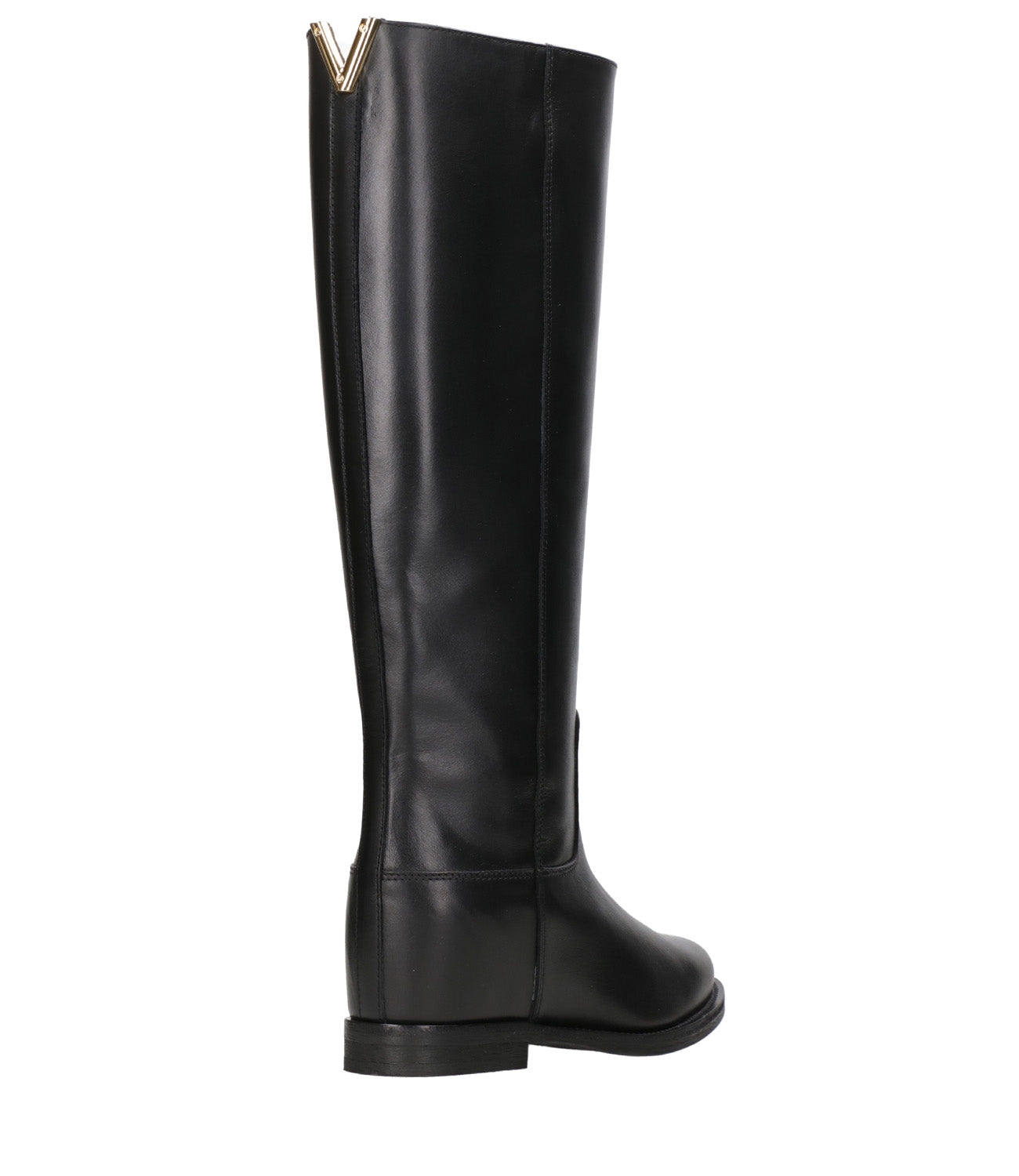 - Smooth leather - Almond toe - Tubular high leg - Detail at back on top edge with metal V - Sole and heel made in layers - 8cm internal wedge - Made in Italy
