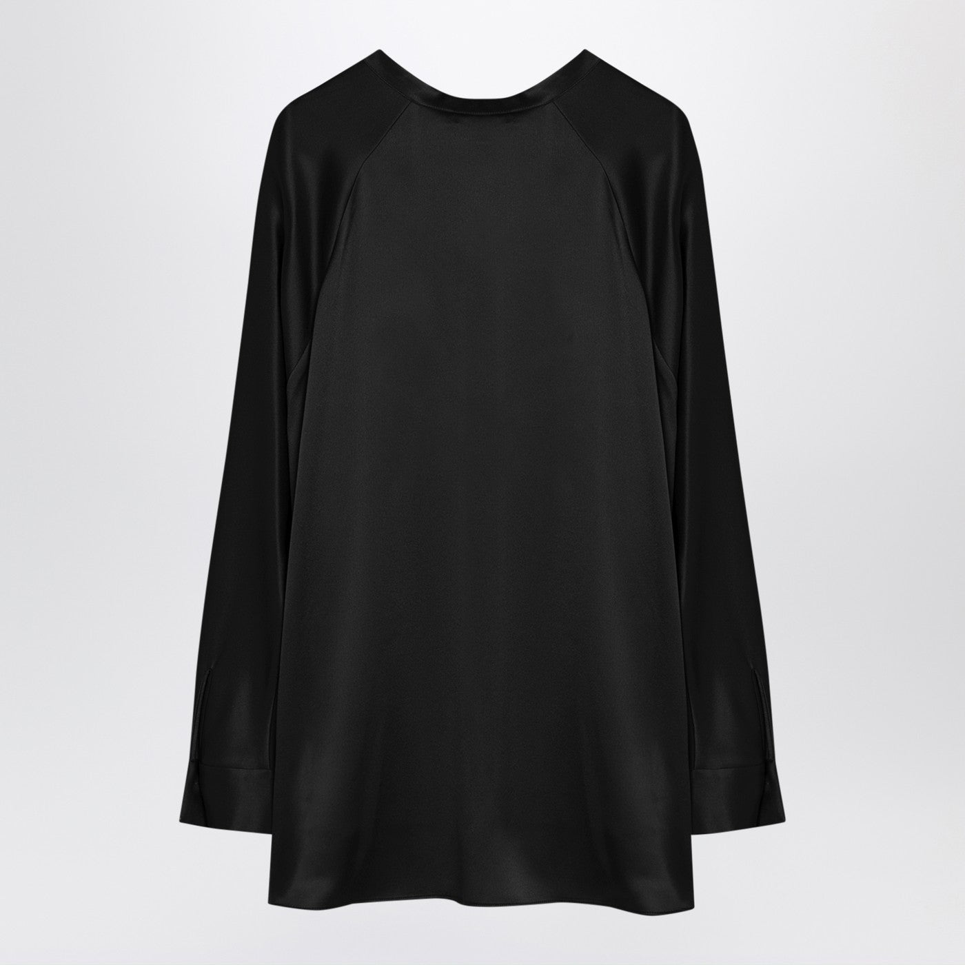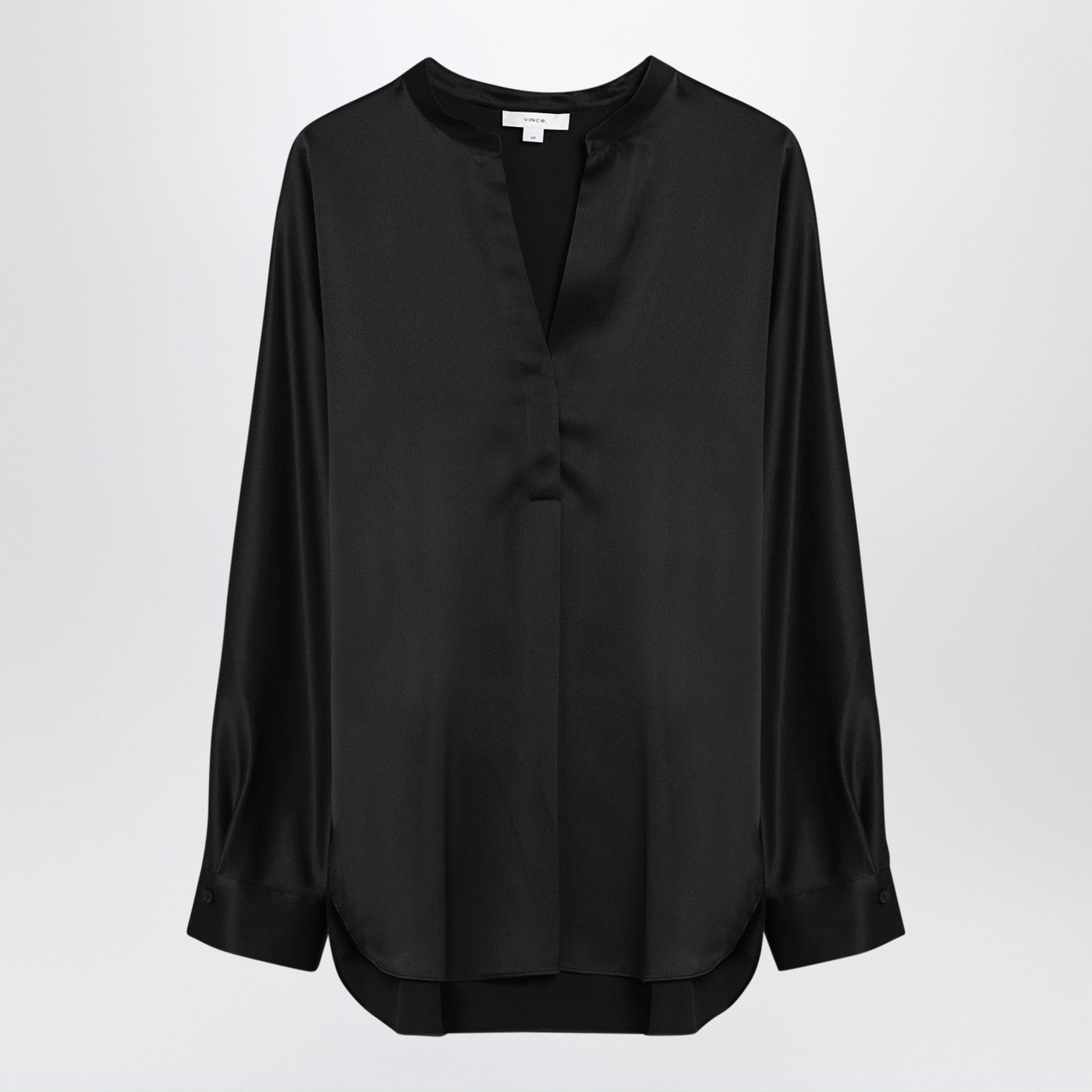 Black silk blouse from Vince featuring a mandarin collar, V-neck, long sleeves and button cuffs.
