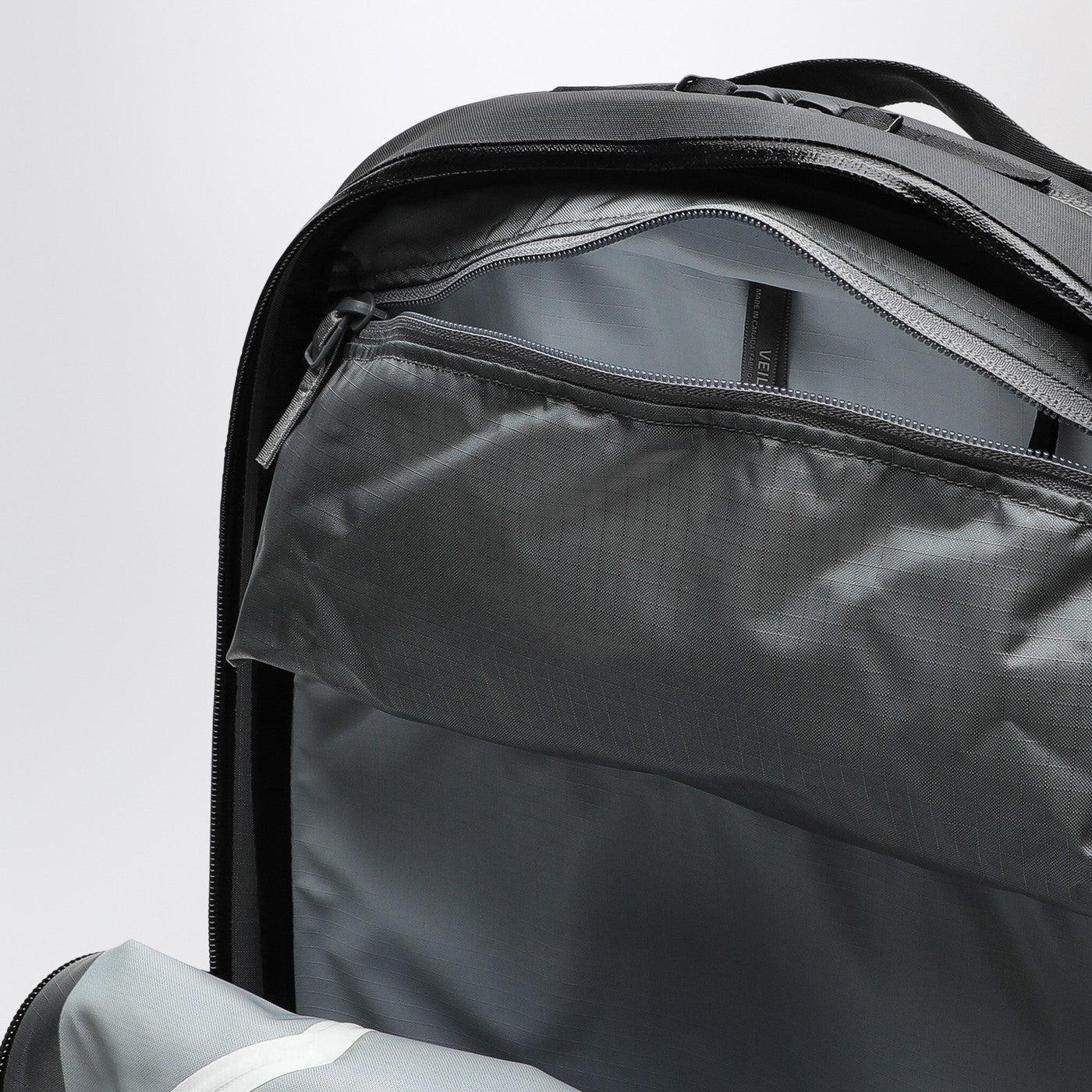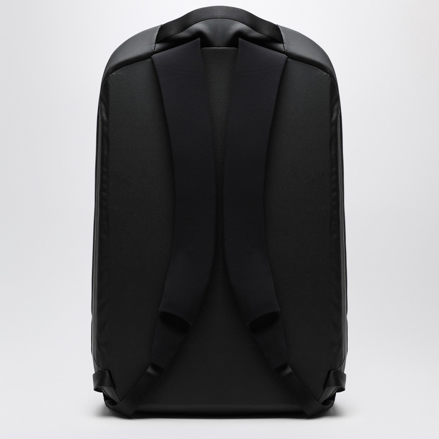 Medium backpack by Arc'teryx Veilance in black waterproof nylon, featuring taped seams, laminated and adjustable shoulder straps, top handle, two-way zip closure, inner compartment with zipped pocket.