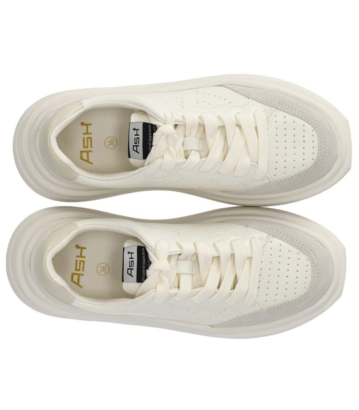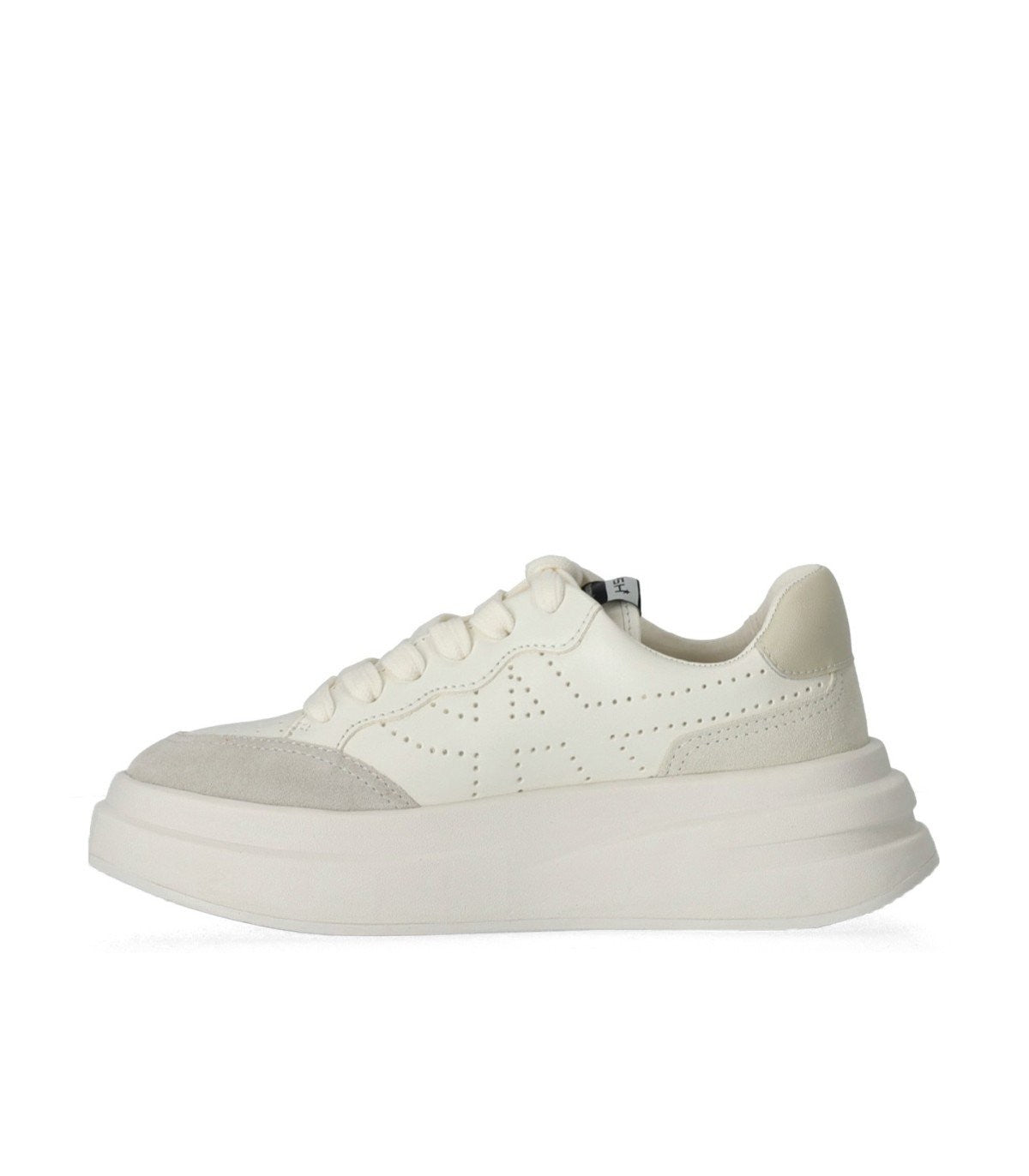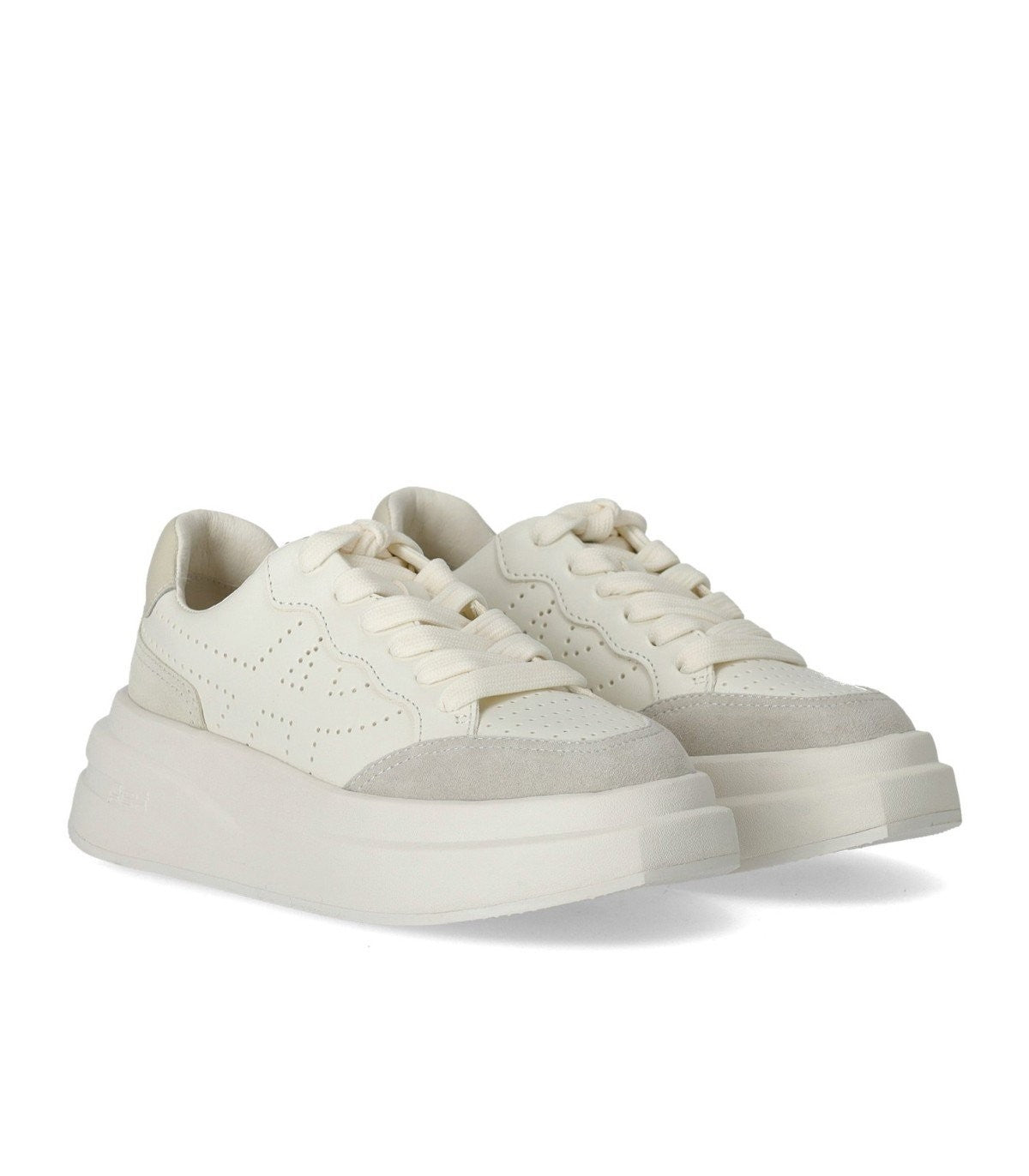 Ash Sneaker Impuls made of white leather, with suede inserts and light gray leather heel. Perforated toe and sides, soft leather insole and rubber platform sole. Height 5.5 cm.