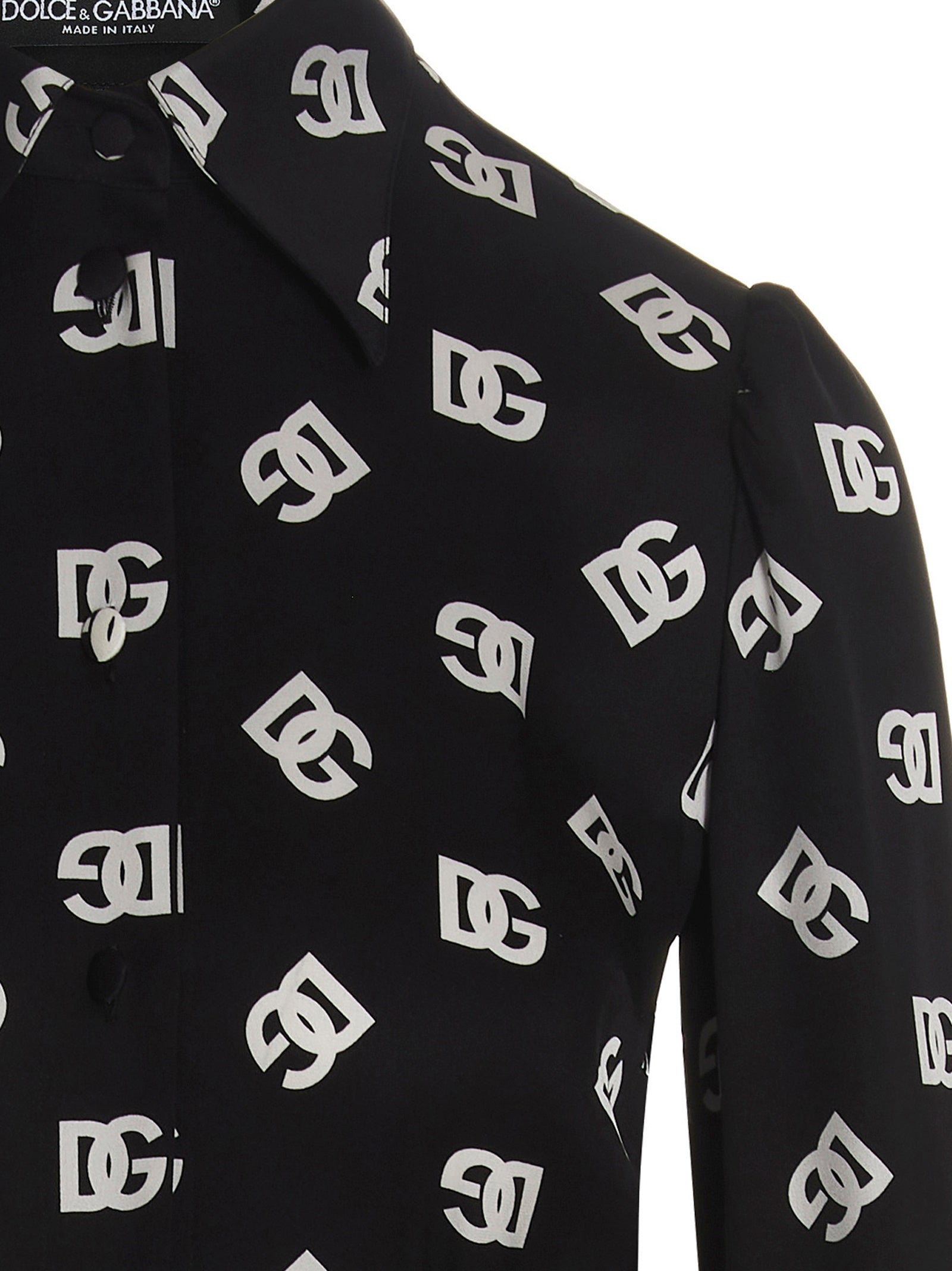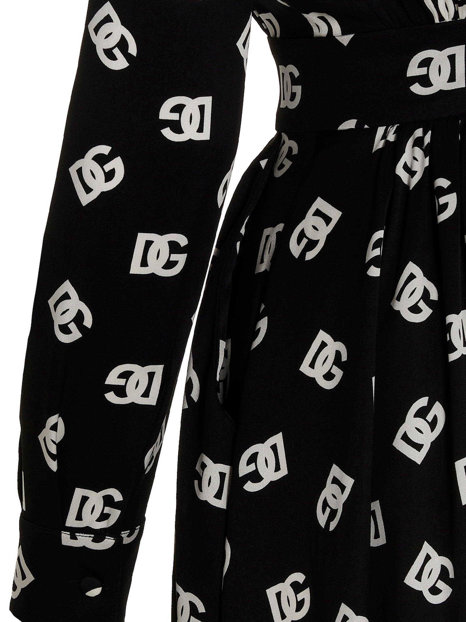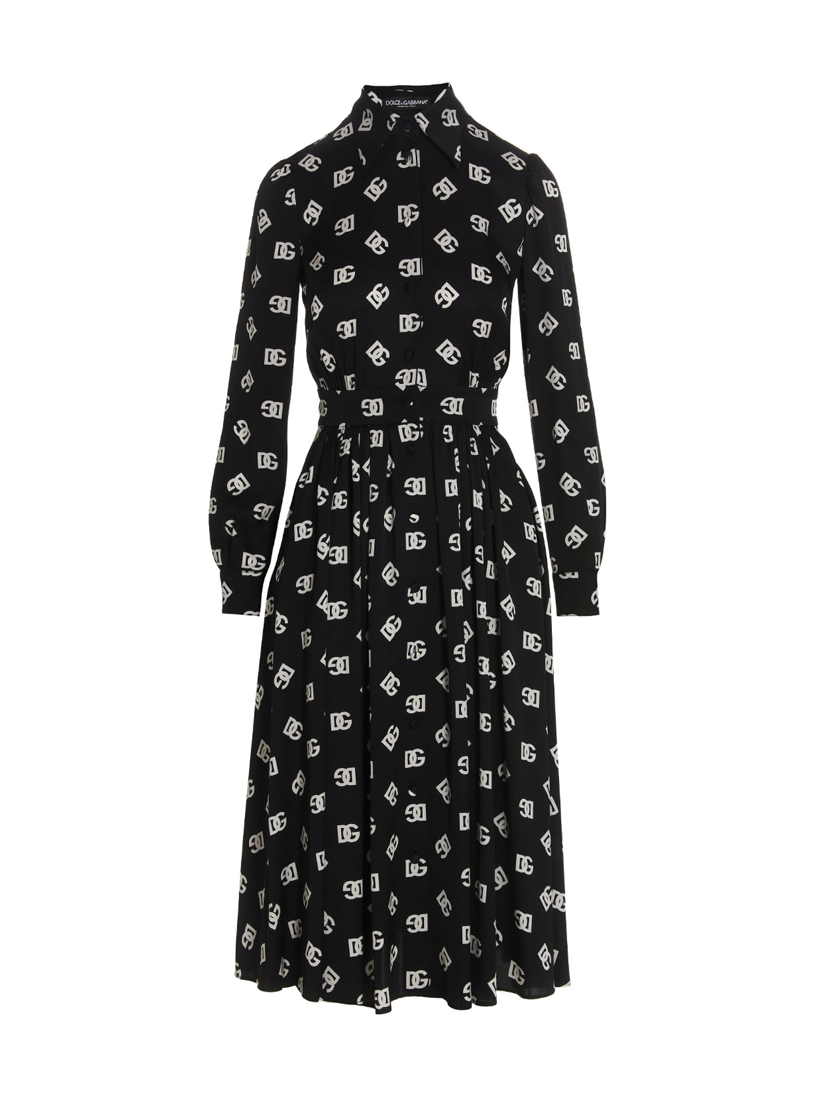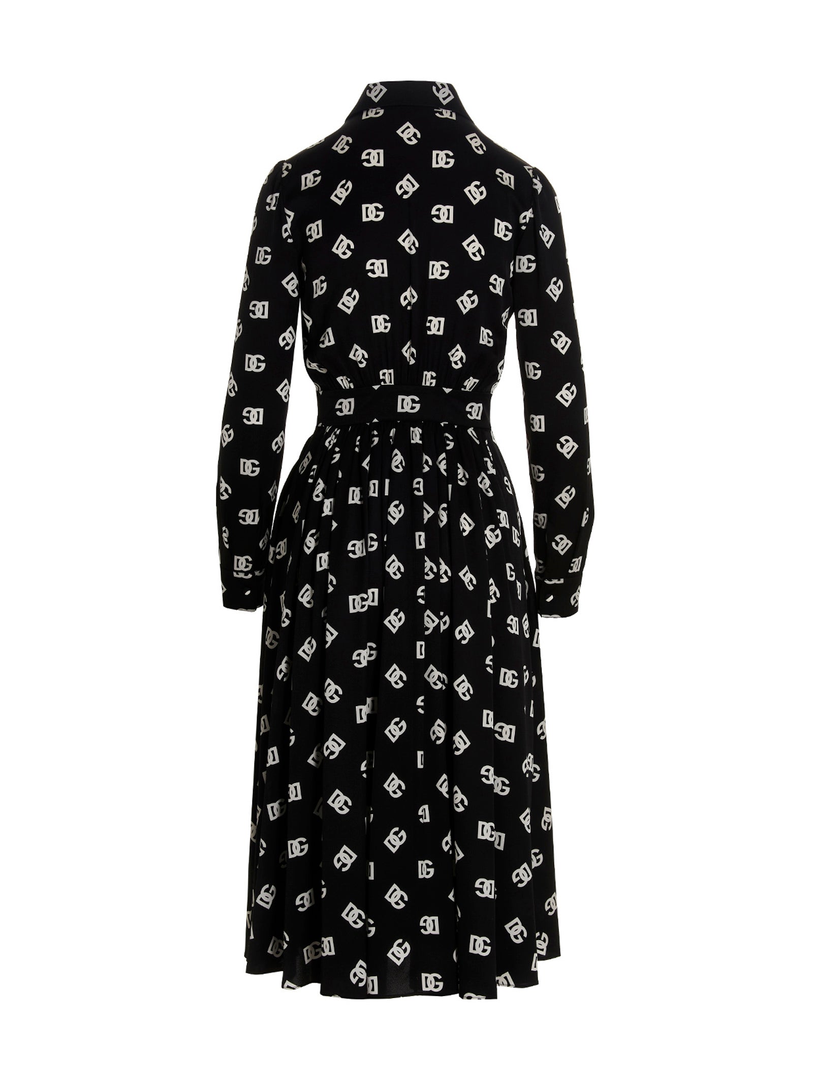 Charming silk longuette dress with all-over logo print, shirt-style collar, long sleeves, and a front closure with covered buttons.