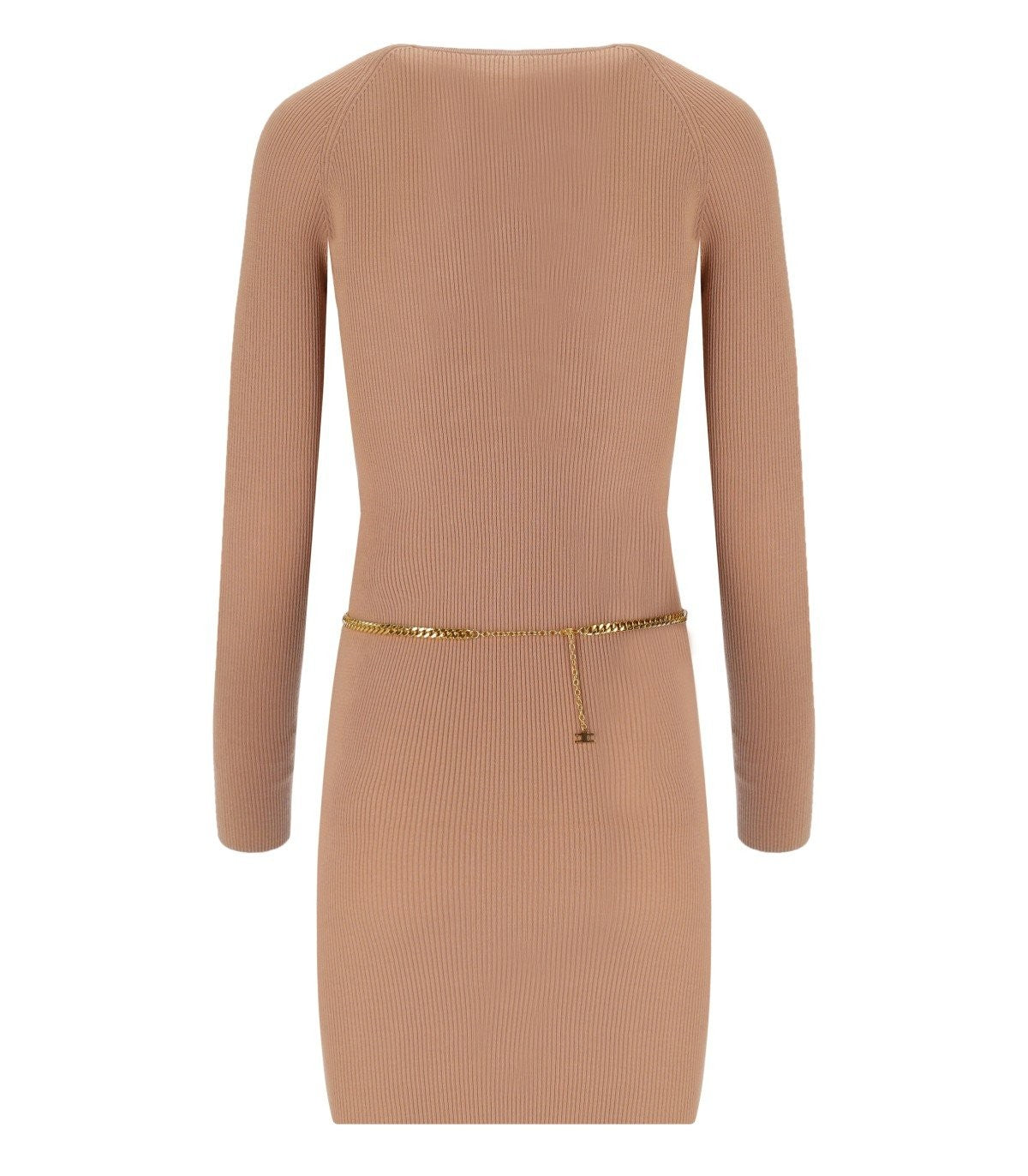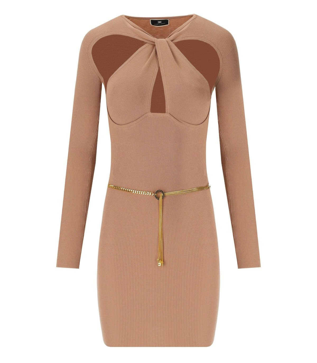 Mini dress by Elisabetta Franchi made in ribbed viscose blend in nude tones, characterized by a twist neckline with cut-out details and a golden metal belt that emphasizes the waistline. Fitted fit. Composition: 72% viscose, 28% polyurethane.
