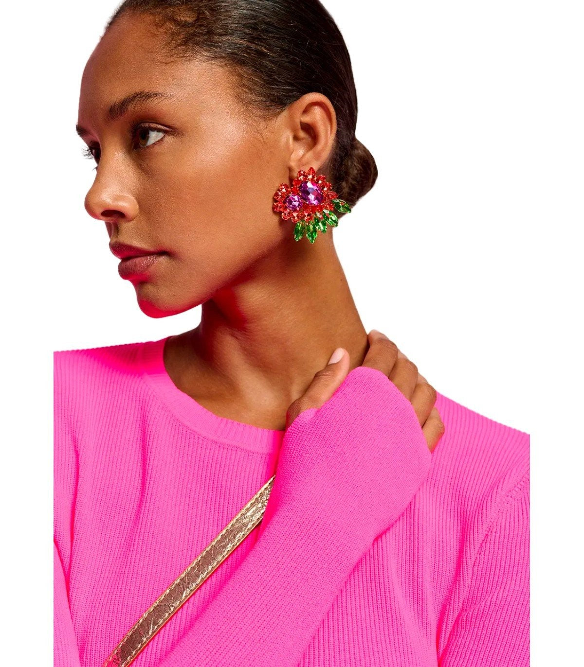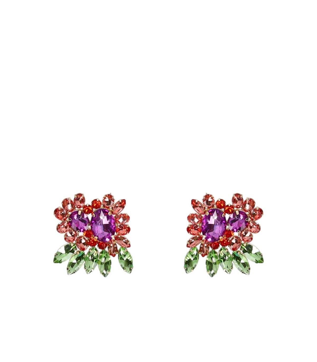 Framboise earrings by Essentiel Antwerp made up of rhinestones of different sizes and colors, creating a flower. Closure with a pin and butterfly. Composition: 60% brass, 30% glass, 10% stainless steel. Length: 4.5 cm.