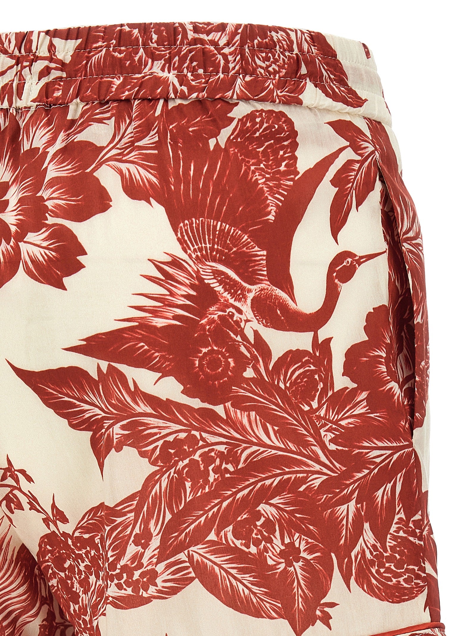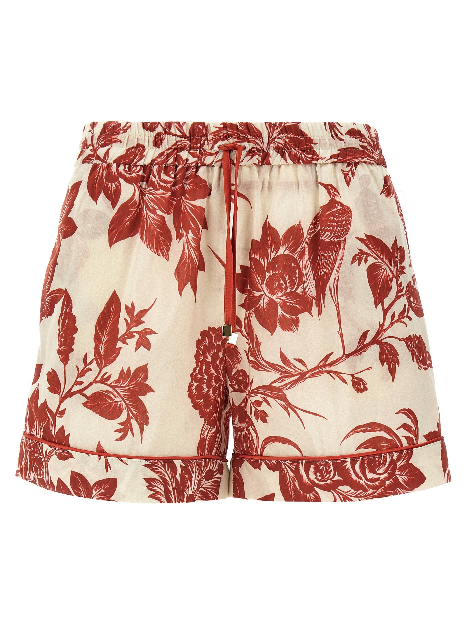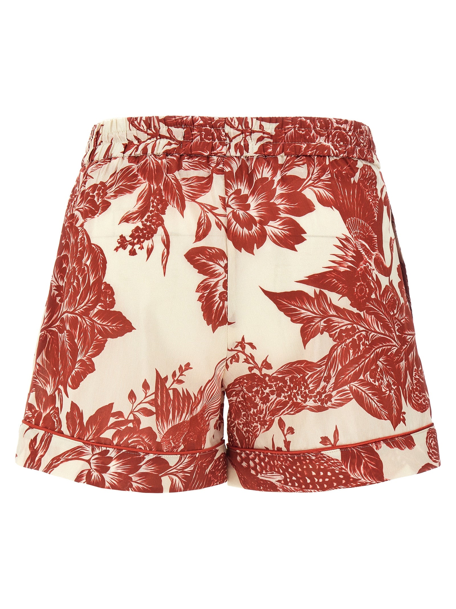 'Lissipa' shorts in silk muslin and cotton with floral print with solid satin details, adjustable drawstring elastic at the waist, pockets.
