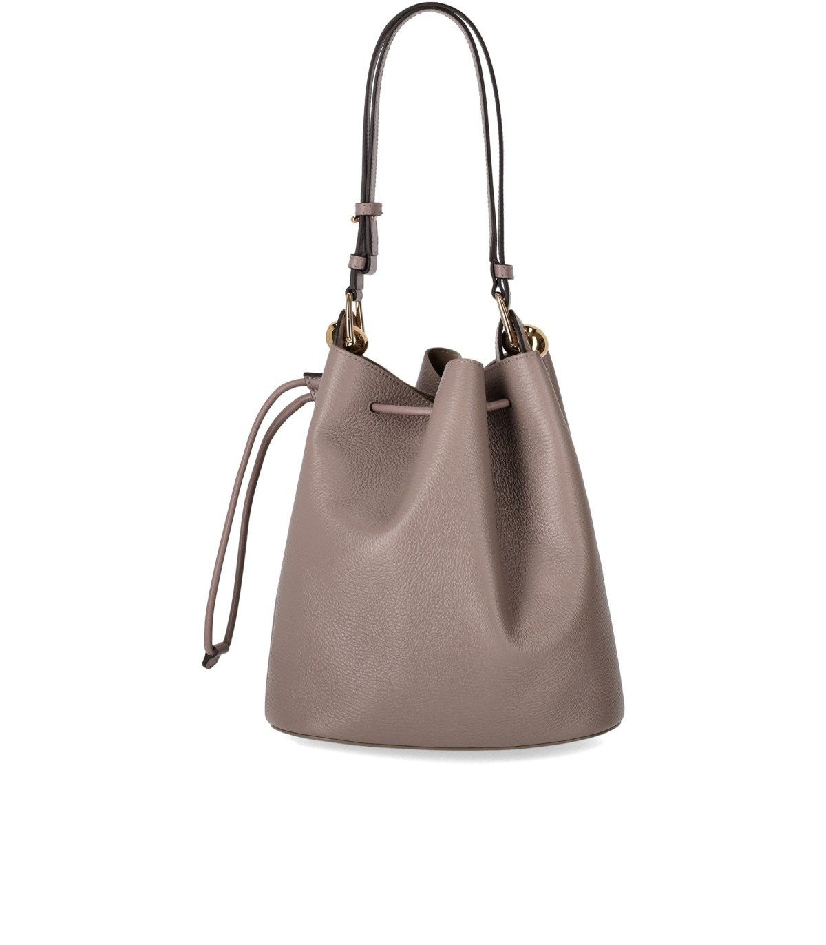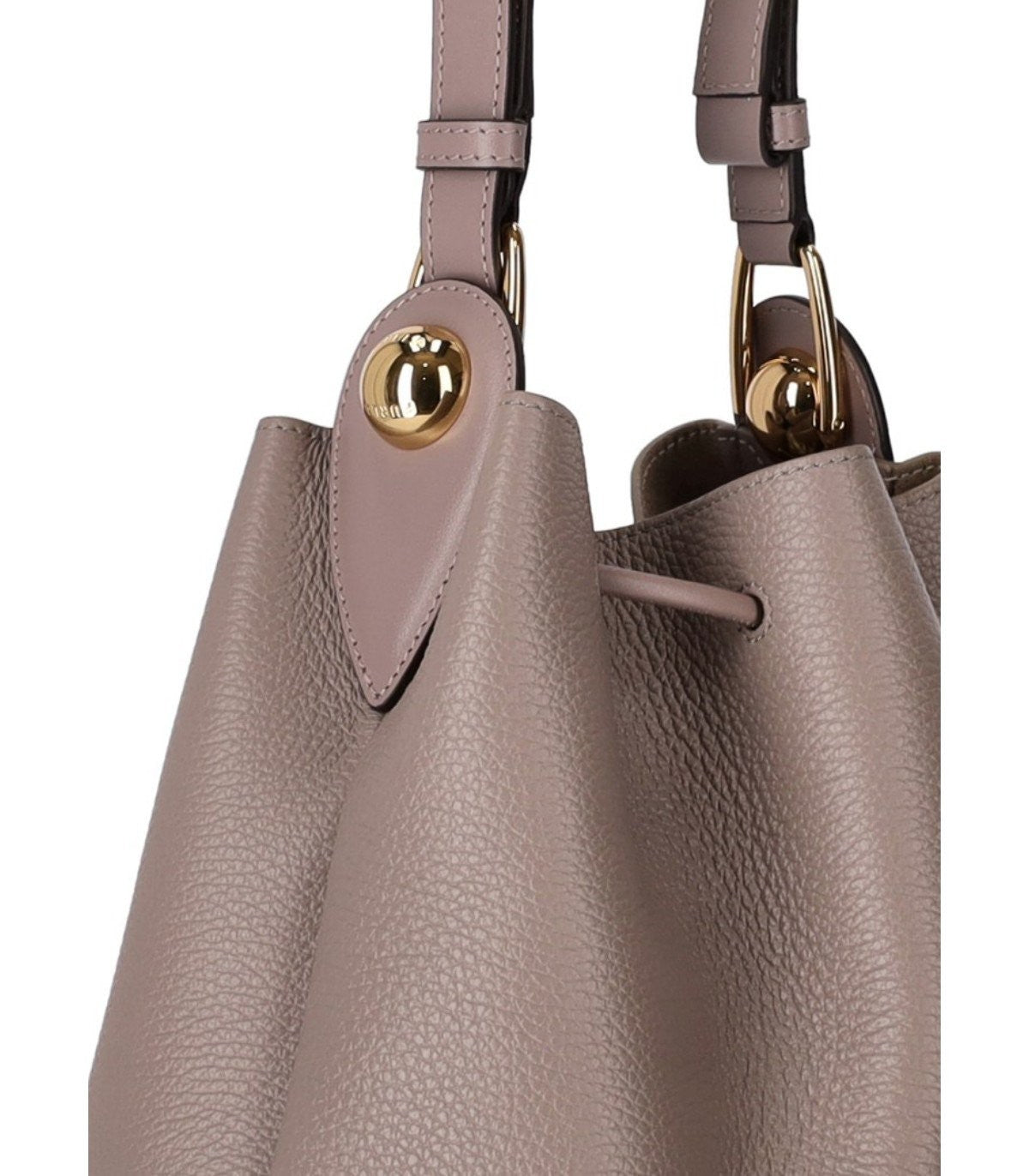 Sfera S bucket bag by Furla, made of hammered leather in dove gray. Characterized by a drawstring closure, it features an internal compartment. Finished at the ends with shiny gold-bronze Sfera hardware, adding a bright touch to the accessory. Equipped with a smooth calf leather adjustable handle with a mushroom system for comfortable wear as a crossbody. Dimensions 33x27.5x4.5 cm. External composition: 100% leather. Internal composition: 50% nylon 50% polyurethane.