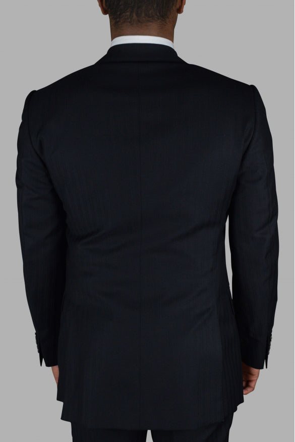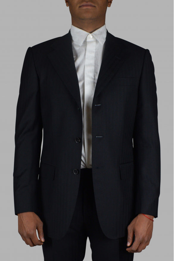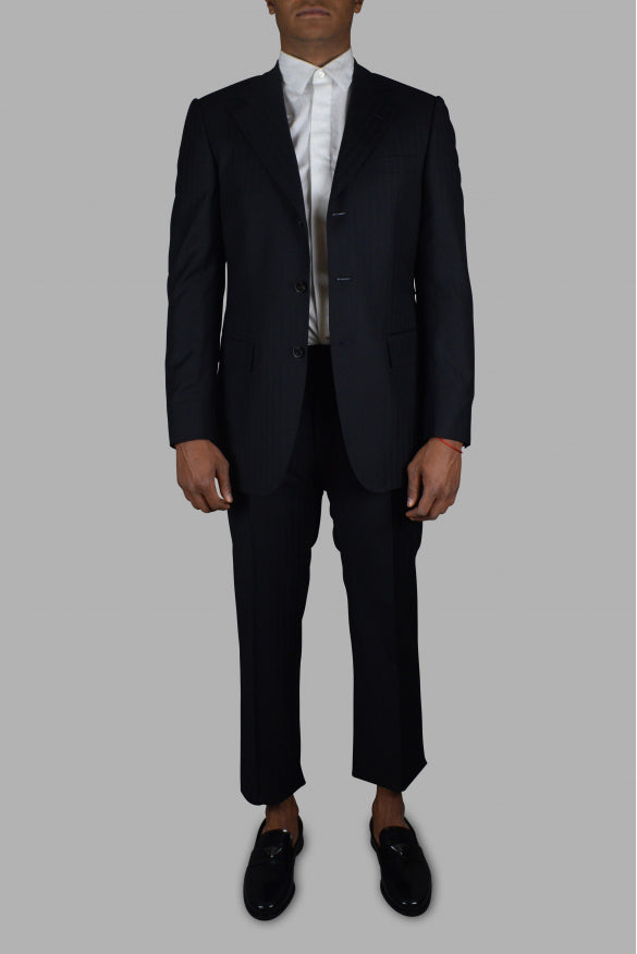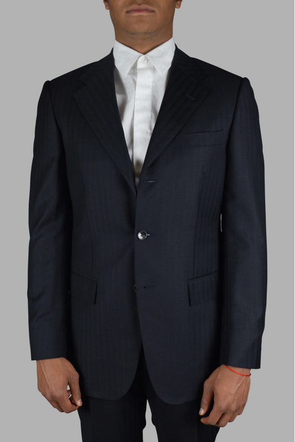 Gucci two-piece navy blue suit with tone-on-tone stripe duo patterns.