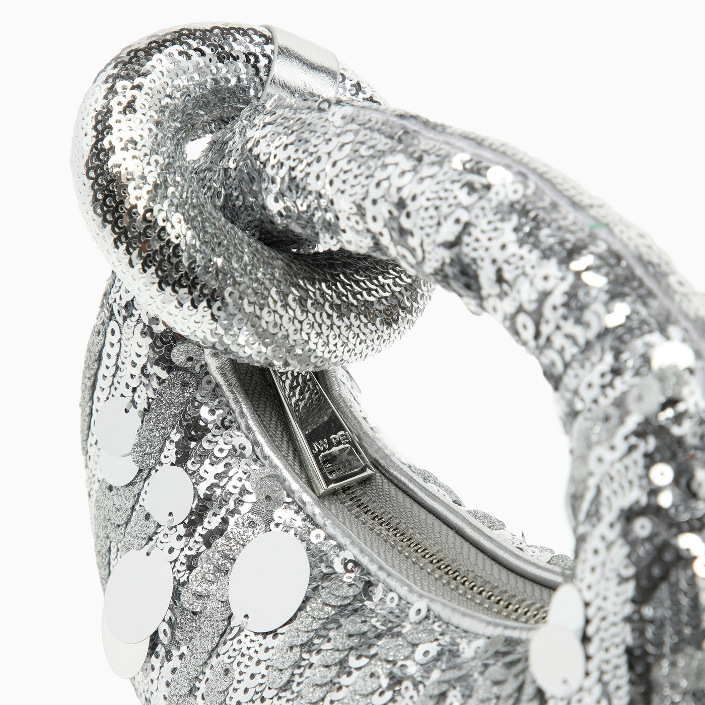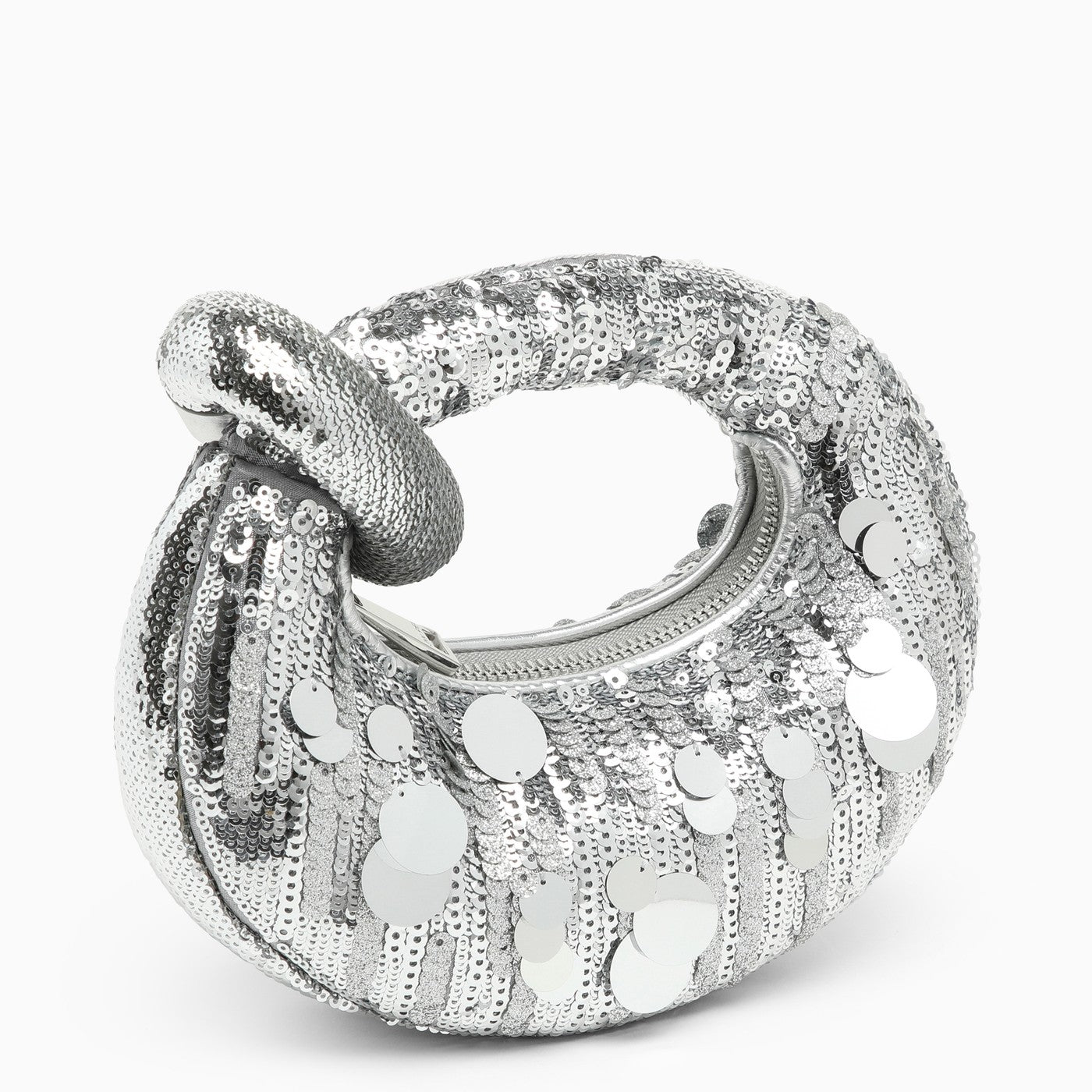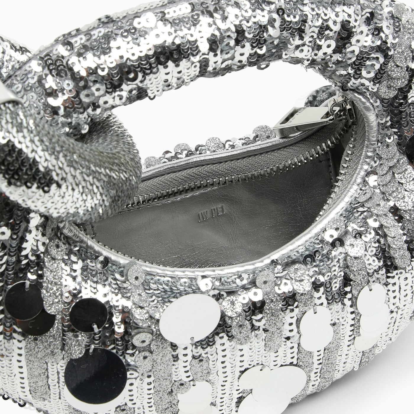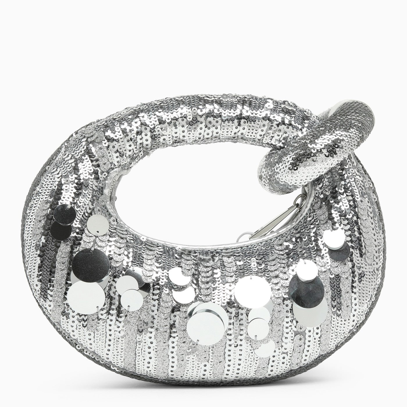 Silver mini round handbag by JW Pei with all over sequins, featuring a top zip fastening and an inside flat pocket.