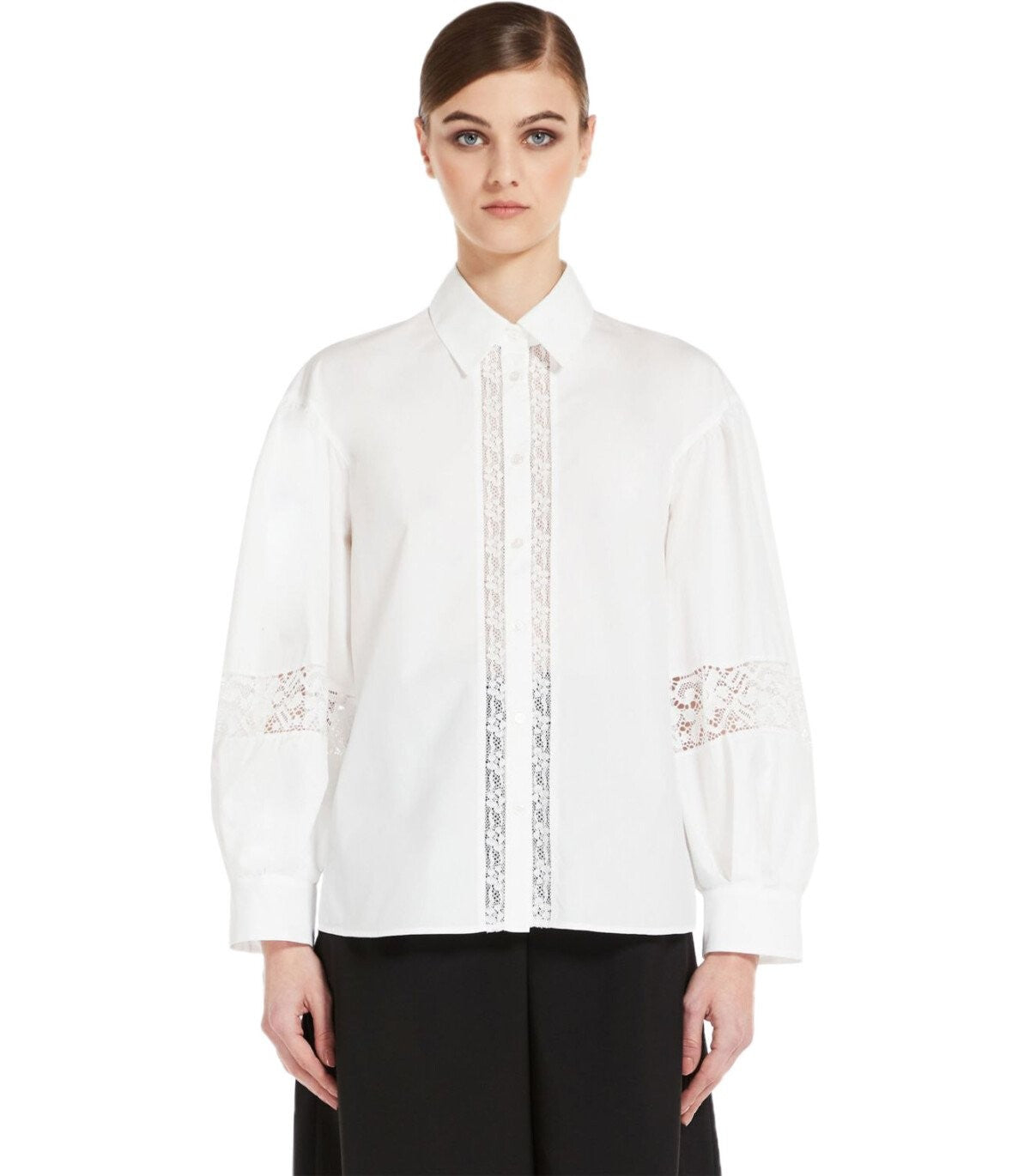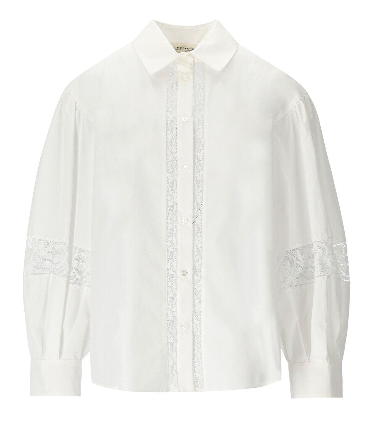 Samuele shirt by Max Mara Weekend made of white cotton poplin, embellished with macramé lace applications. Slightly puffed sleeves and closure with mother-of-pearl buttons. Composition: 100% cotton. Decorations: 100% polyester.