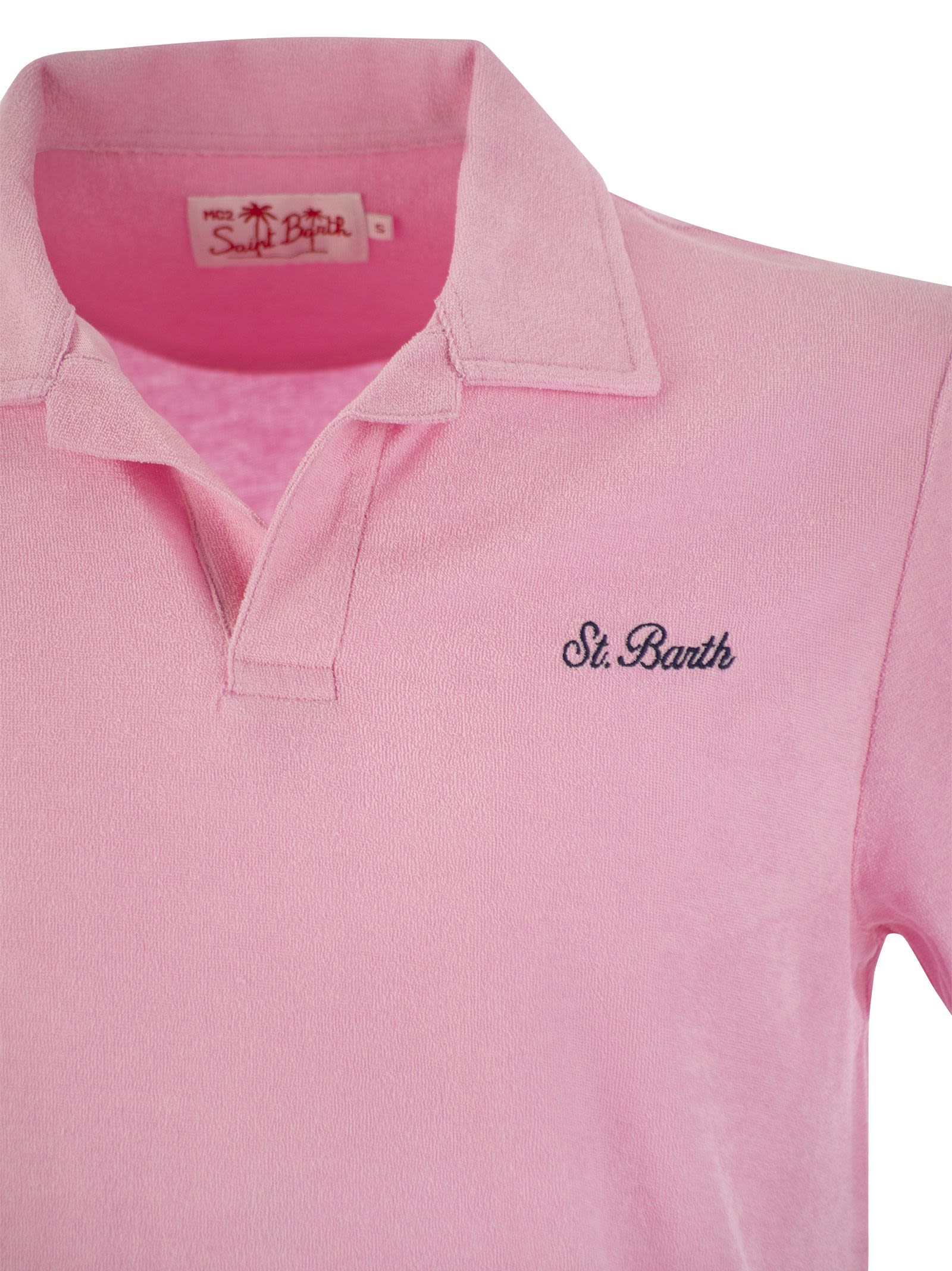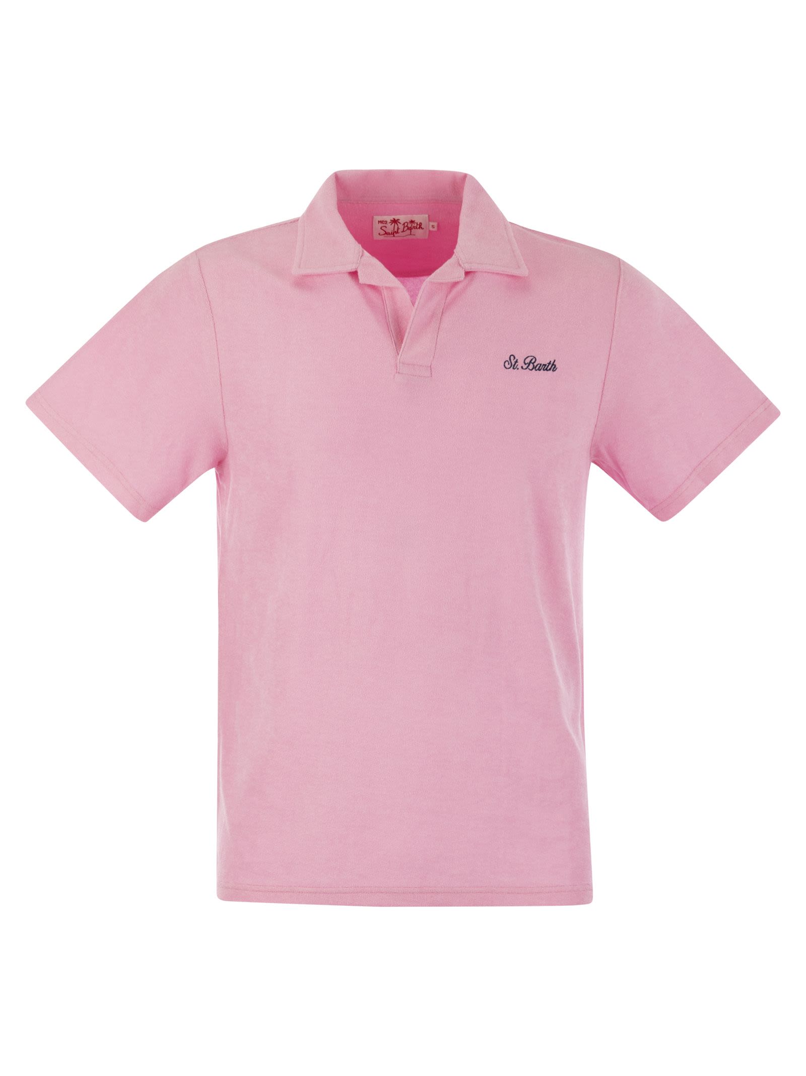 Introducing the Jeremy men's polo shirt by MC2 Saint Barth. This half-sleeve polo shirt features a buttonless design for effortless style. Made of ultra-light, soft and comfortable terry fabric. Piece dyed for a unique look, weighing in at 190g for all-day comfort. Regular fit for a timeless silhouette. MC2 Saint Barth embroidery in italics adorns the heart motif, adding a touch of elegance to this versatile garment. - Men's terry polo shirt - Solid pink - Exclusive Saint Barth logo embroidery on left chest - Garment dyed - Regular fit DESIGNER ID: JER0001 00038F