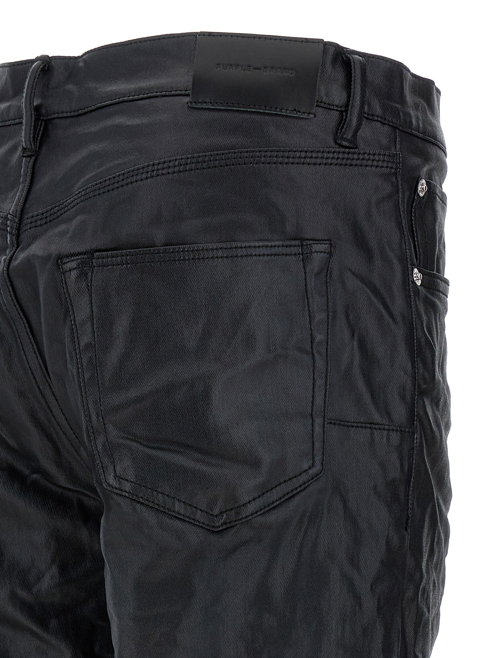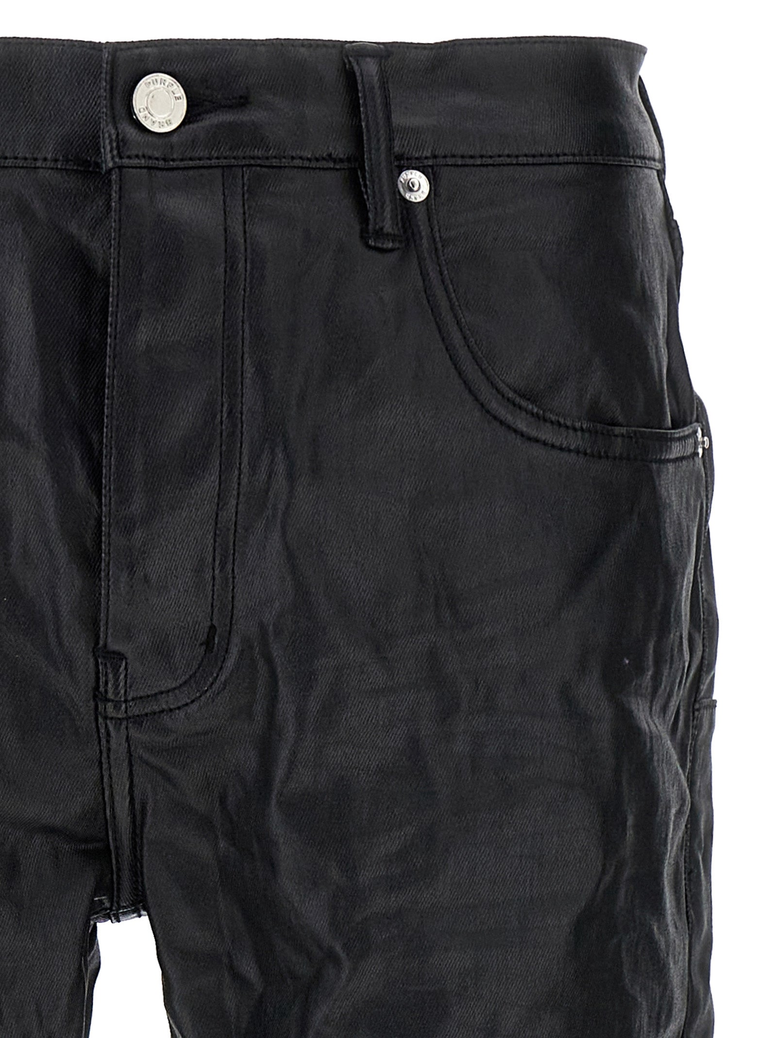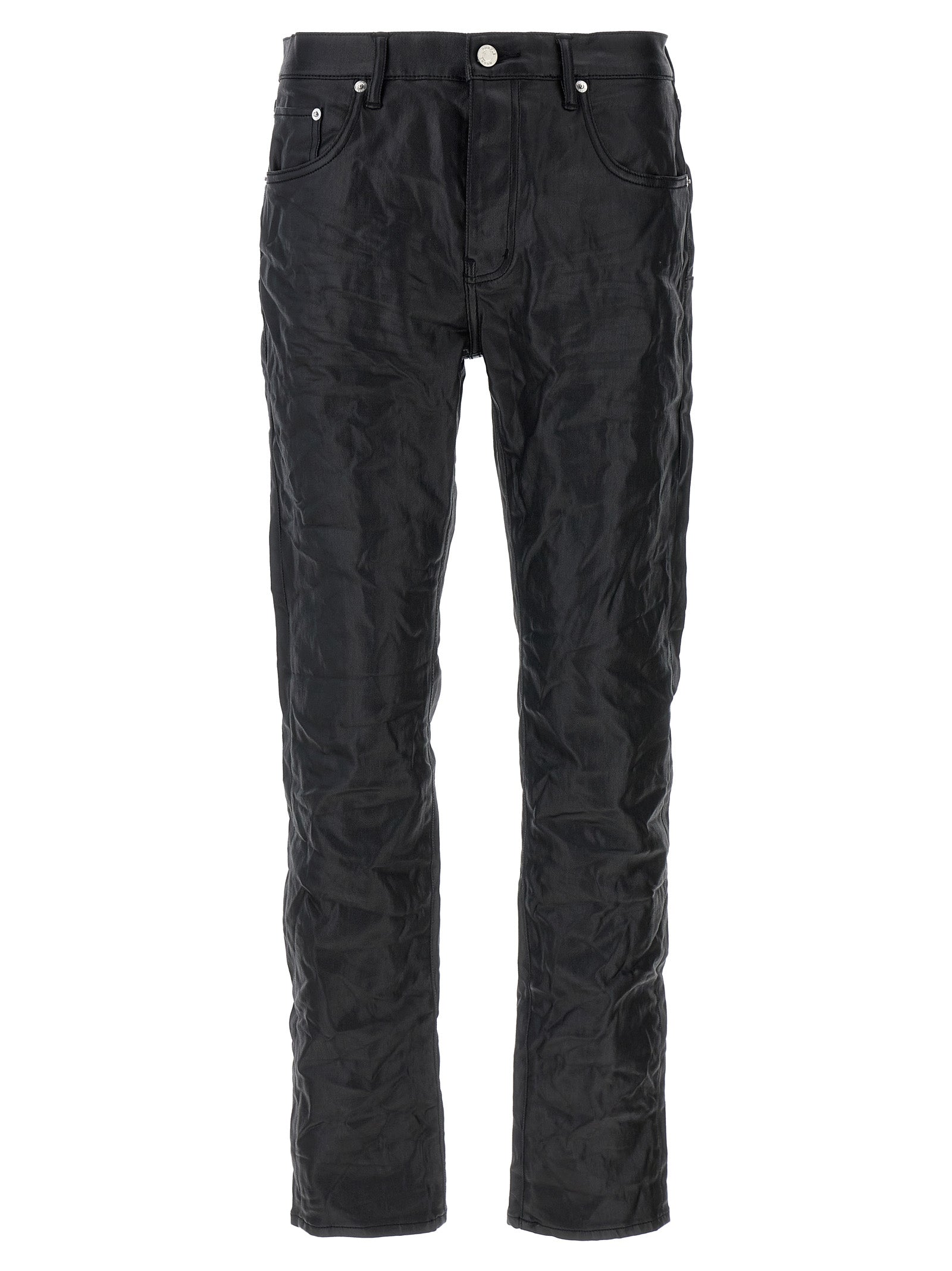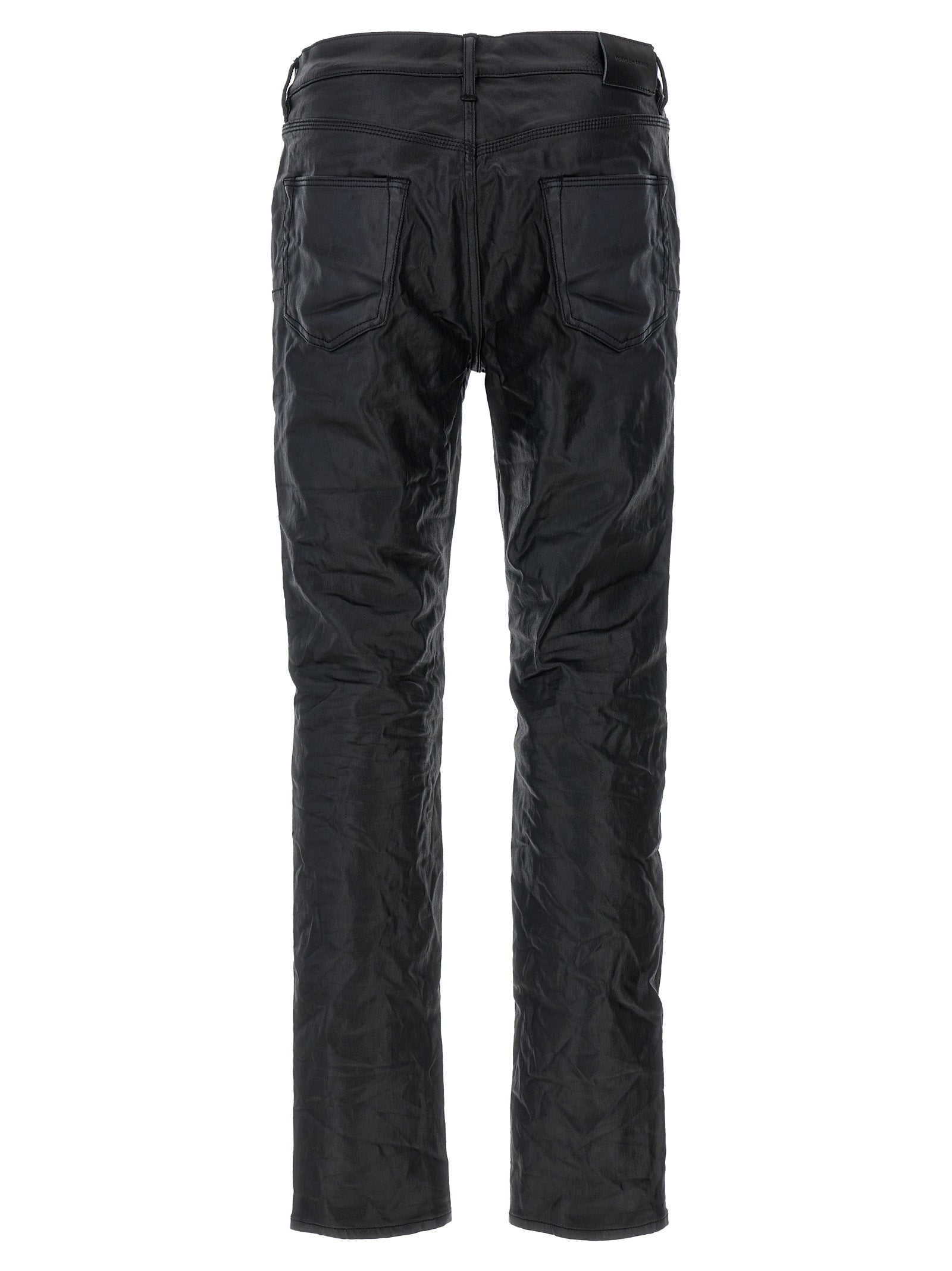 'P001' crinkled coated cotton denim jeans with button closure, five pockets, low waist style with slim leg.