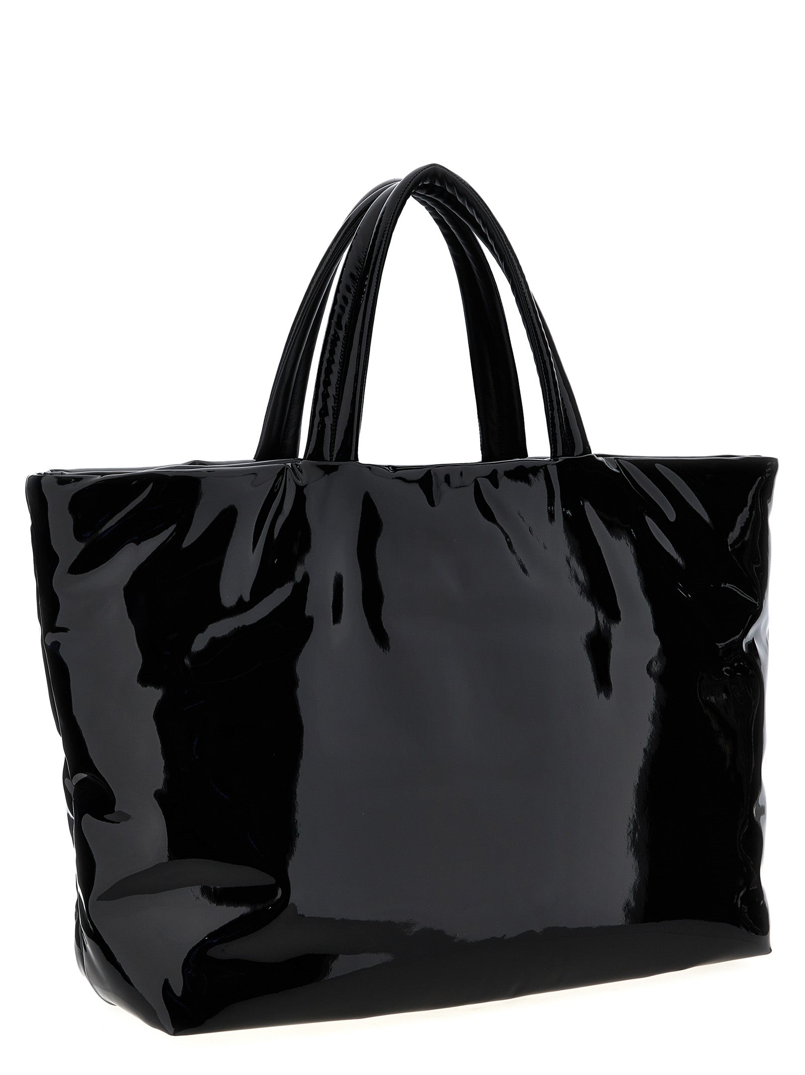 Maxi handbag in patent canvas, leather interior, embossed front logo, zip pocket, handles.