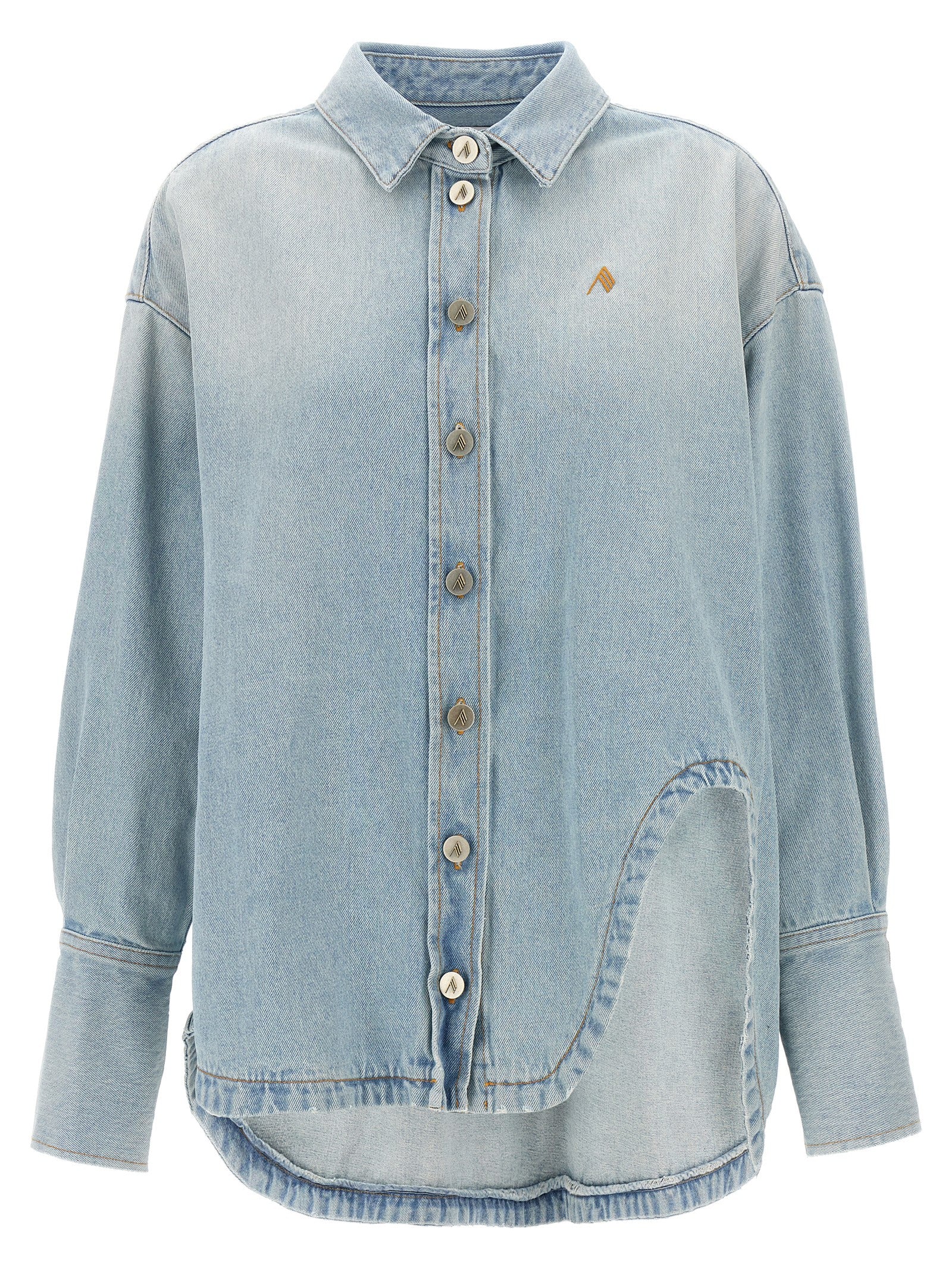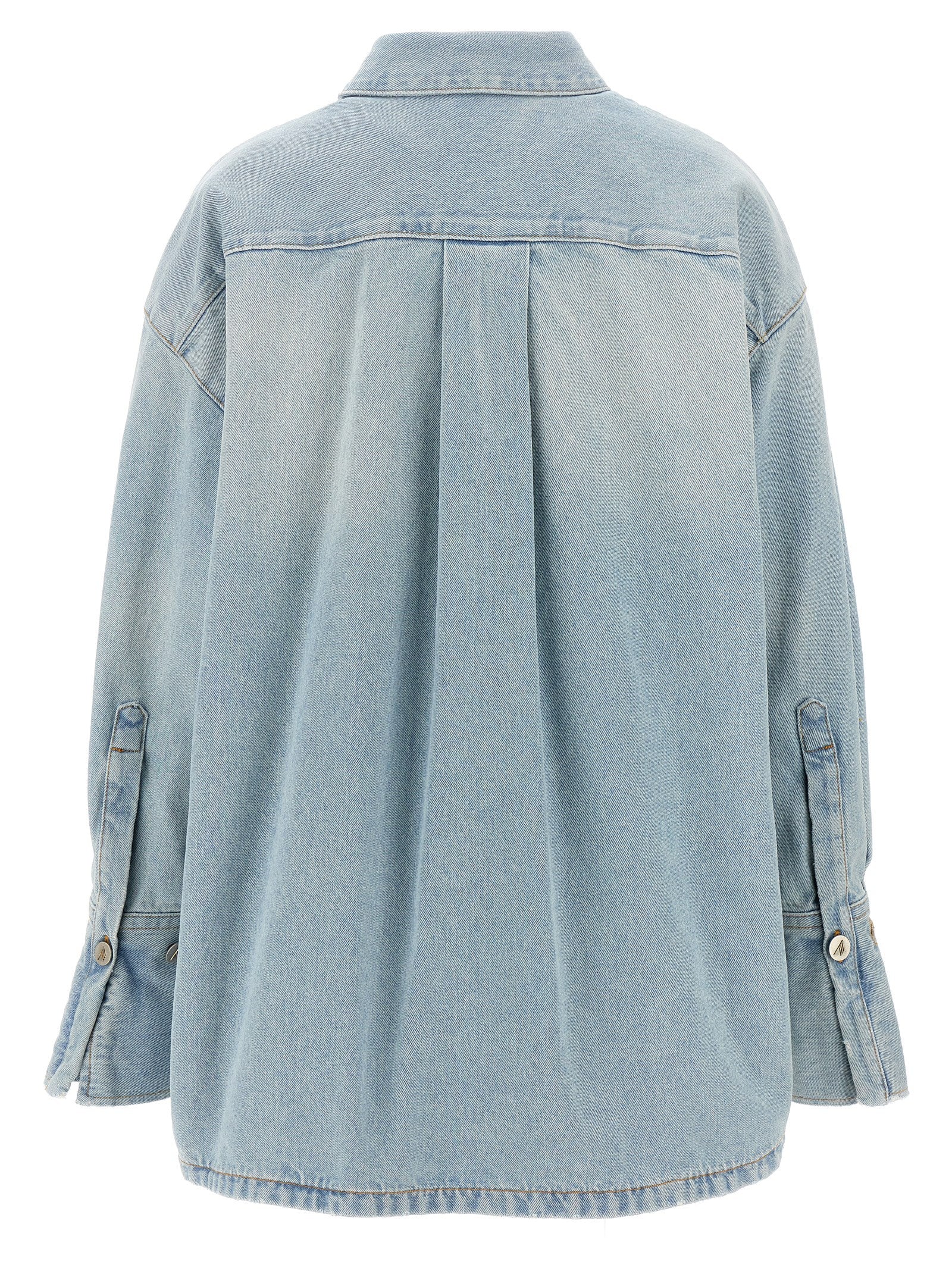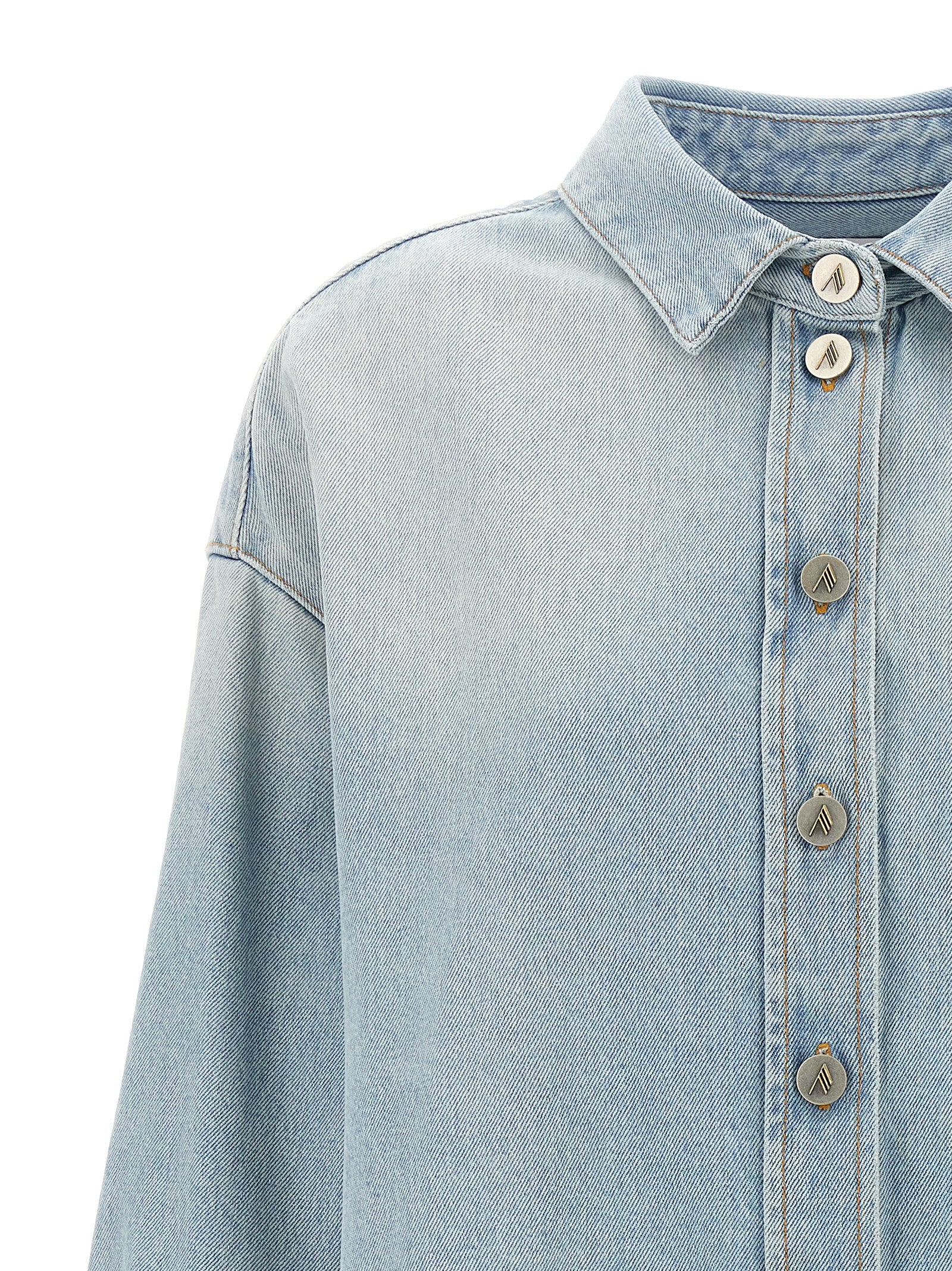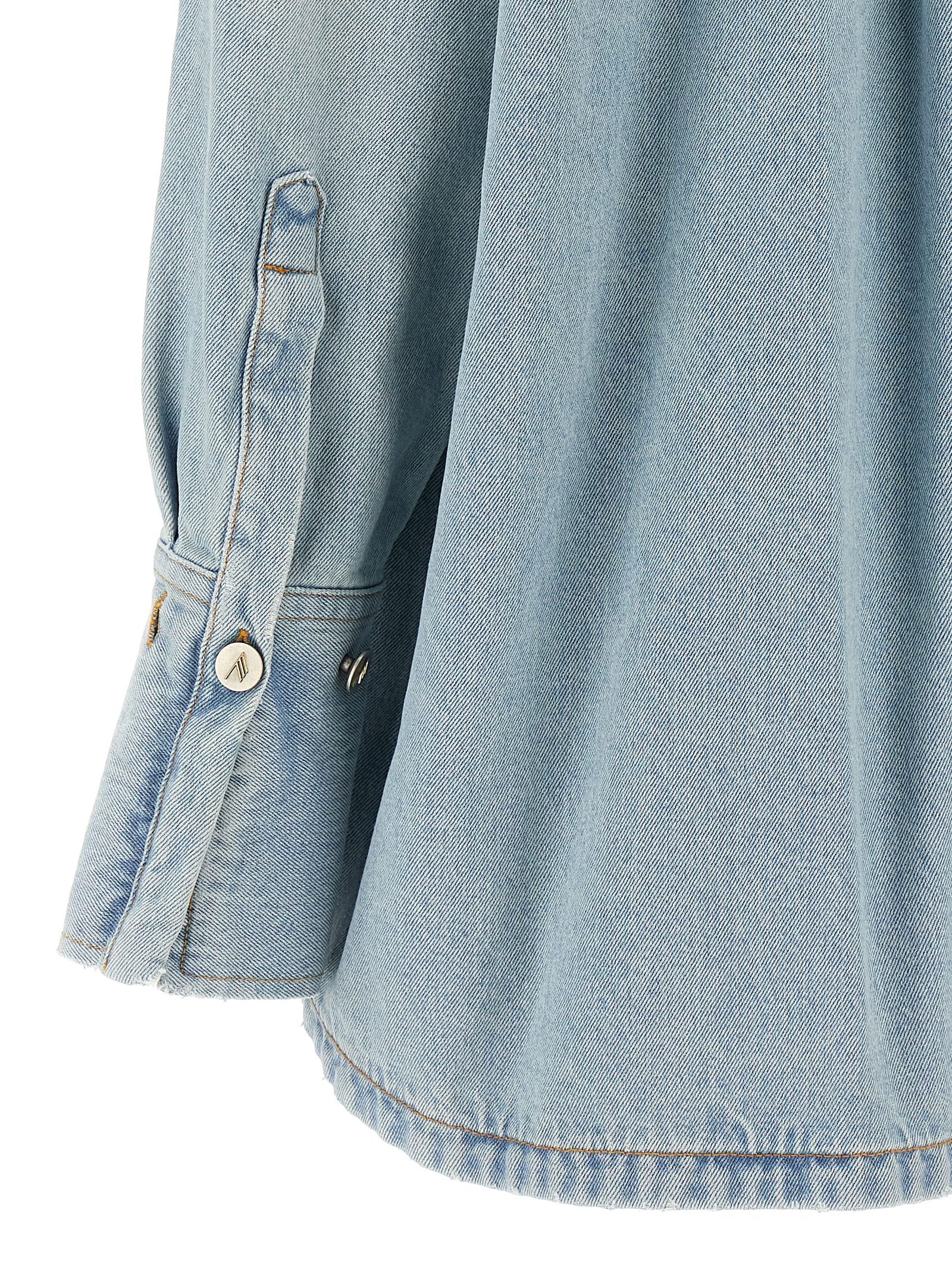 Cotton denim coat with button closure, front logo embroidery, long cuffed sleeves, side shaped split.