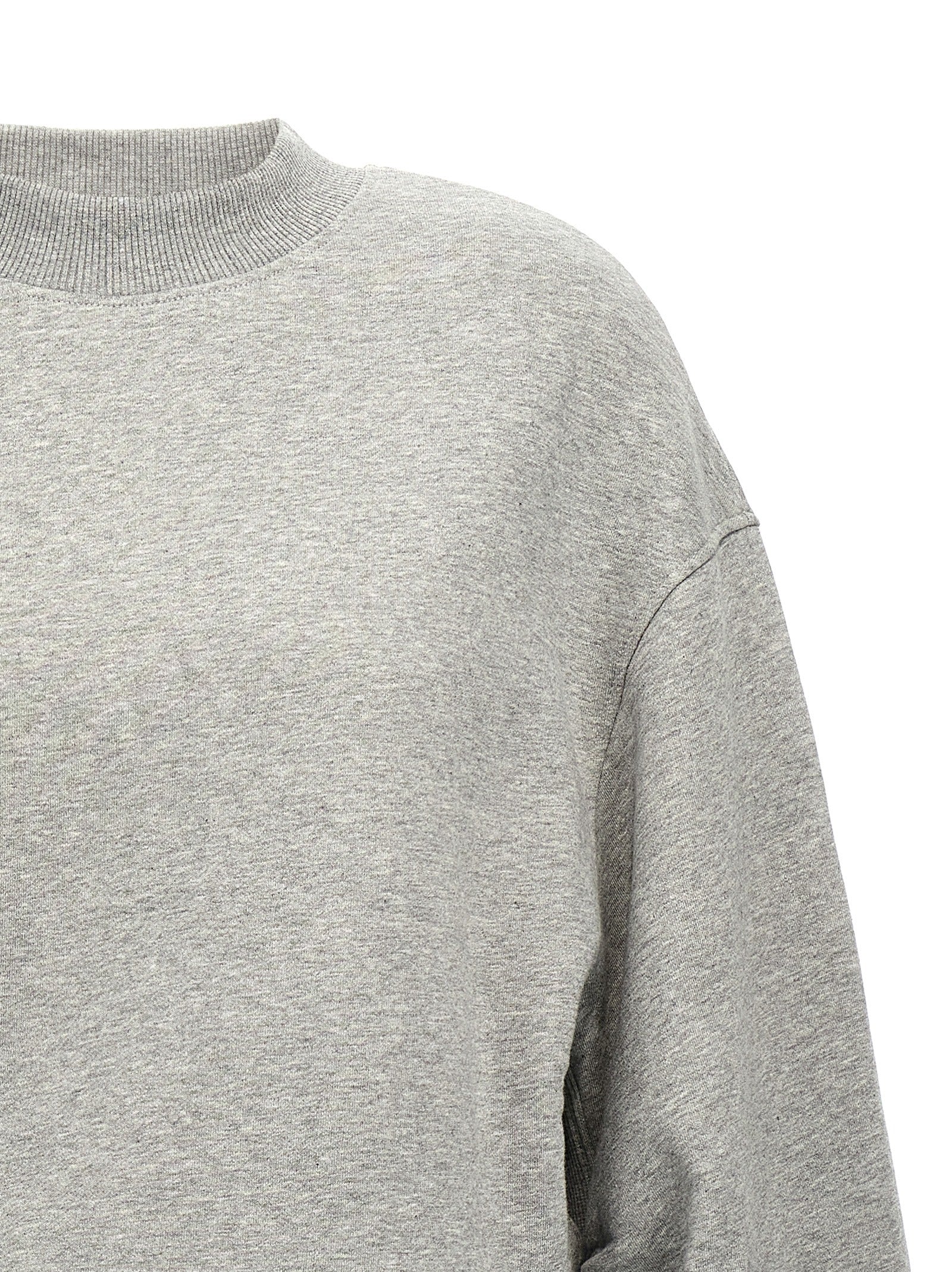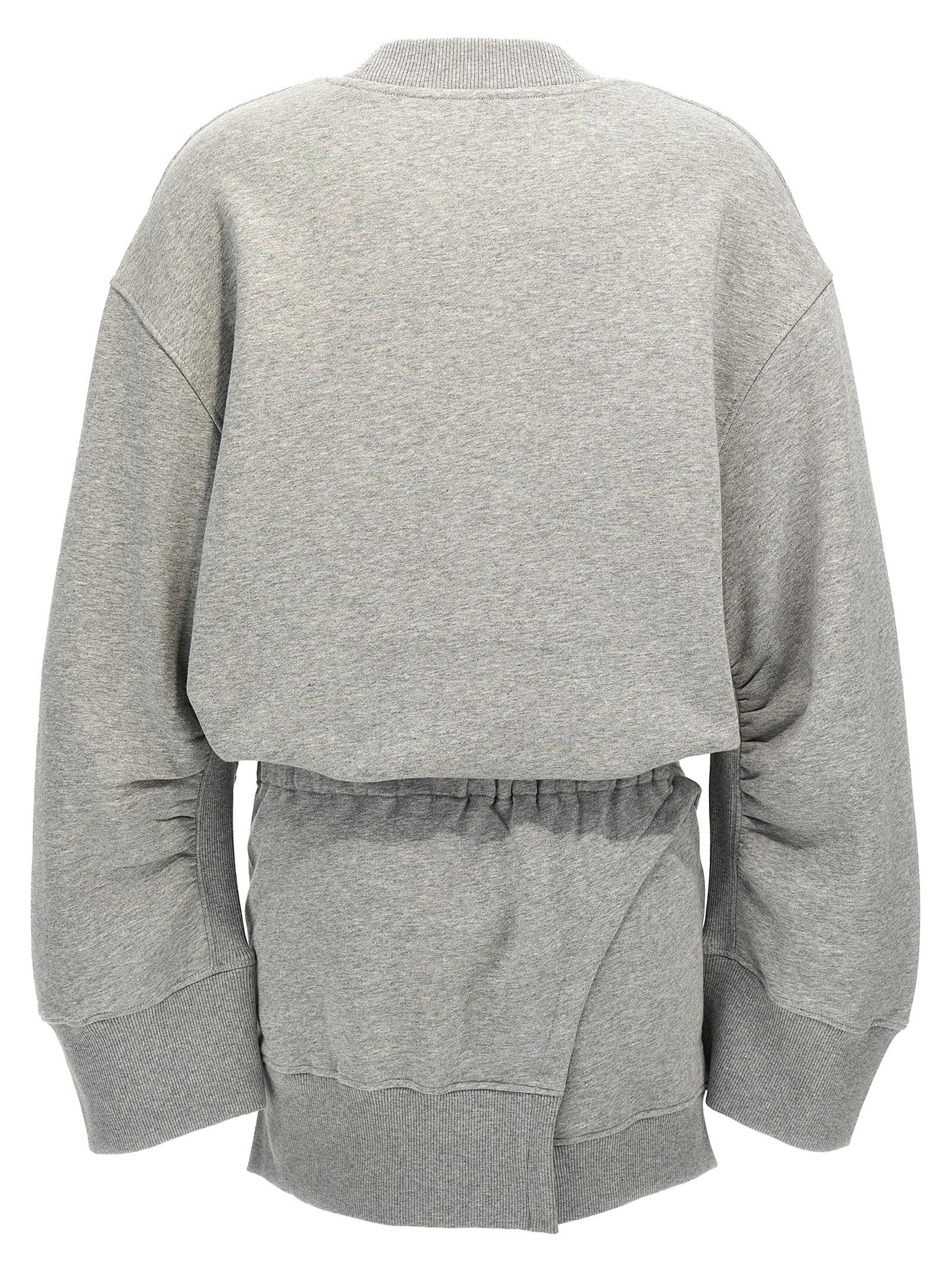 'Ivory' cotton mini dress, fleece style, high neck, long sleeves with cuffs and metal logo appliqué, asymmetrical hem, elastic waistband at the back.