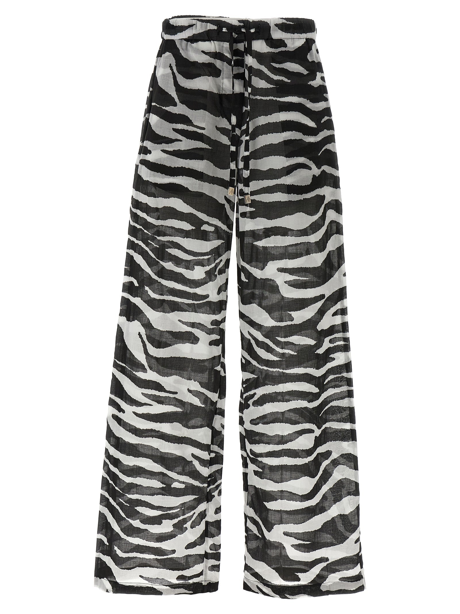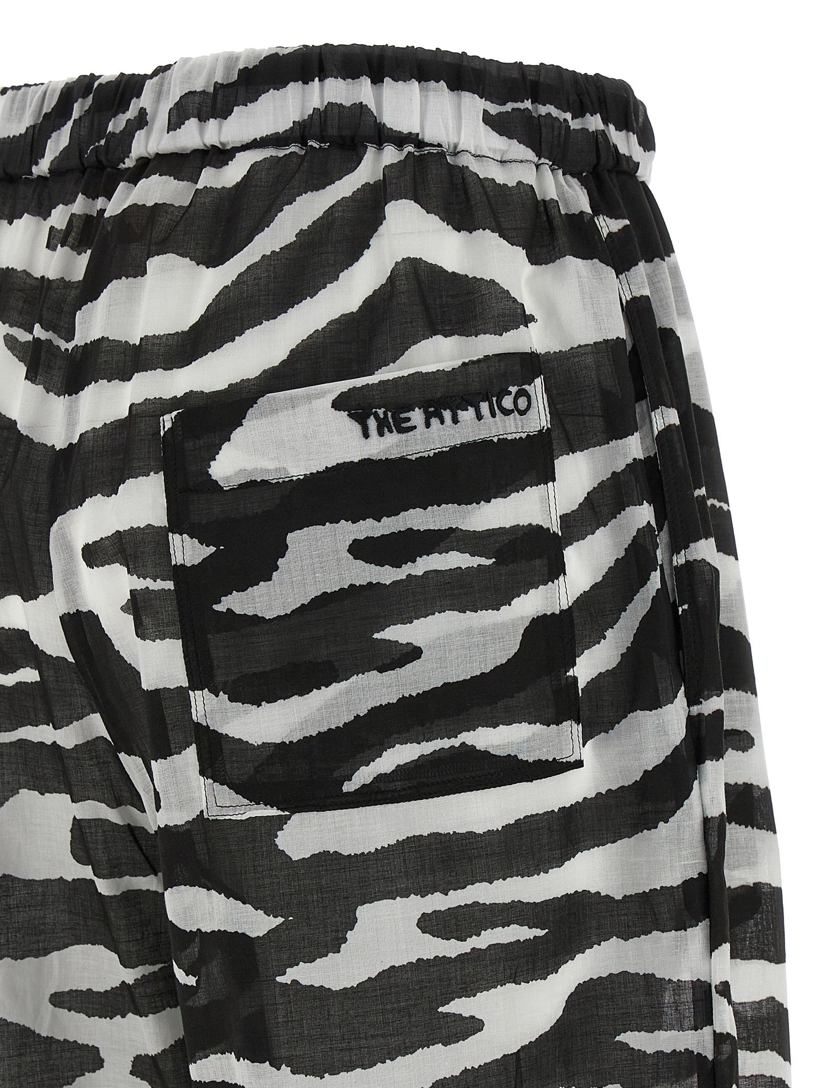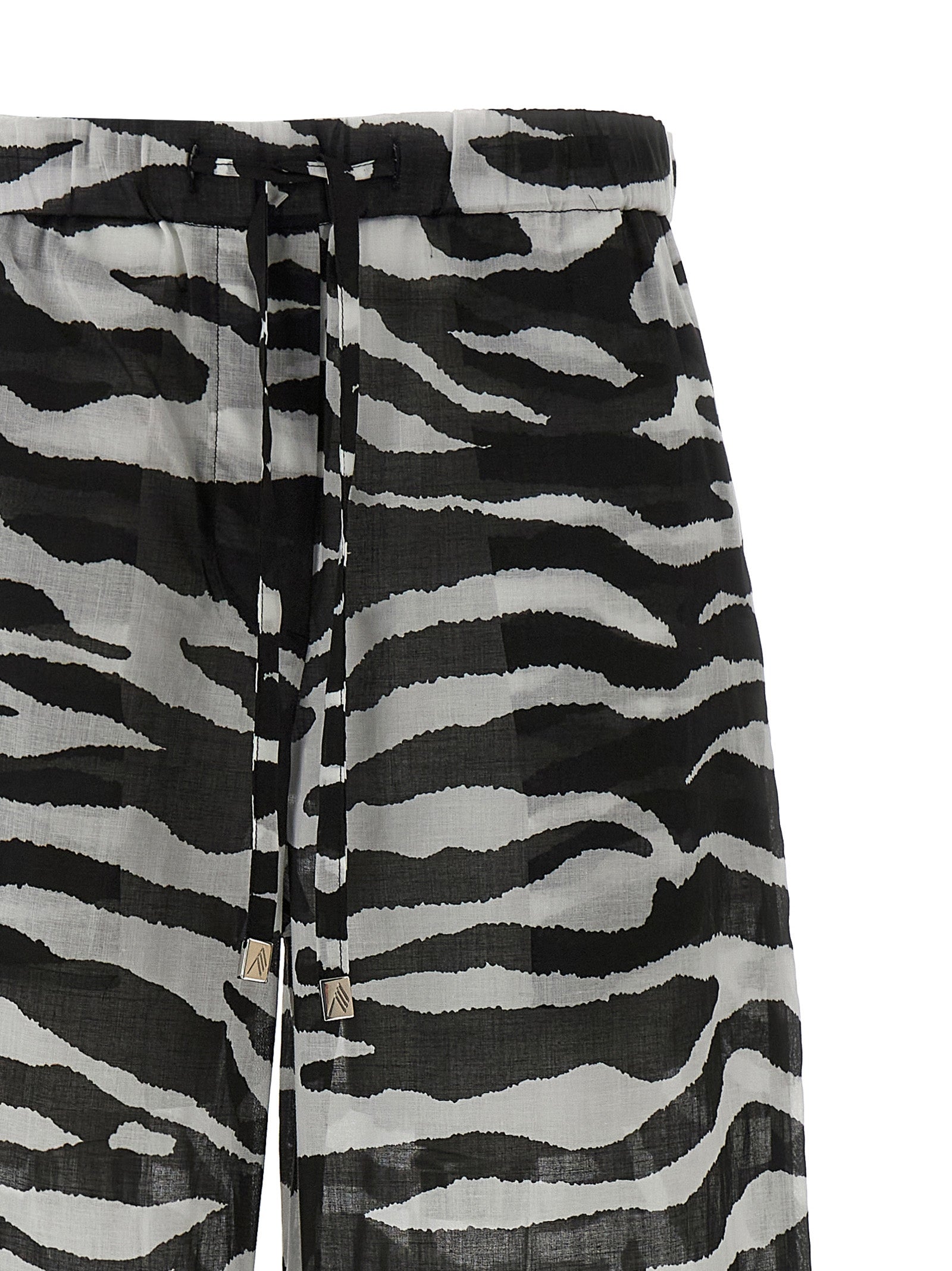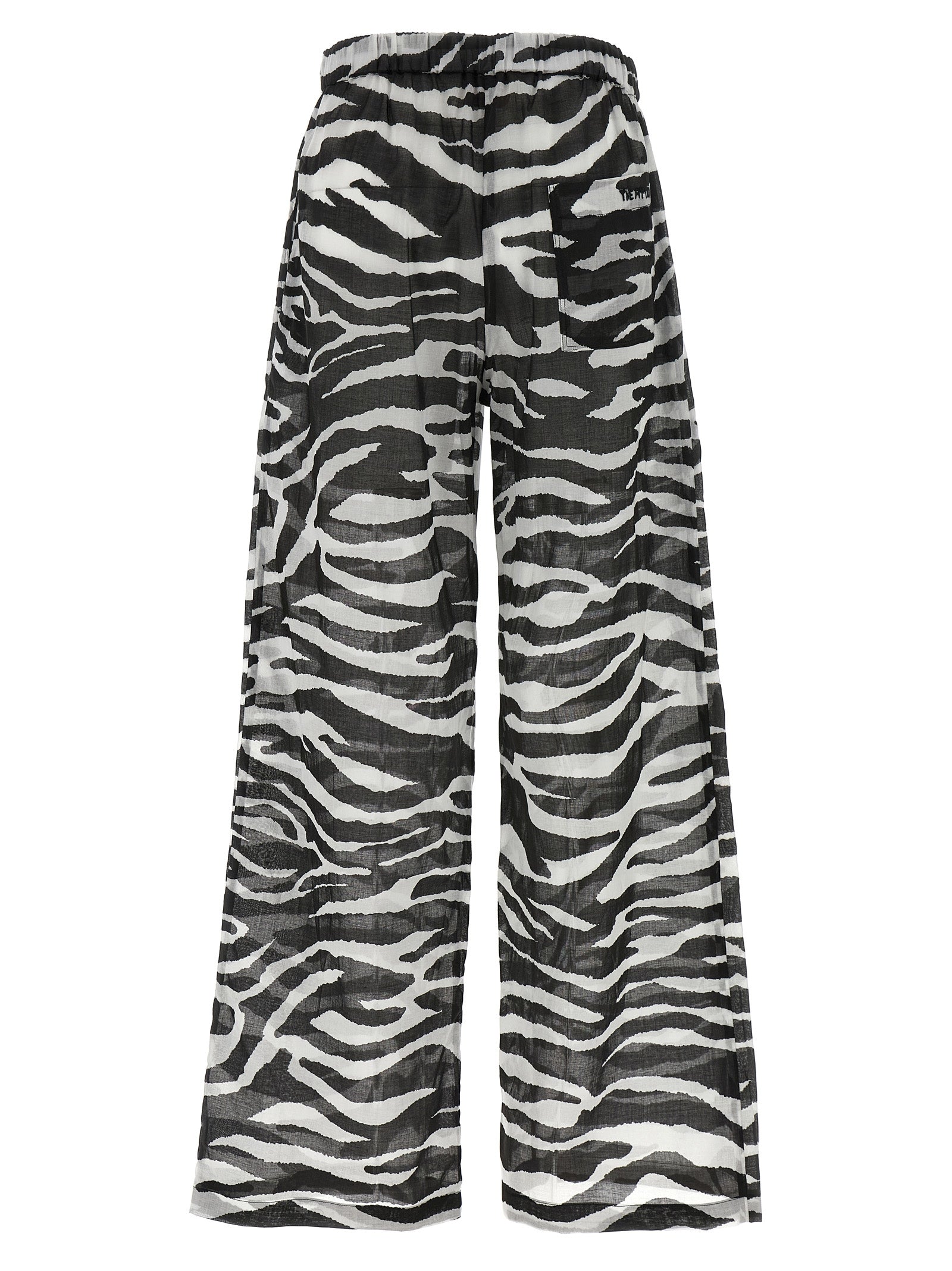 Cotton muslin pants, lightweight transparent zebra print fabric, elastic waistband with adjustable drawstring, back pockets with logo embroidery.
