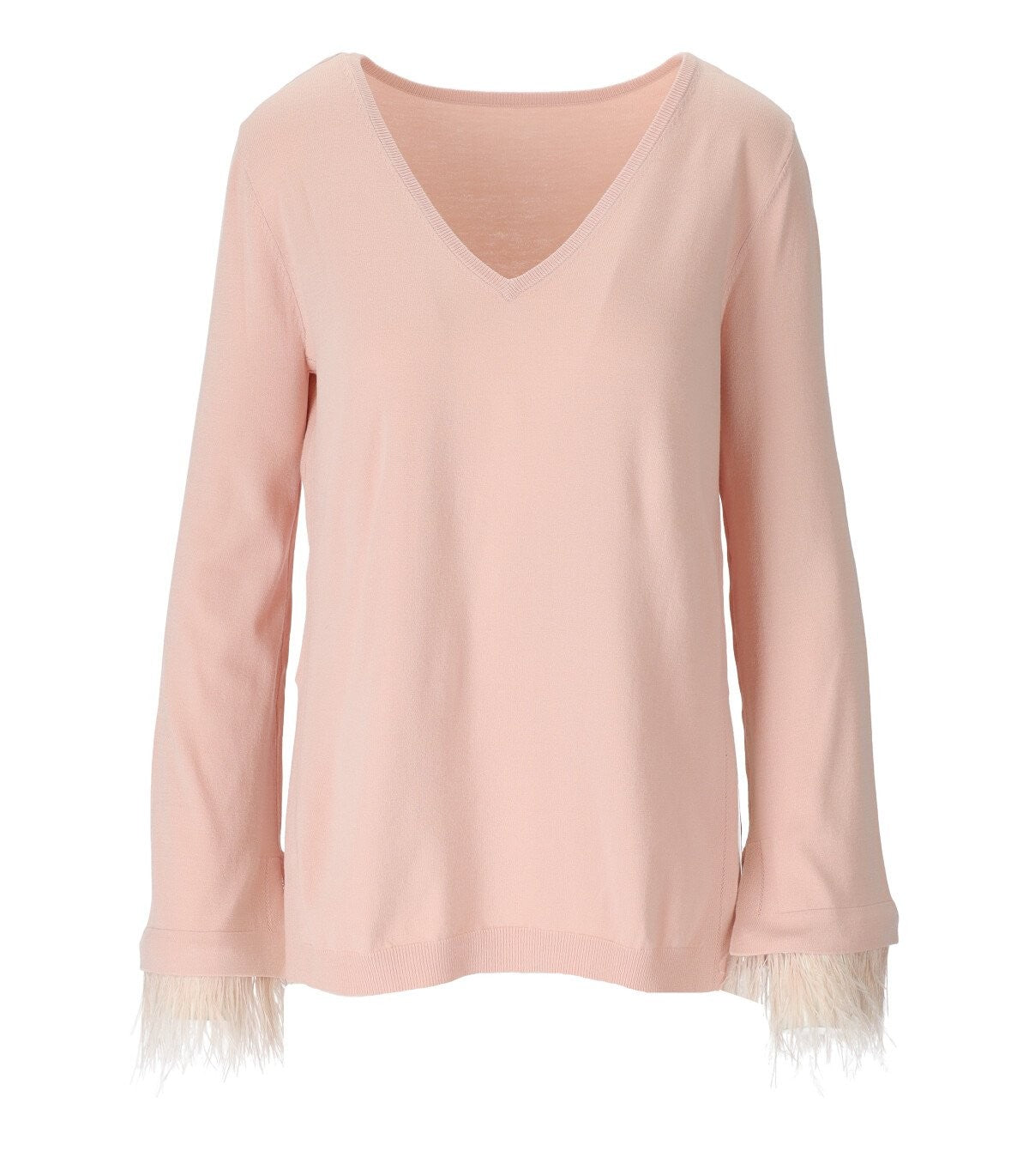 Twinset jumper made of pink viscose blend with ostrich feather inserts on the sleeves. V-neck, side slits, soft fit.