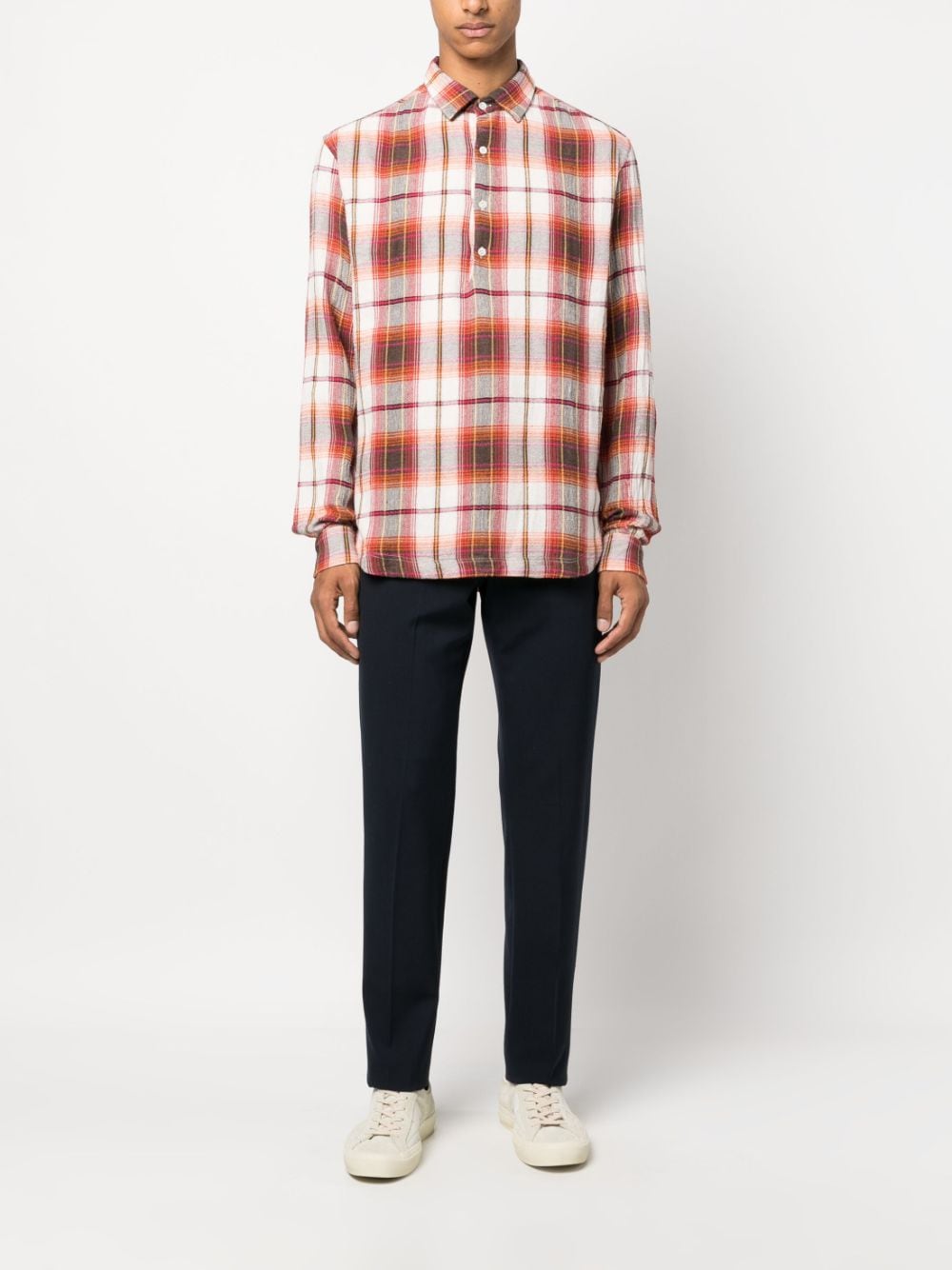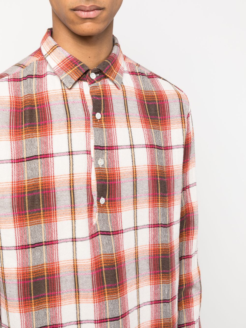 check-print long-sleeved shirt from BARENA featuring plaid check print, buttoned-cuff sleeves, rose red, white, cotton blend, classic collar, front button fastening, long sleeves and straight hem.