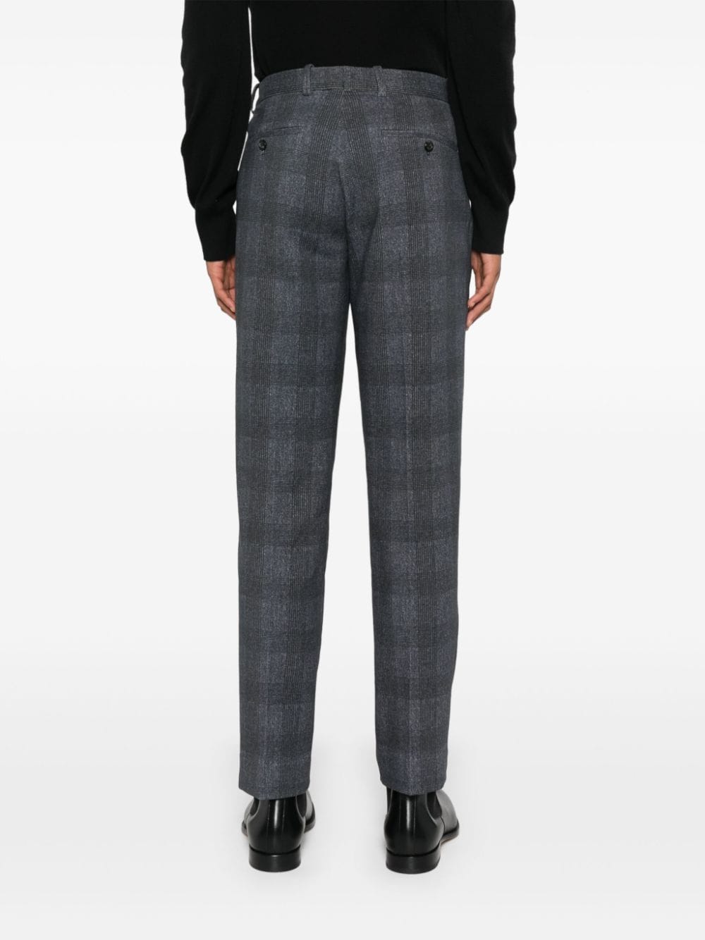 imperial blue/black cotton blend fleece texture Prince of Wales check pattern concealed front button, hook and zip fastening low-rise belt loops pressed crease two diagonal pockets to the sides dart detailing two rear button-fastening jetted pockets straight leg