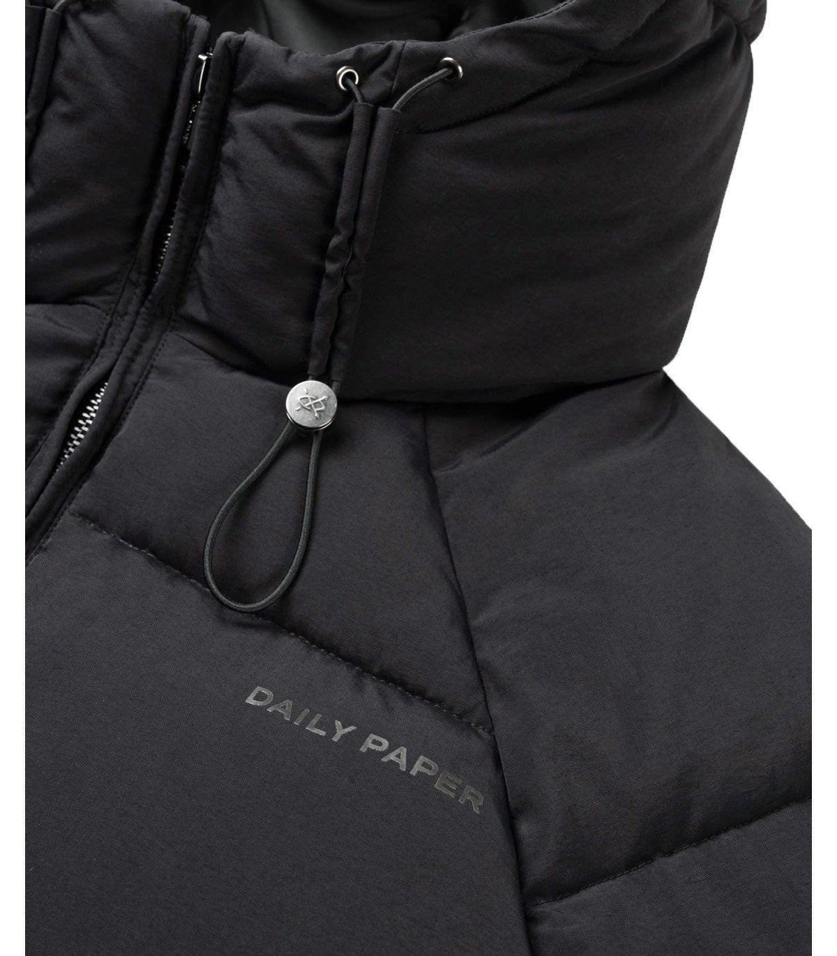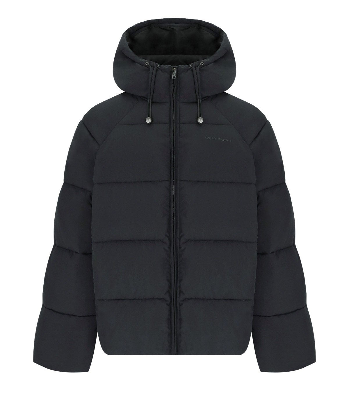 Relaxed puffer jacket by Daily Paper made of nylon in black color. Characterized by a zip closure, it features a front logo print. Equipped with a hood, it has long sleeves. Regular fit. Outer composition: 100% nylon. Inner lining: 100% polyester.