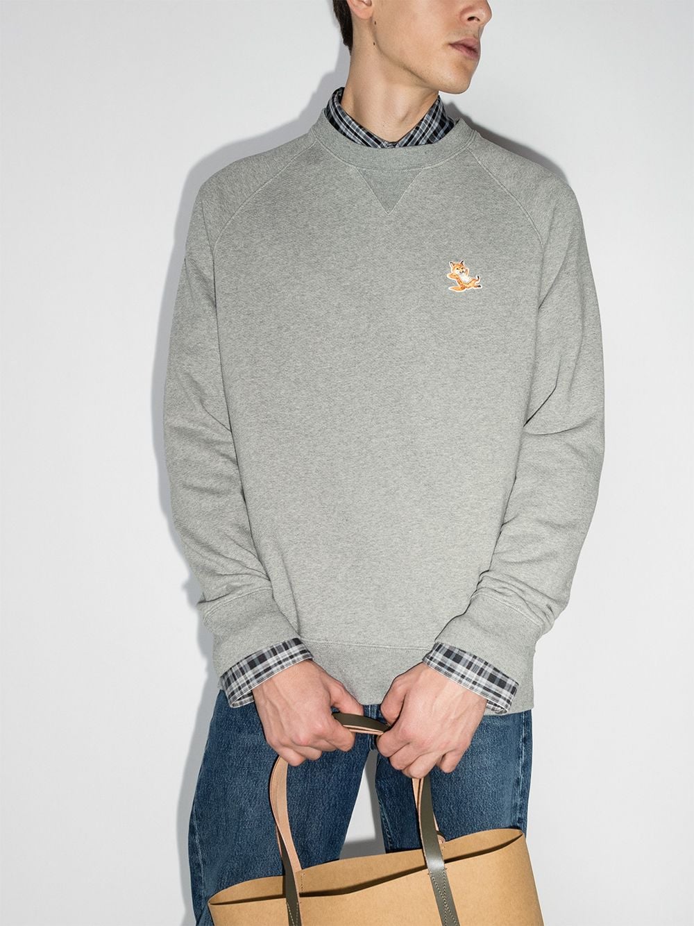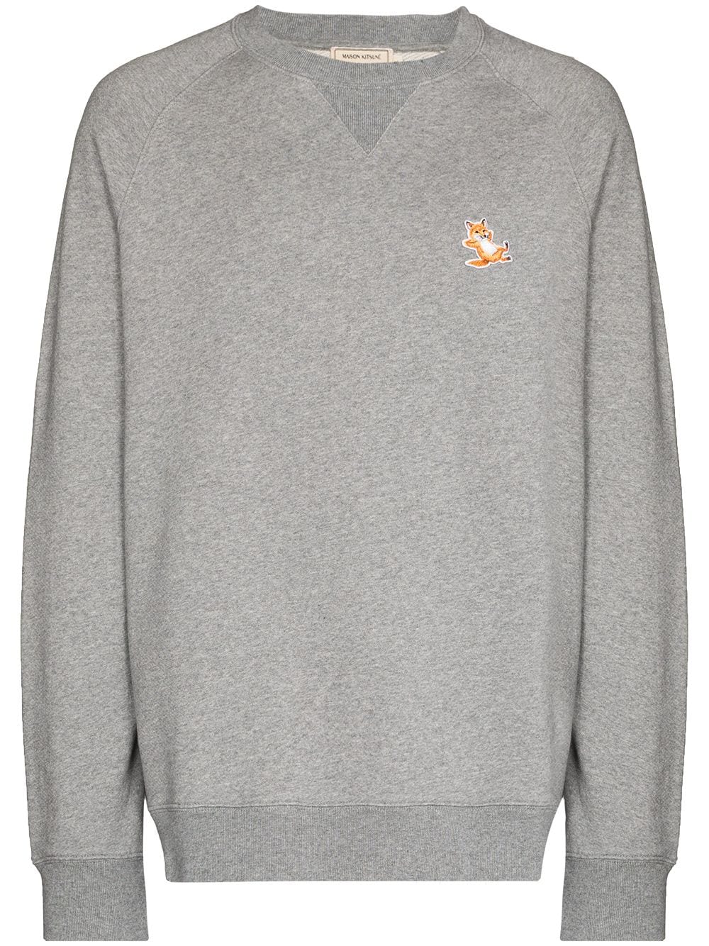 Pale grey cotton Chillax Fox patch sweatshirt from MAISON KITSUNÉ featuring logo patch to the front, round neck, long sleeves, ribbed cuffs and ribbed hem.