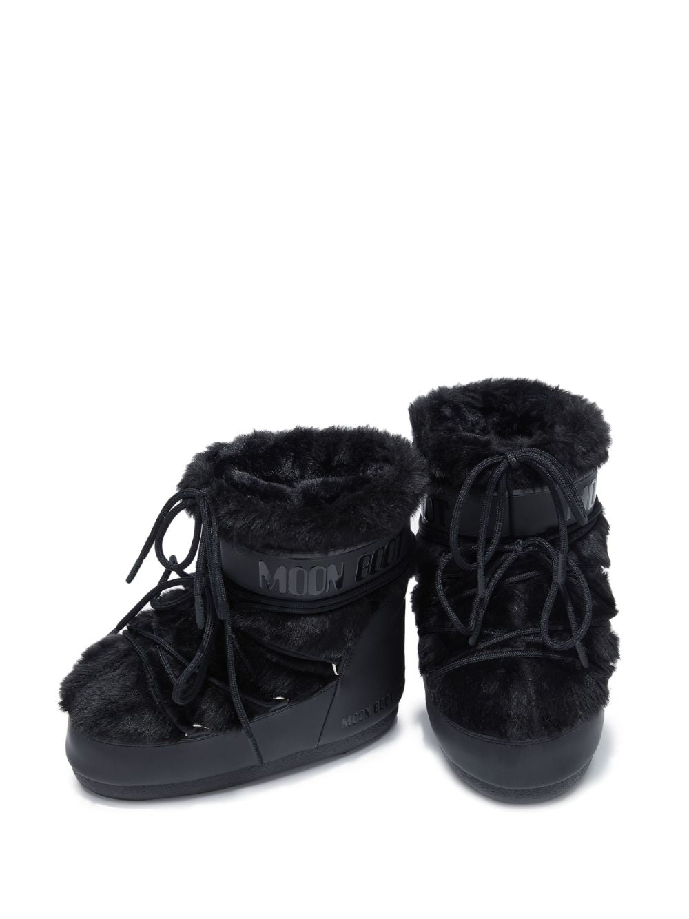 Black, faux fur trim, front lace-up closure, logo on the heel and non-slip rubber sole.