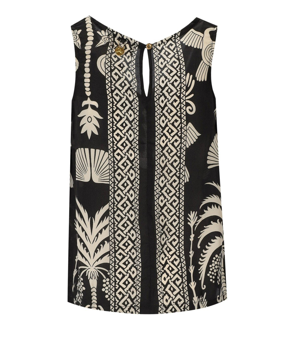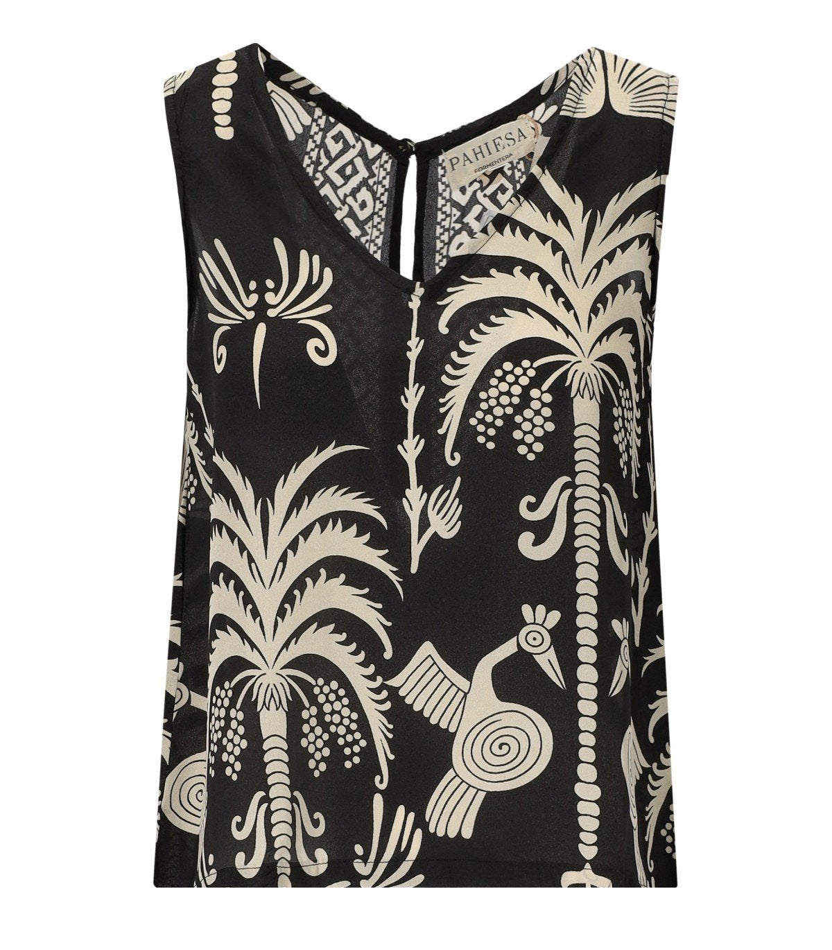 Pahiesa Formentera top made of black silk with a contrasting tropical print. V-neckline and button at the back. Loose fit. Composition: 100% silk.