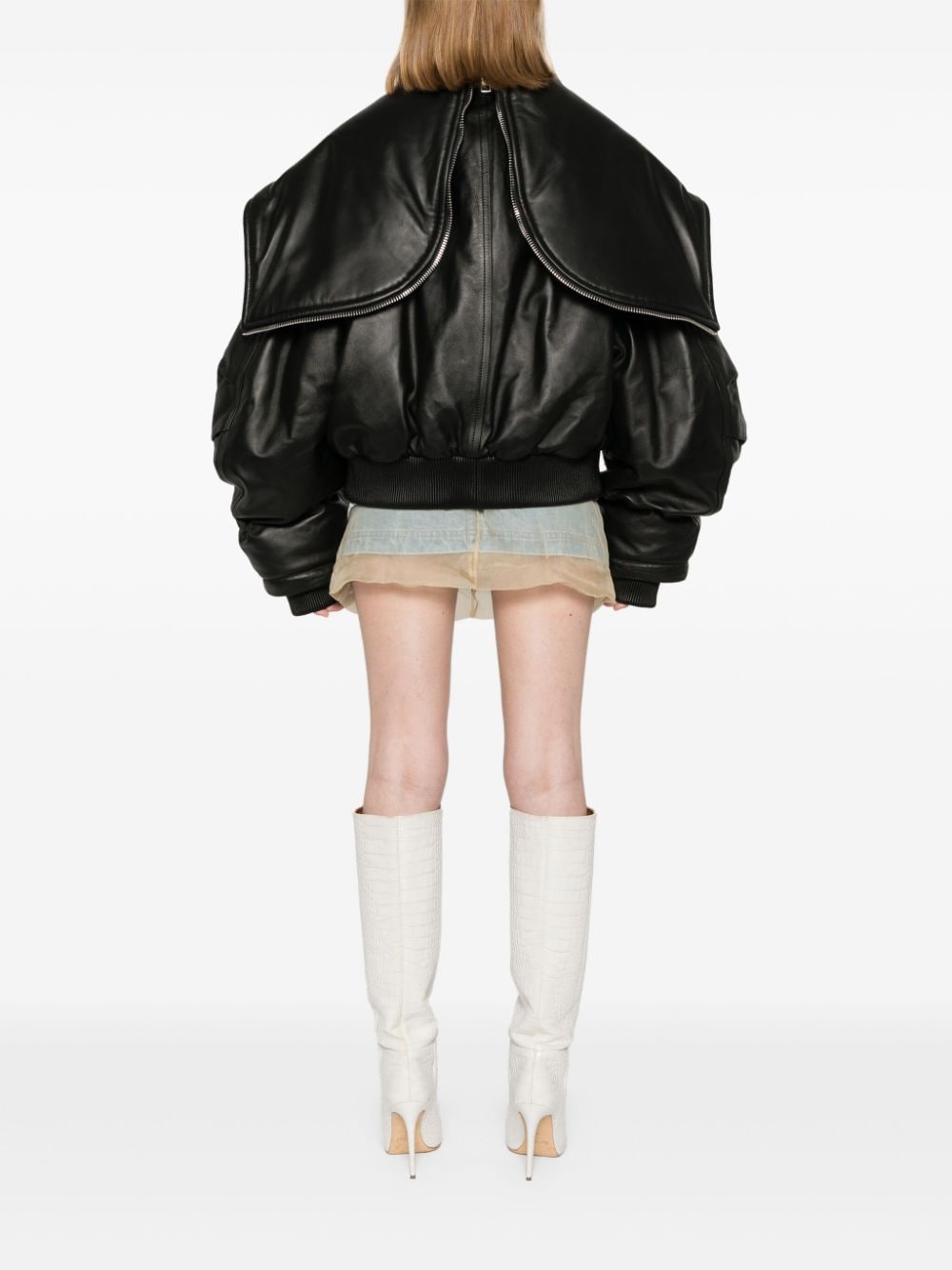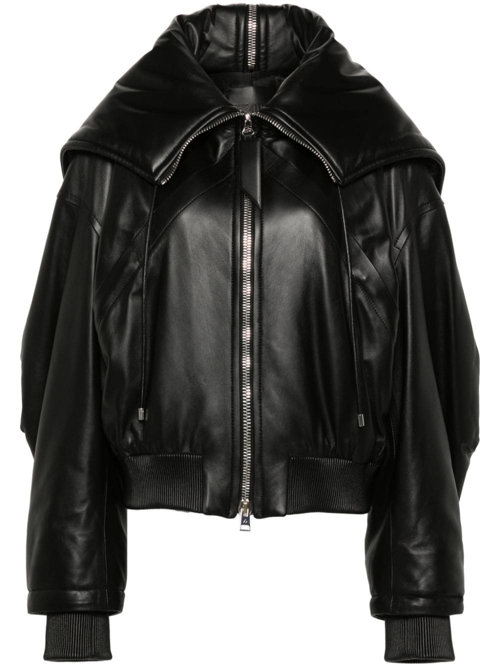 black lambskin padded design oversize collar drawstring zip-up hood drop shoulder long sleeves with ribbed cuffs front zip fastening pockets ribbed hem cropped silver-tone hardware front two-way zip fastening