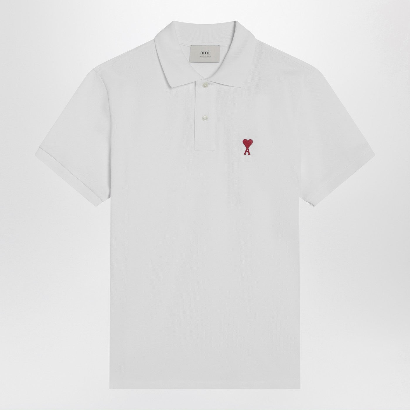 White organic cotton Ami Paris polo shirt featuring short sleeves, Ami de Coeur embroidery on the chest, buttons on the front and side vents.