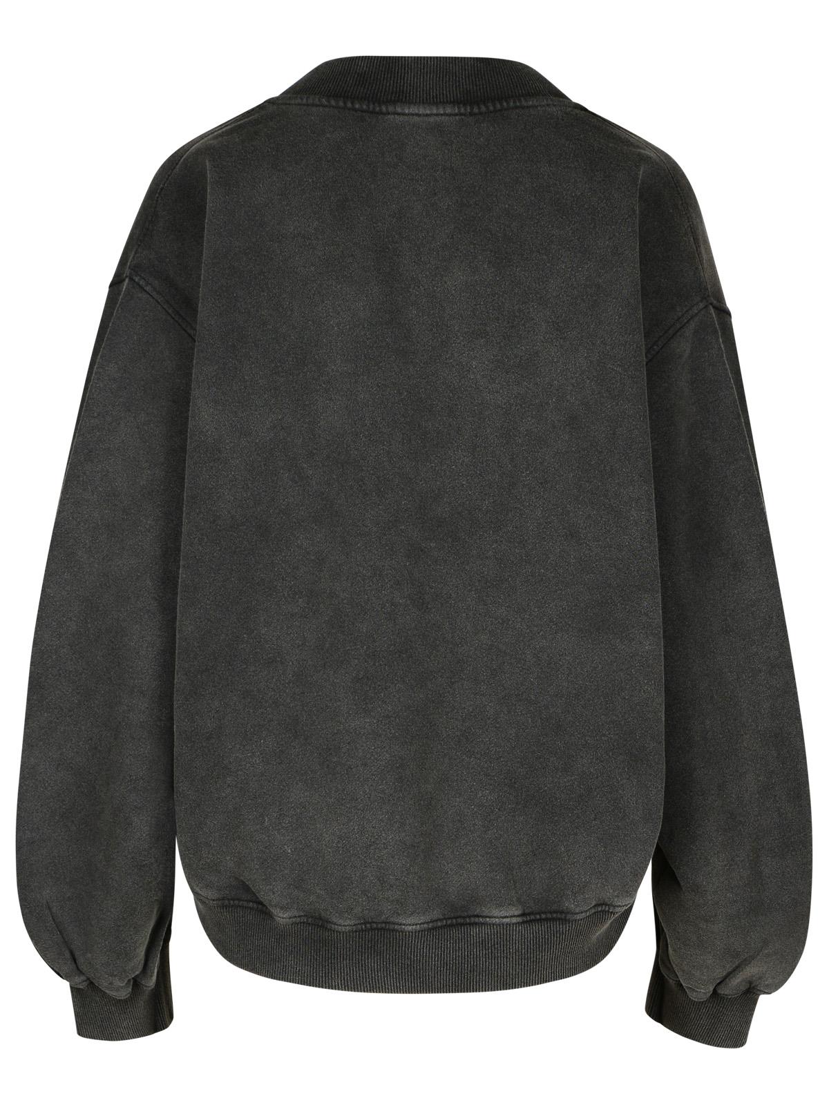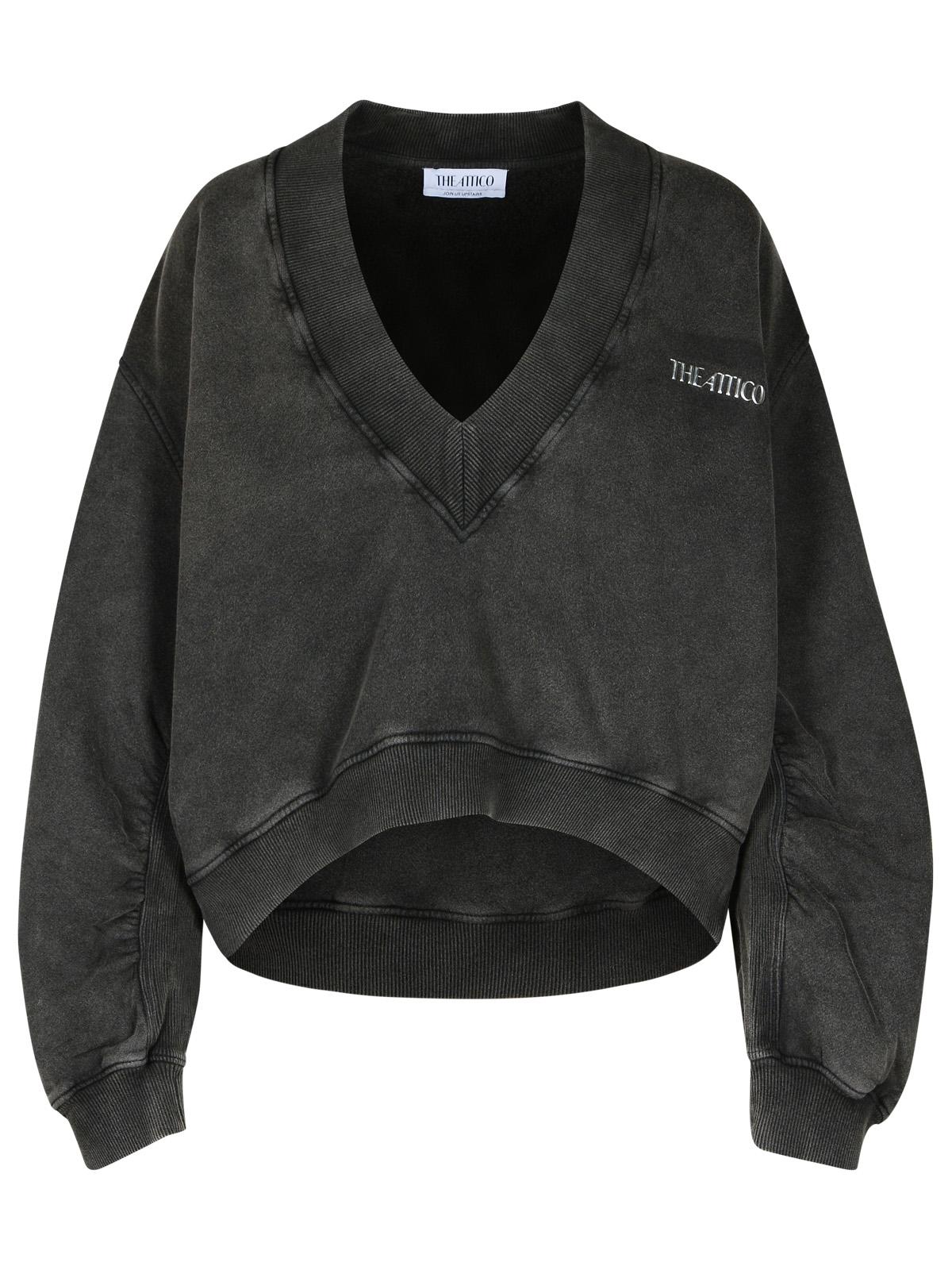 'V' neckline, contrasting front logo, ribbed cuffs and hem, asymmetric hem