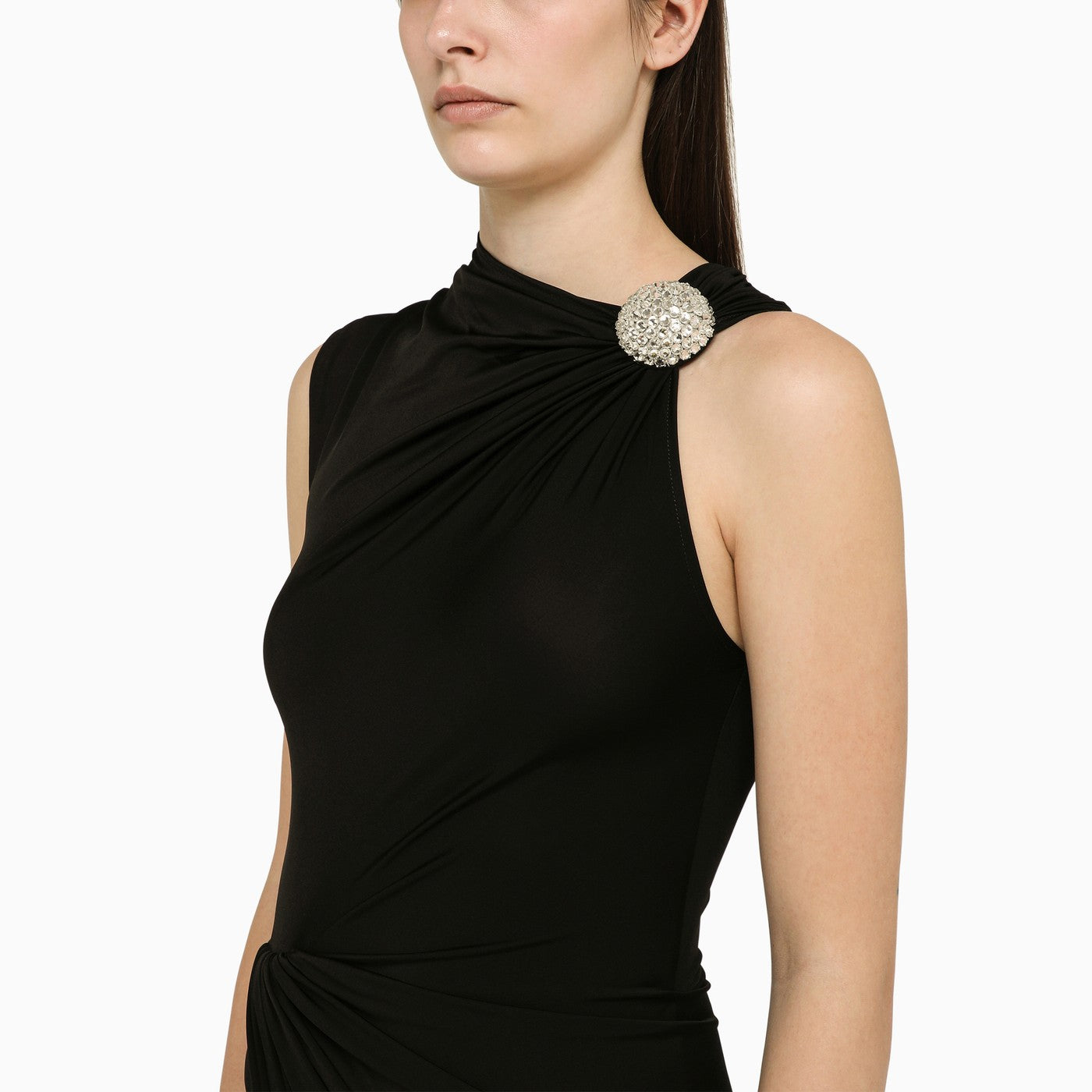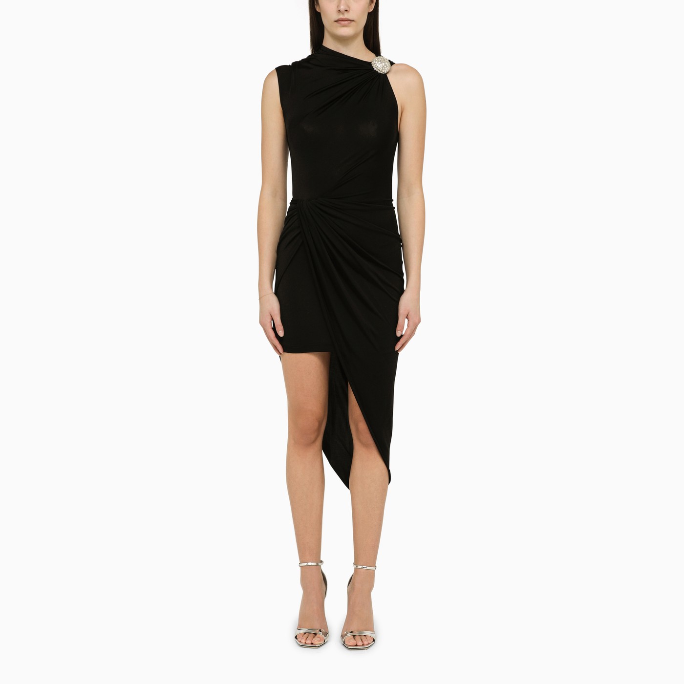 Black jersey midi dress from David Koma featuring an asymmetrical design, front draping, a crystal ball at the shoulder and a back zip fastening.