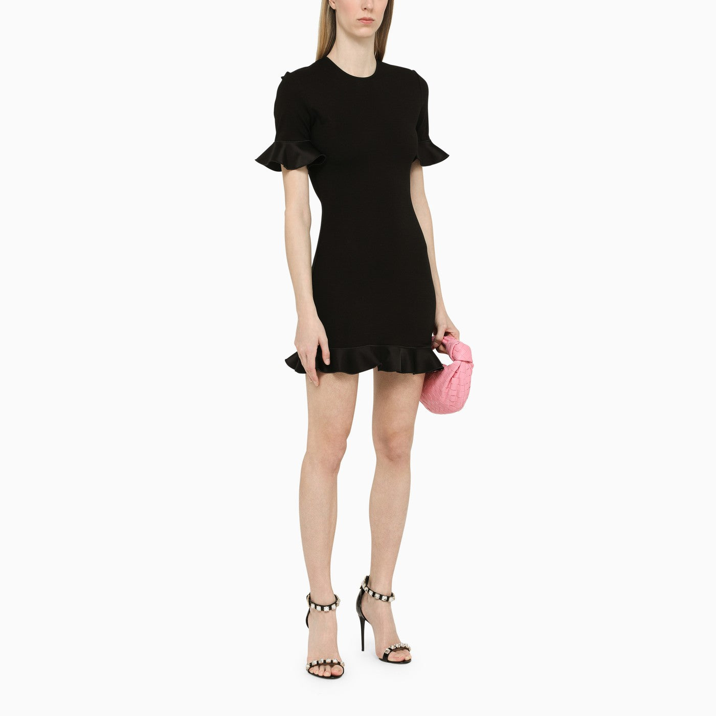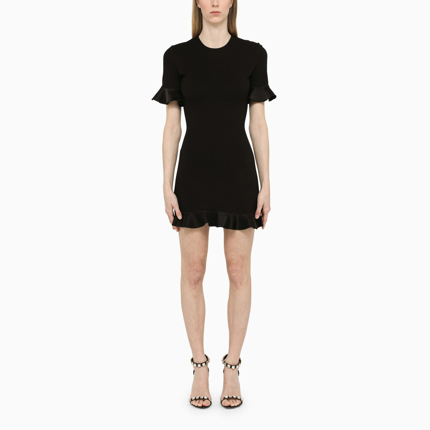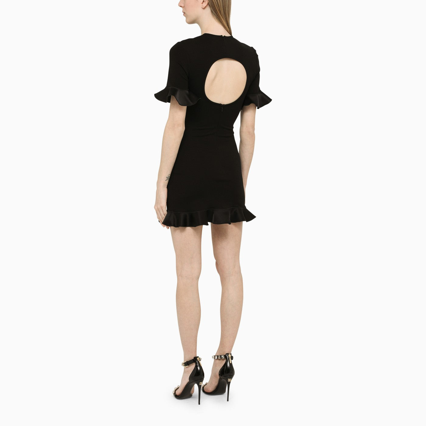 Black David Koma mini dress featuring a round neckline, decorative ruffles and cut-out detail on the back.