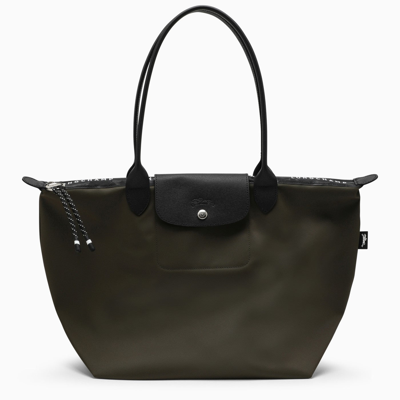 Bag in recycled khaki fabric by Longchamp, with two top handles and leather details. Foldable model.