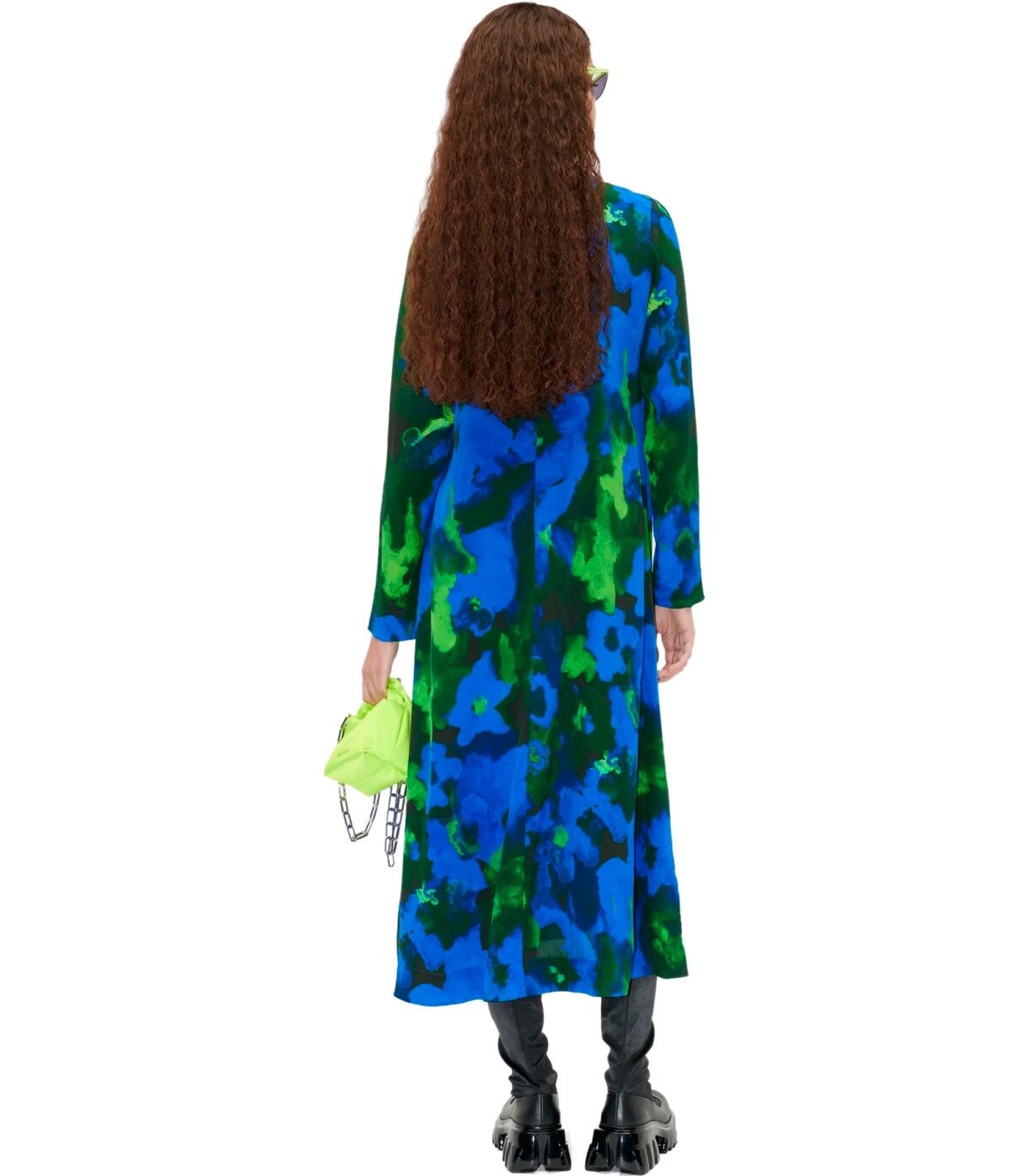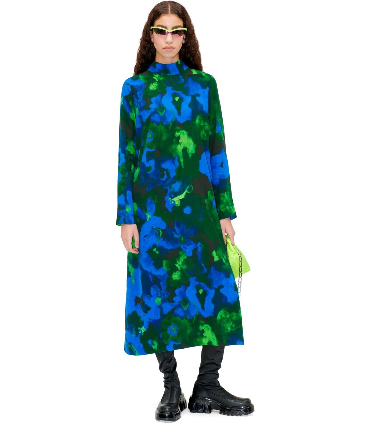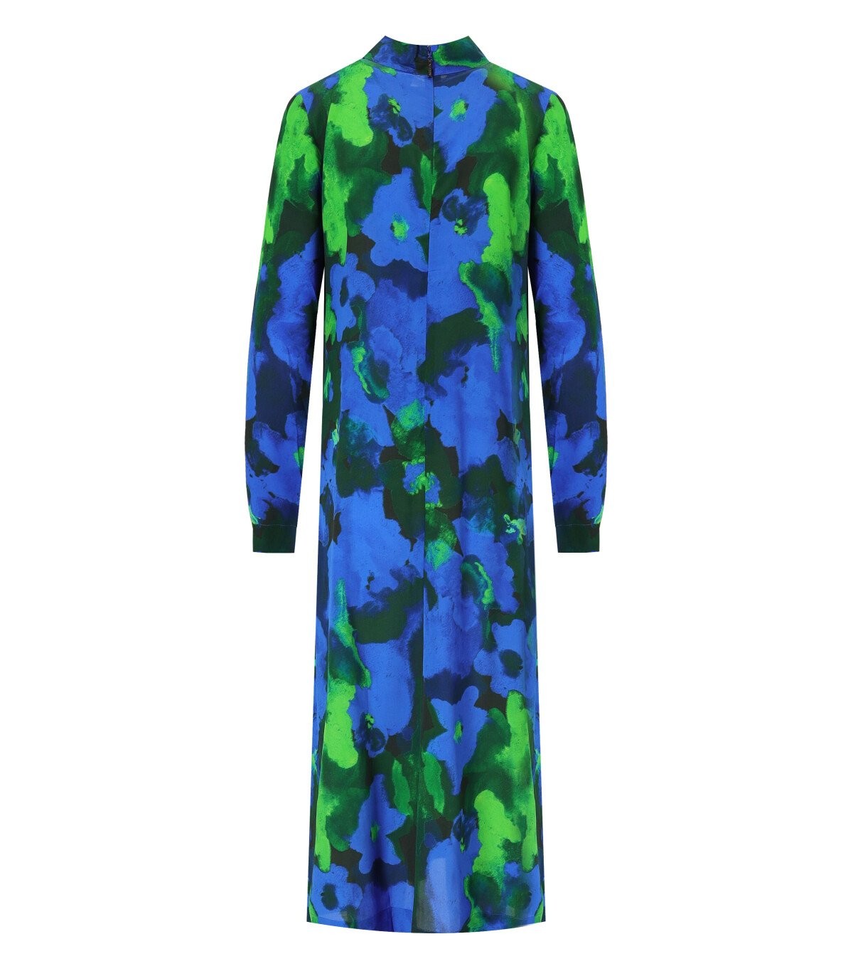 Millie dress by Stine Goya made of silk blend viscose with a watercolor effect floral pattern in shades of blue and green. Zip closure on the back. Long sleeves, relaxed fit. The model is 176 cm tall and wears size XS. Depending on the cut of the fabric, the pattern may vary slightly from item to item. Composition: 70% viscose, 30% silk.