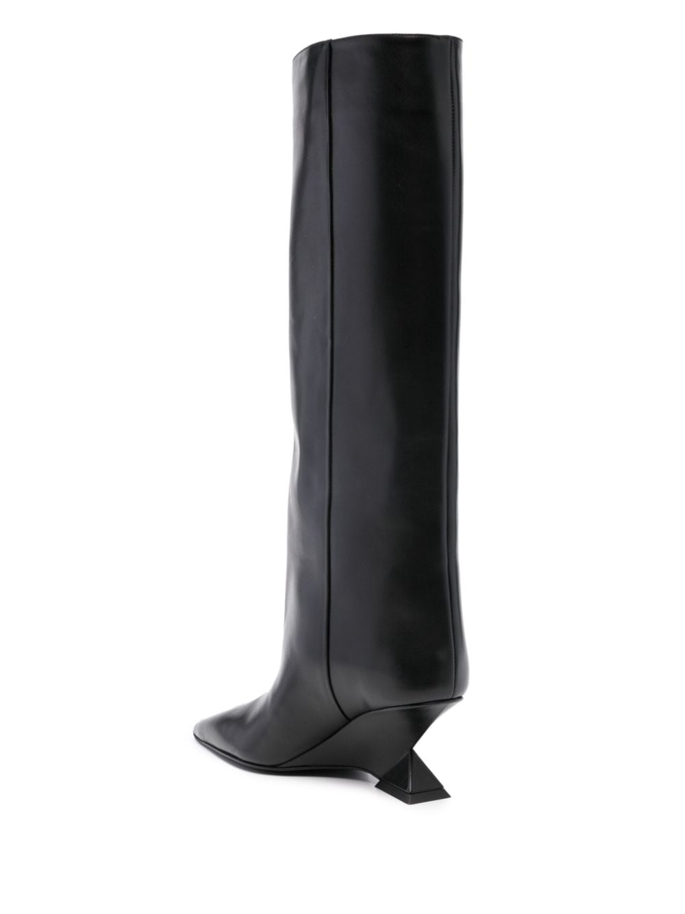 black calf leather pointed toe knee-length branded insole mid sculpted heel leather sole pull-on style