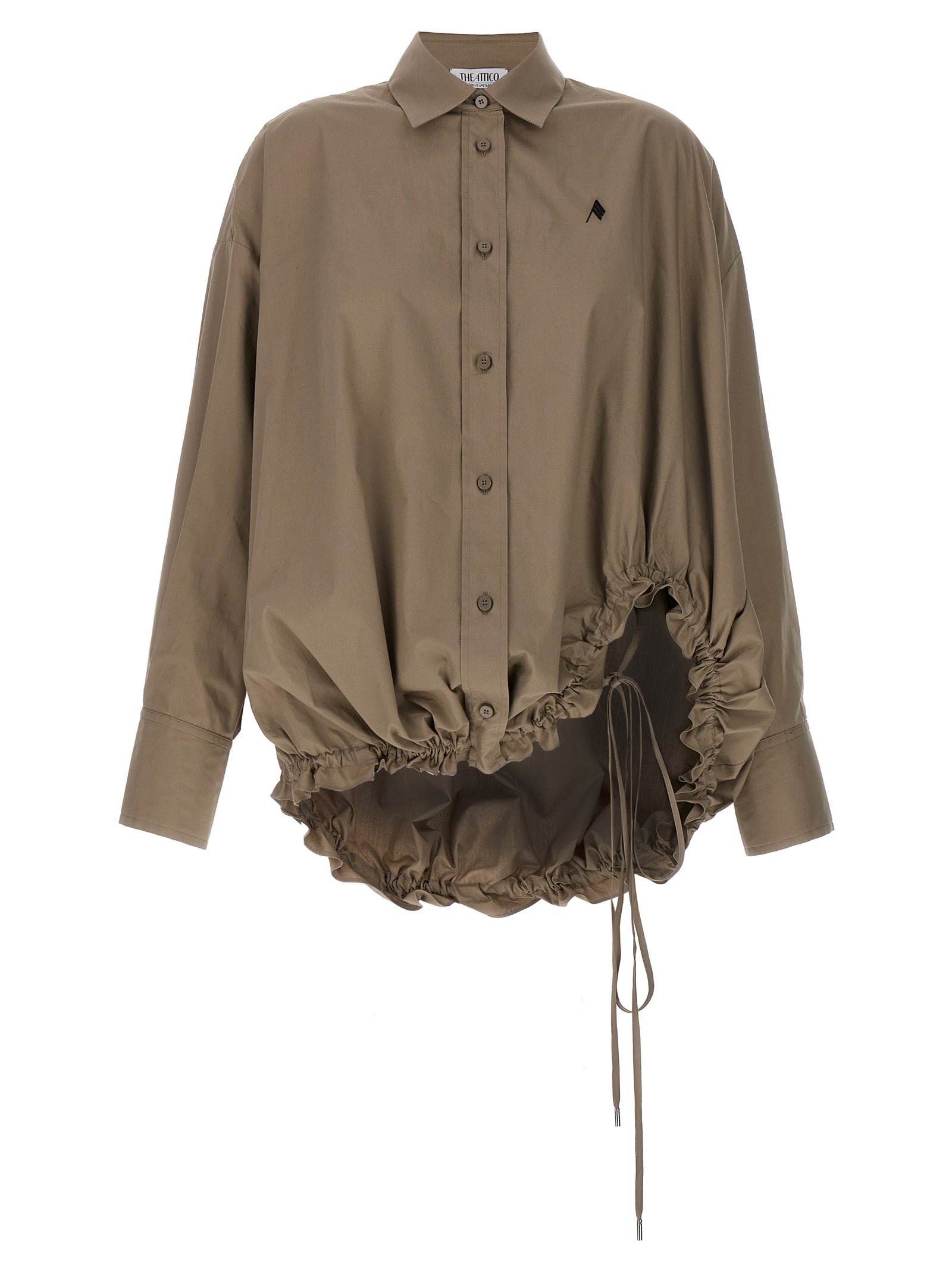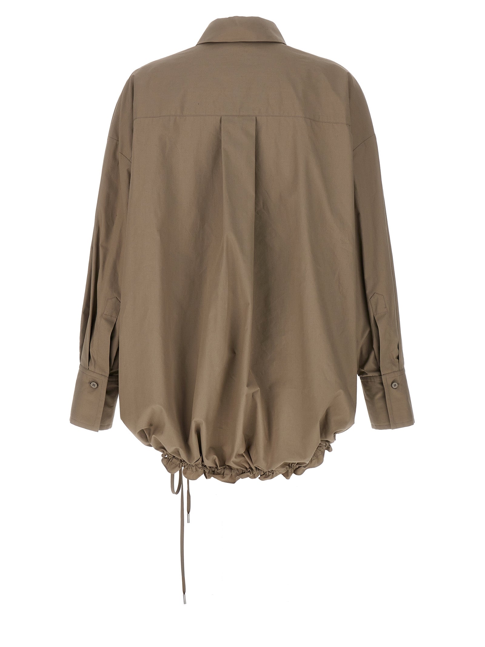 Cotton shirt with drawstring on the bottom hem, button closure, logo embroidery.